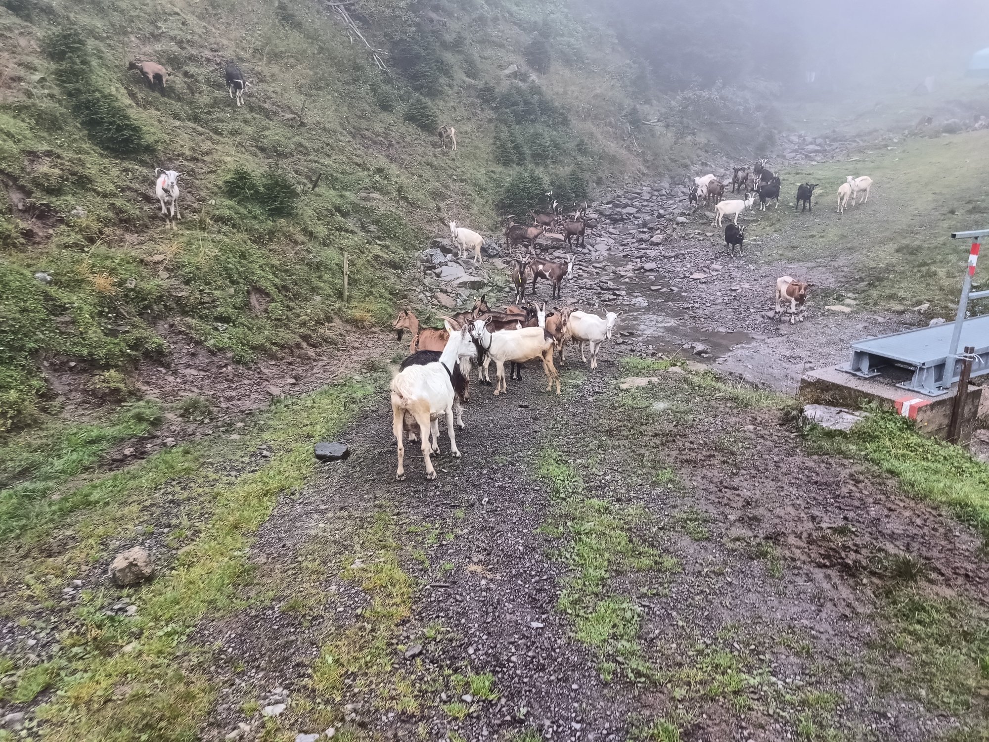Pressé de démarrer je suis le premier au petit déjeuner, avant même son ouverture officielle. Je prévois en effet une grosse journée, car je souhaite arriver au minimum au col routier du Plöckenpass, ce qui suppose un dénivelé assez conséquent et un premier passage au-dessus de 2000m. La tartine au beurre local engloutie, je me mets en route a 7h15 pour une première montée de 300 mètres à la fraîche, en direction de la Zollnersee. En lieu et place de l’itinéraire officiel qui suit une piste carrossable, j’opte pour un plus sympathique sentier alternatif qui part de derrière la ferme. Celui-ci longe d’abord l’étable des chèvres, et le moins que l’on puisse dire c’est que ce n’est pas vraiment l’endroit ou il faudrait se promener avec de jolis mocassins. Ici démarre ce que je nommerai ensuite “la journée de la bouse”.