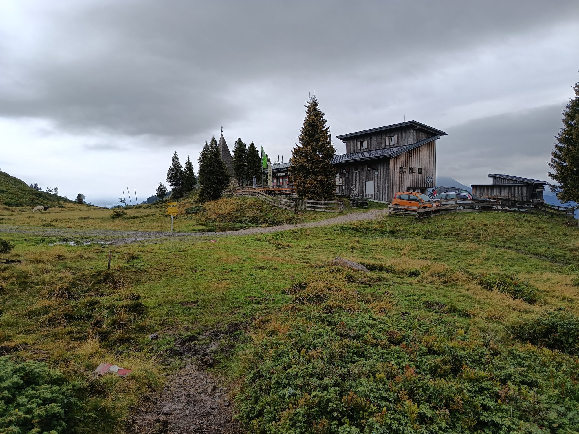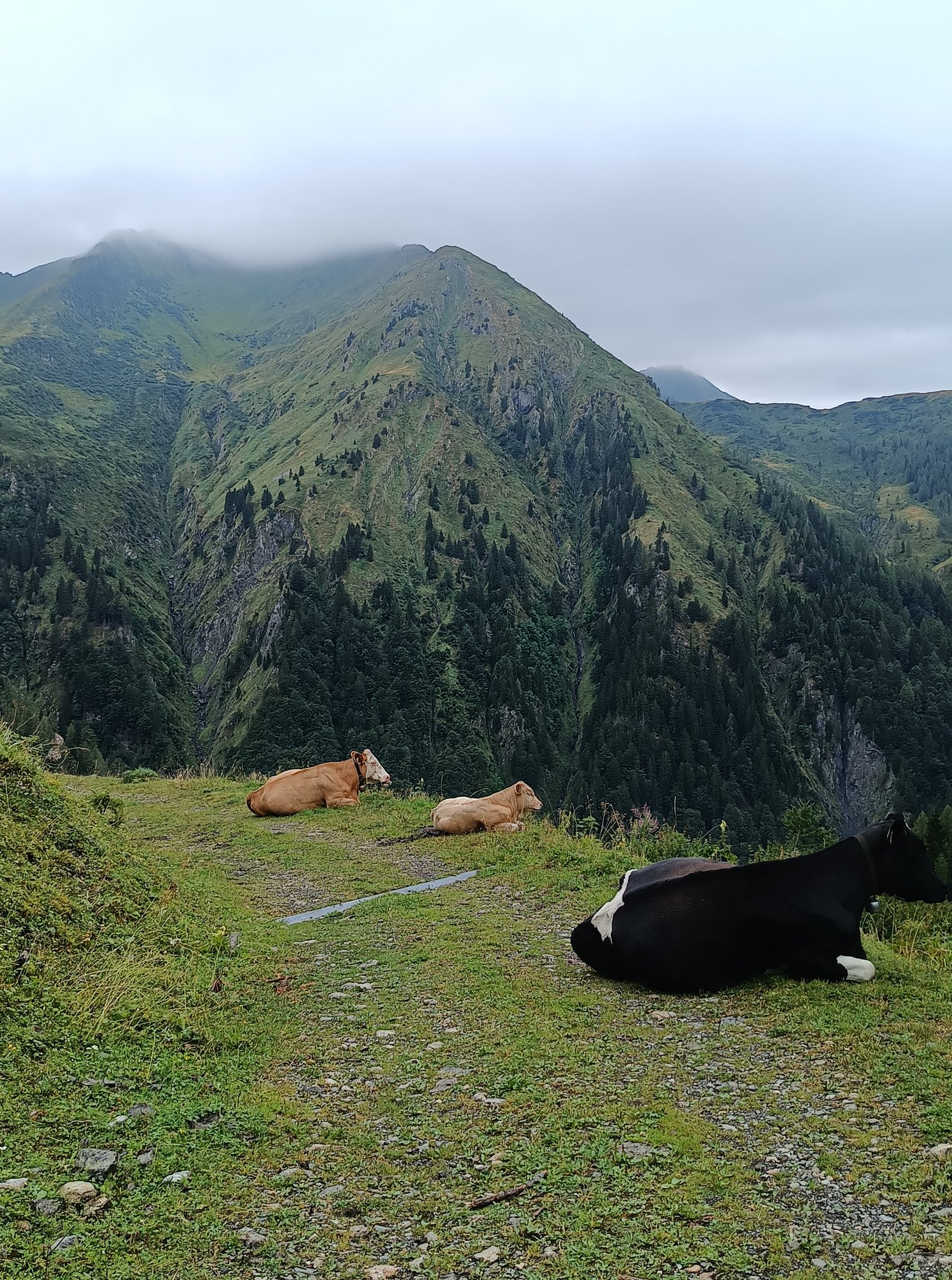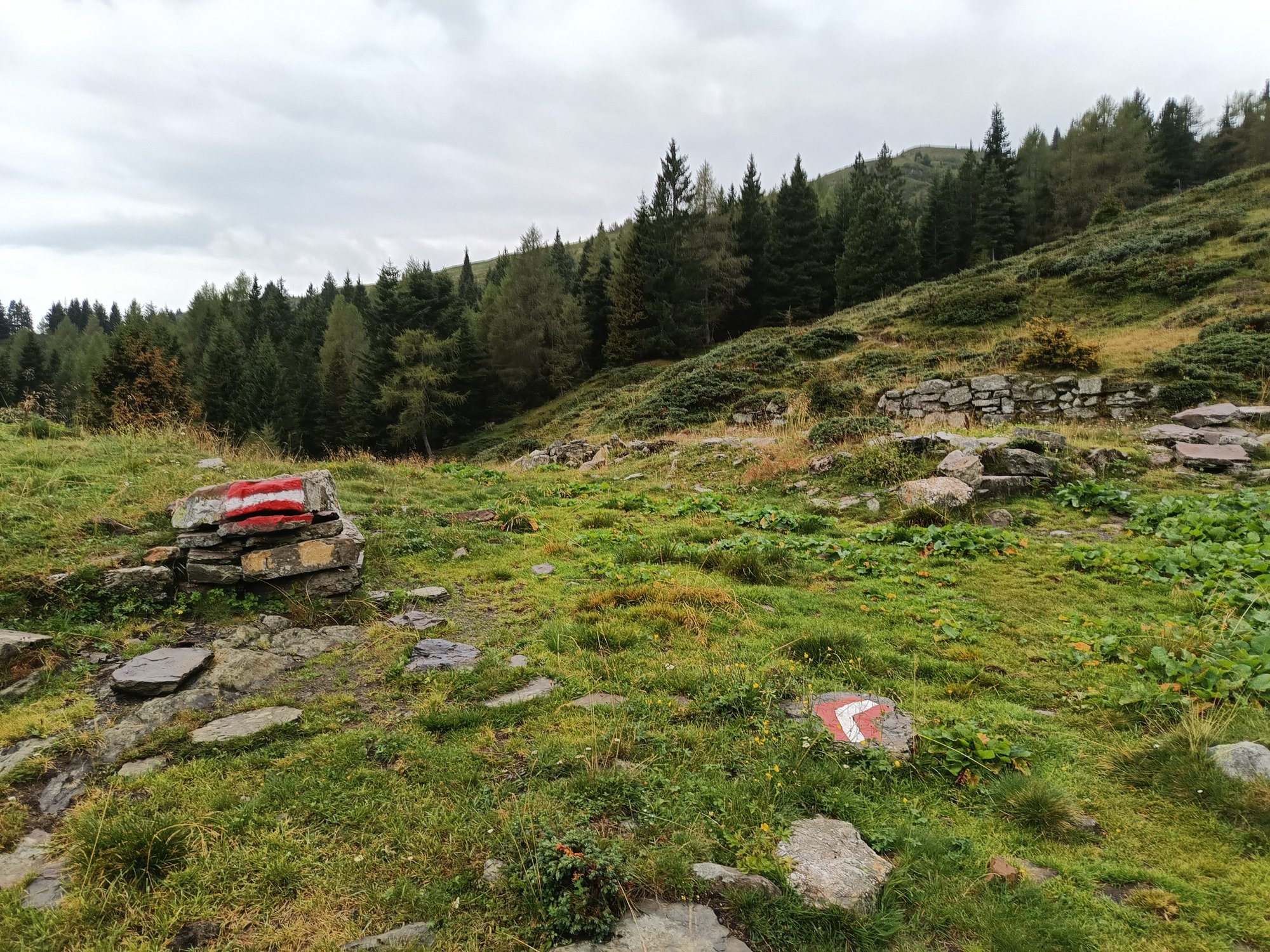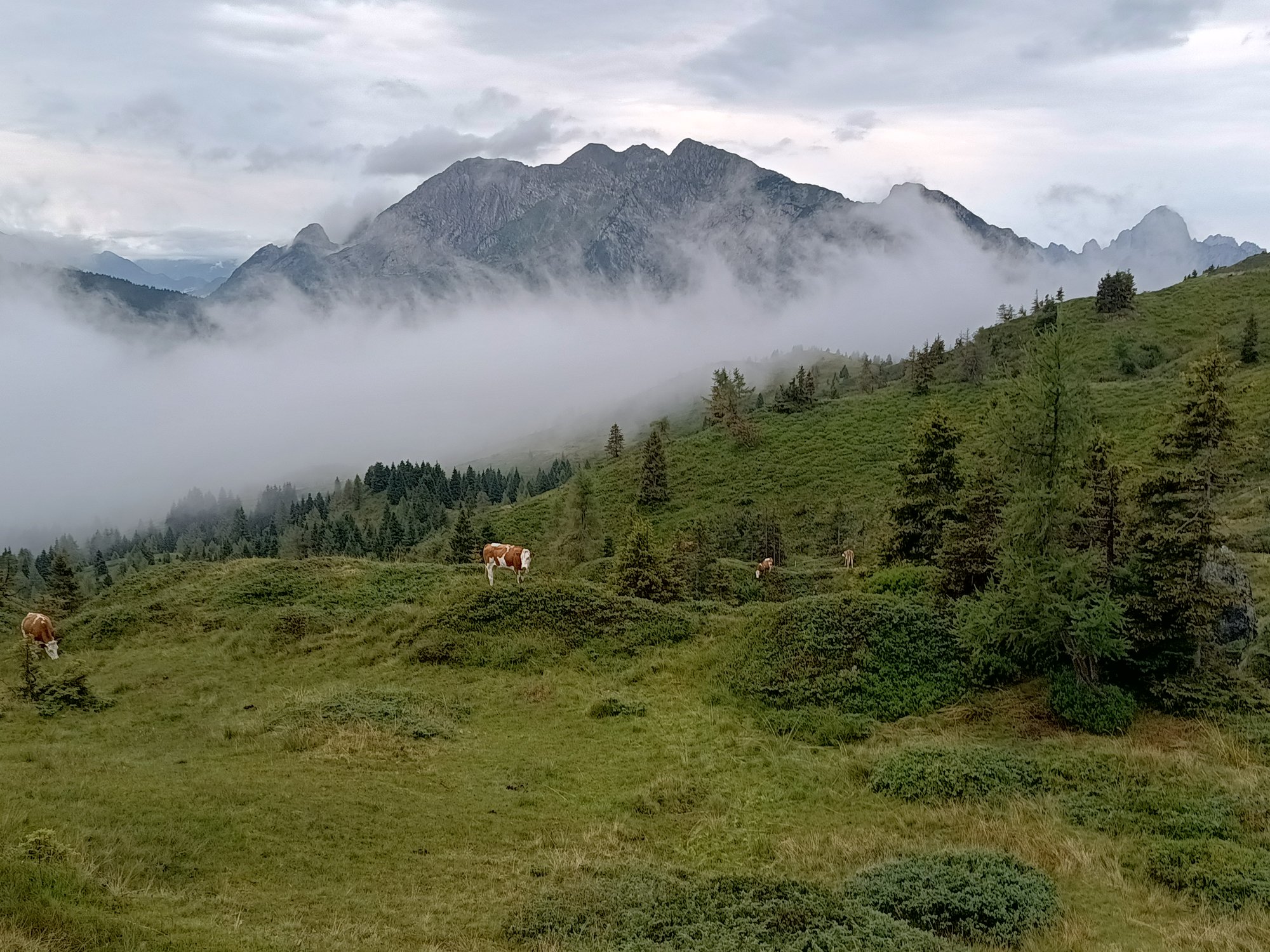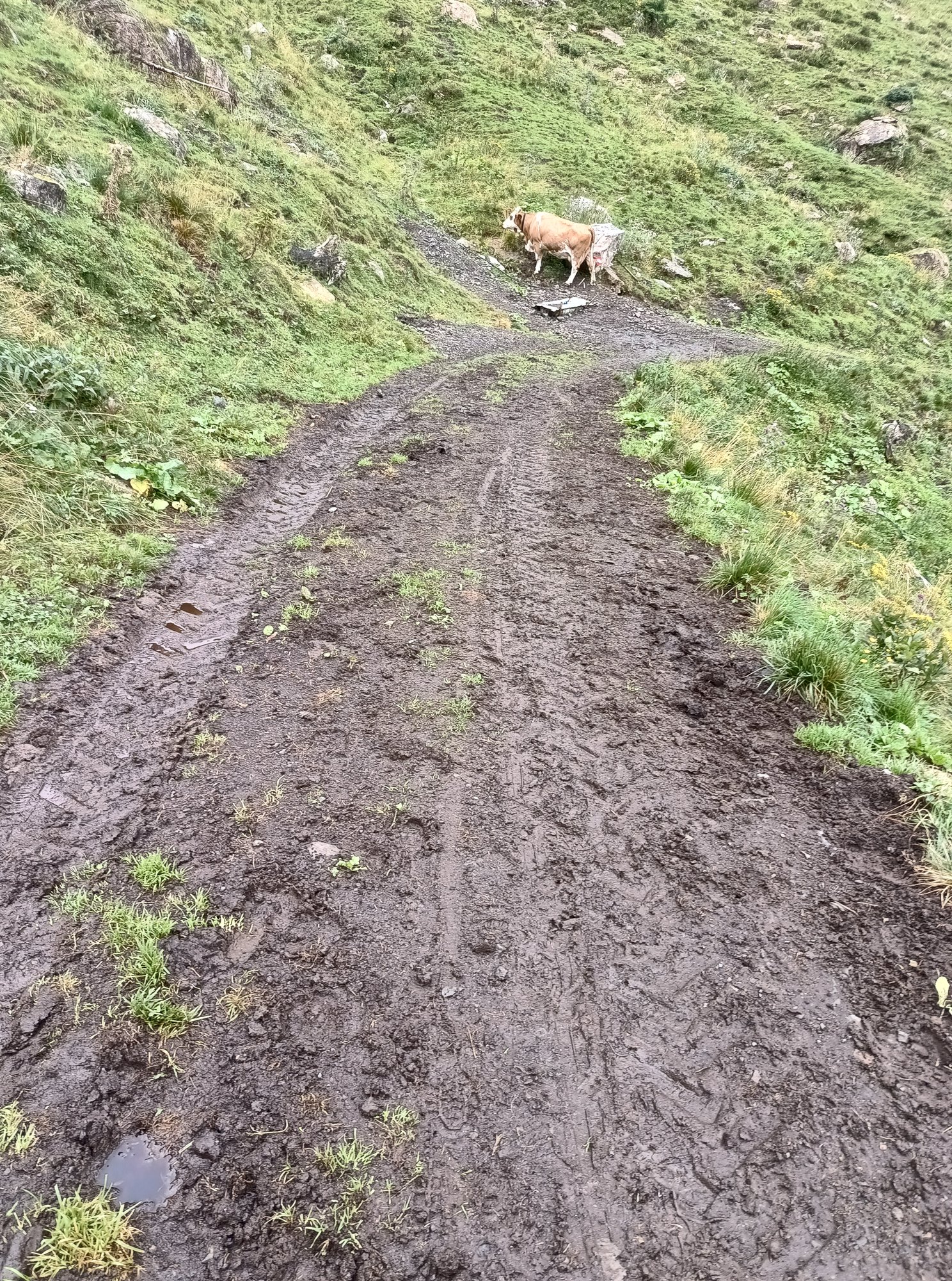 Requinqué par mon jus d’orge, je repars en suivant le balisage de la Kärntner Grenzweg alias Via Alpina 20 alias Karnischer Höhenweg 403, autant d’appellations alors que tous les chemins mènent à Rome. Je descends de 200 mètres et traverse la cour d’une “Alm” dont le nom ne figure pas sur la carte. C’est mignon et ca ressemble à un petit snack, ou bien peut-être un gîte de vacances à la location, mais je ne peux le confirmer car en cette heure matinale c’est fermé et je n’y vois personne. L’itinéraire m’envoie ensuite sur la piste carrossable qui rejoint cette bâtisse par l’autre côté· Enfin quand je dis carrossable, je souhaite bien du courage au prochain qui voudra la carrosser. Le chemin est envahi par les vaches (que je dois éviter en essayant de passer le moins près possible car on ne sait jamais), et couvert par leurs déjections qui par endroits se sont mêlées a la boue.