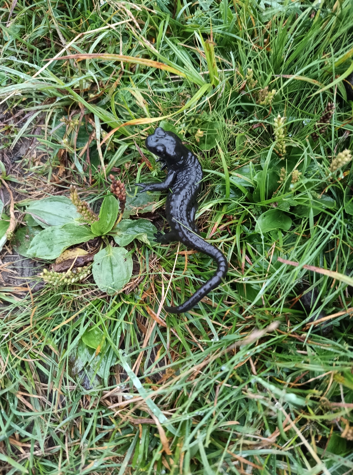 En plein milieu du chemin je croise alors la première équipe de poseurs de crottes, qui répondent à mon salut en bêlant, puis m’élance a travers de vastes prairies d’herbe détrempée (puisqu’il faut bien nettoyer ses pieds avant de les salir à nouveau). Une petite grimpette m’amène devant les ruines de “Hohenlager Straniger Alm”, qui comme son nom l’indique était l’ancien bâtiment de “stockage du haut” (quelques termes d’allemand n’ayant aucun secret pour moi, exemple: “Ein lagerbier bitte”). La pente se fait ensuite plus raide et dans les lacets je manque d’écraser un curieux animal. Je peux cette fois formellement l’identifier comme étant une salamandre noire. A quelques mètres de là j’en observerai deux autres exemplaires, brillants comme s’ils venaient juste d’émerger d’une cuve de pétrole.