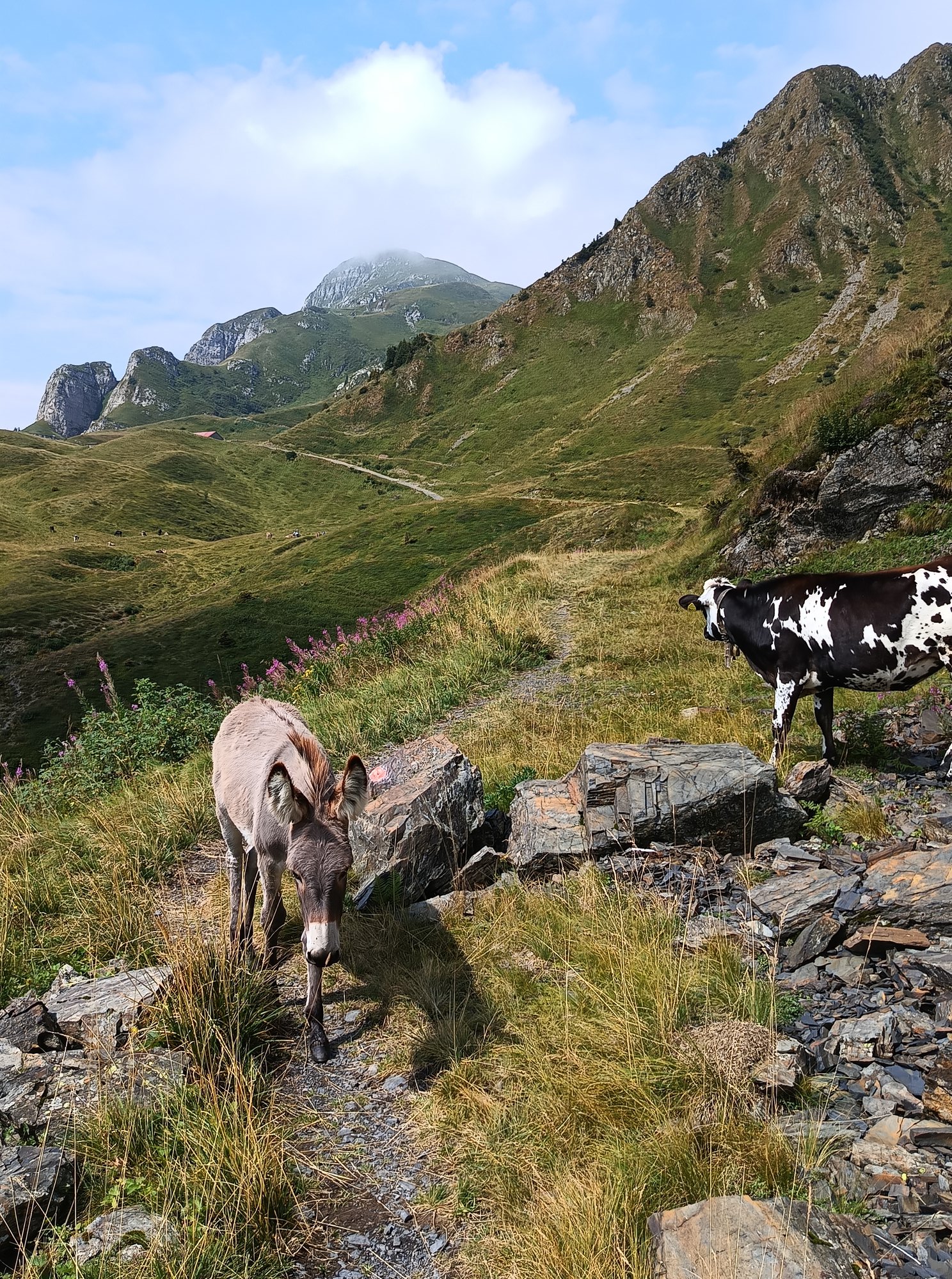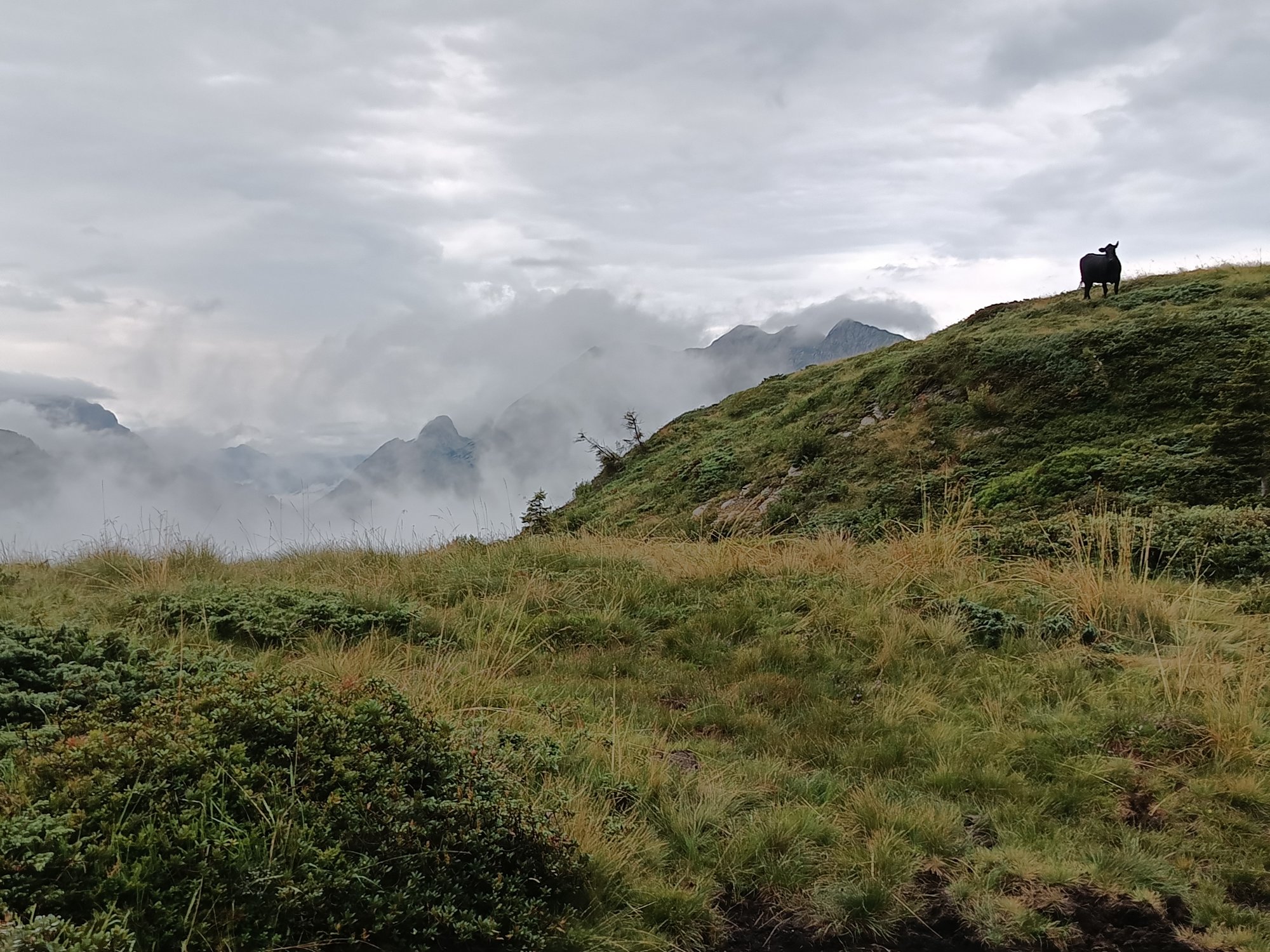 Alors que j’approche d’un col sans nom qui débouche sur la vallée suivante, le bestiaire s’agrandit encore avec la présence de nombreuses vaches. Celles-ci confèrent une certaine photogénie au paysage, pourtant déjà superbemment dramatisé par les nuages qui recouvrent la vallée ce matin. Au sommet d’un petit promontoire un bovidé noir prend fièrement la pause. Ca y est, après tous ces kilomètres ma quête s’achève: j’ai retrouvé la vachette d’Intervilles.