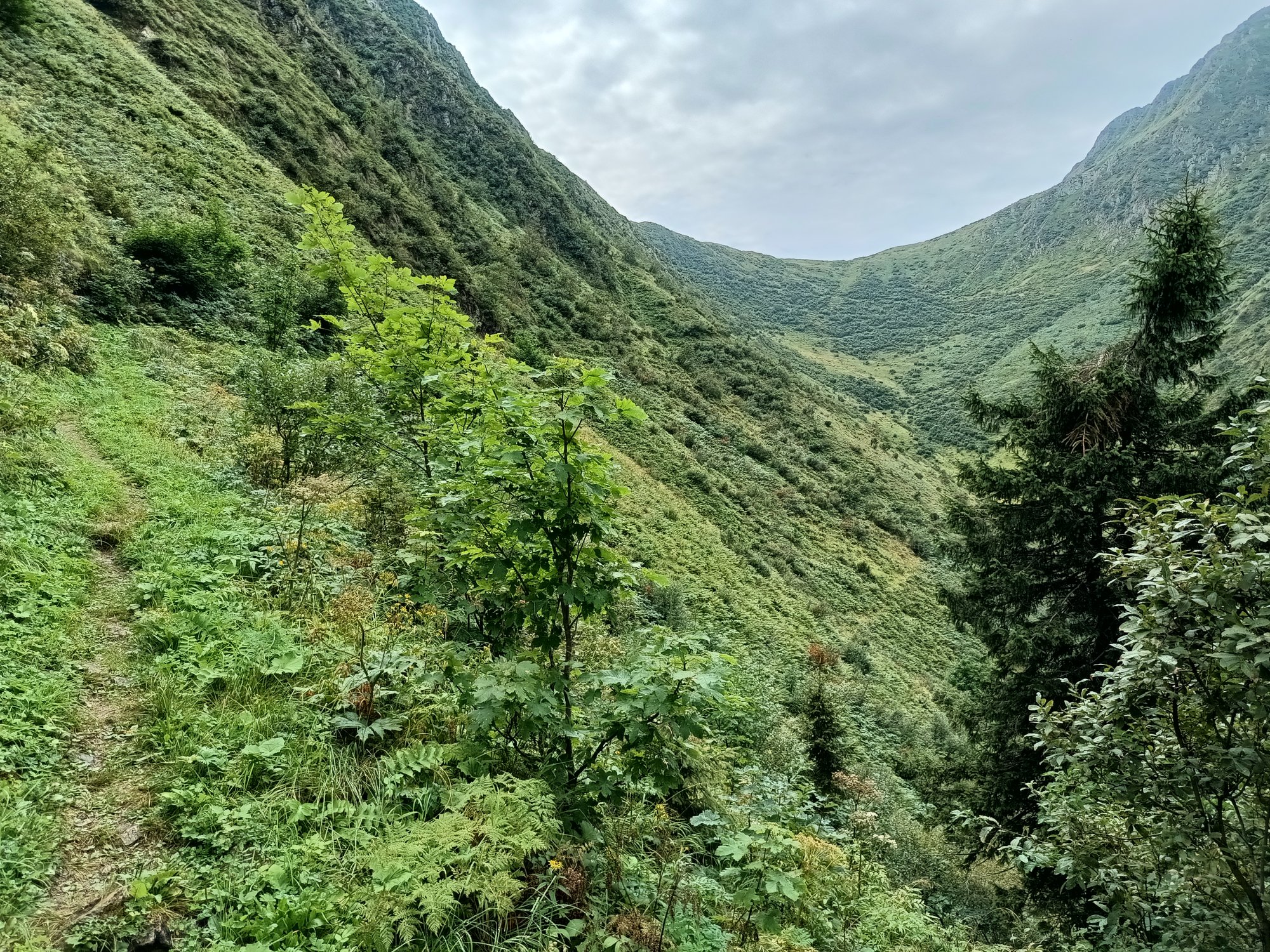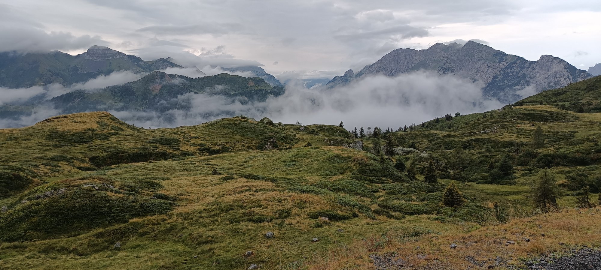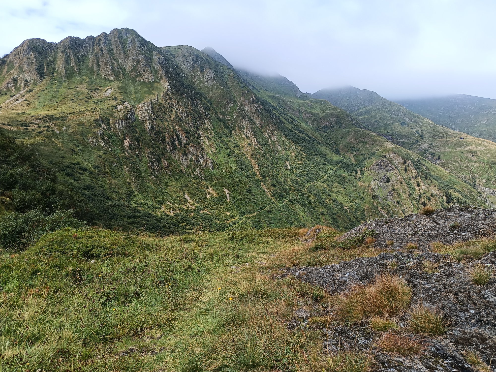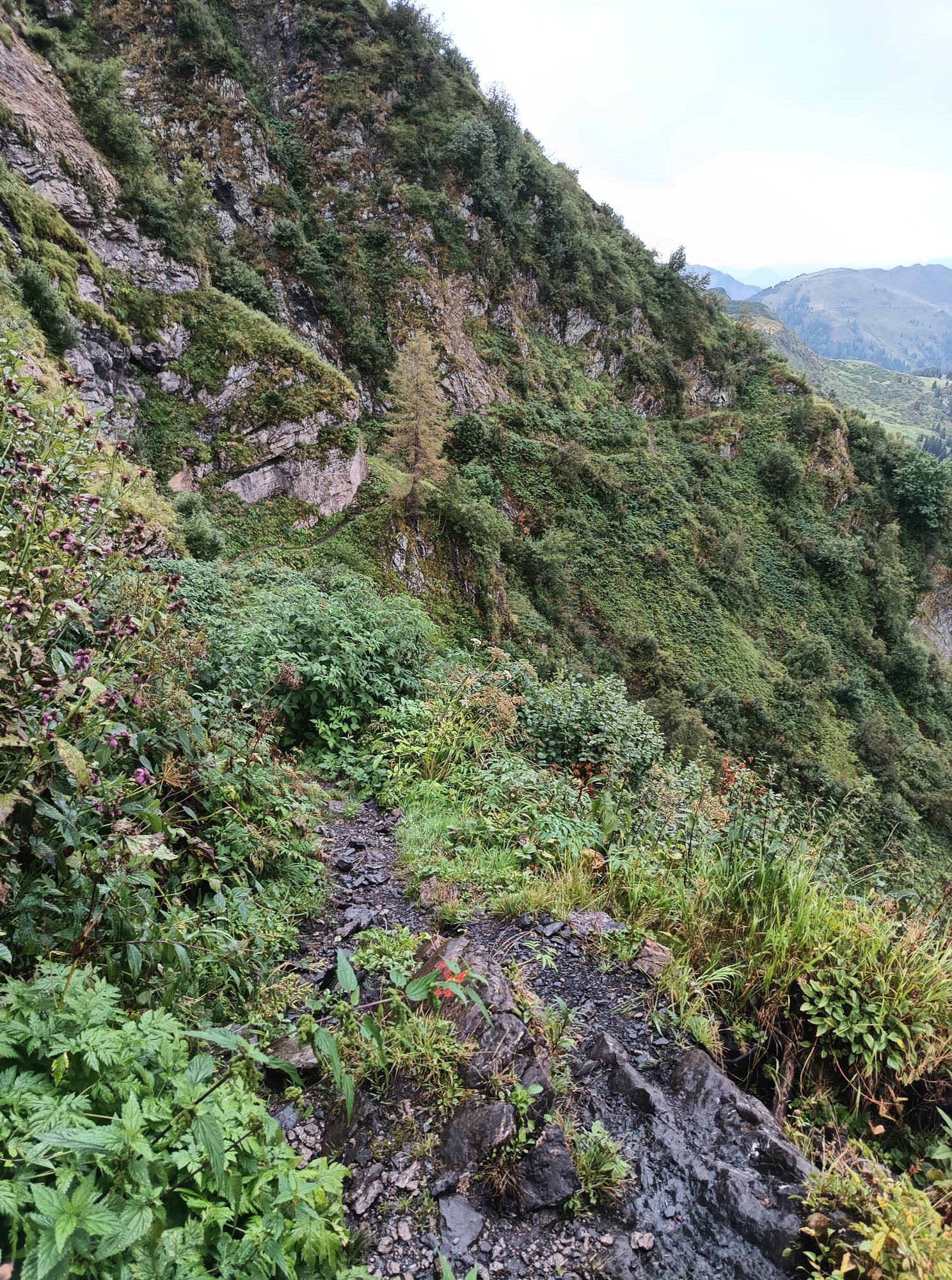 Traversant ces écuries d’Augias je crois en avoir fini lorsque je quitte la piste un peu plus loin. Erreur car derrière le même plat m’est servi, mais cette fois sur une sente irrégulière d’une vingtaine de centimètres de large tout au plus, qui serpente entre les hautes herbes. Même si la boue disparaît peu a peu, les kilomètres suivants seront particulièrement éprouvants en raison de l’étroitesse du chemin et de la végétation luxuriante. Difficile de prendre du plaisir malgré les vues spectaculaires. A en lire les commentaires sur le site de la Via Alpina il semble que je ne suis pas le seul à en avoir souffert. On dirait que ce chemin est très peu emprunté, car sans doute trop loin d’accès en voiture. D’ailleurs je ne croise aucune âme qui vive pendant 2 heures.