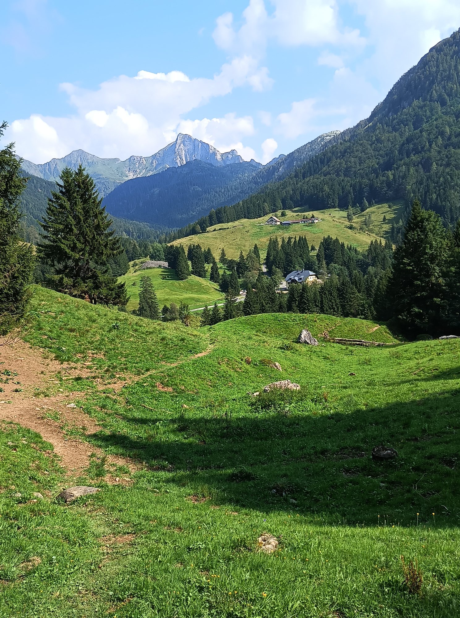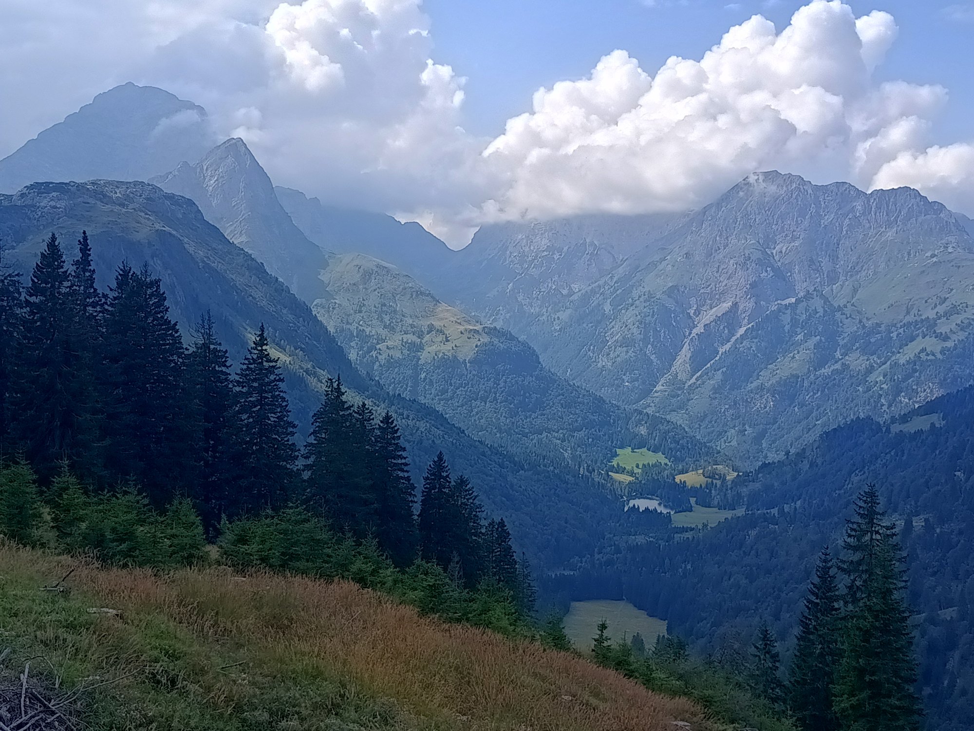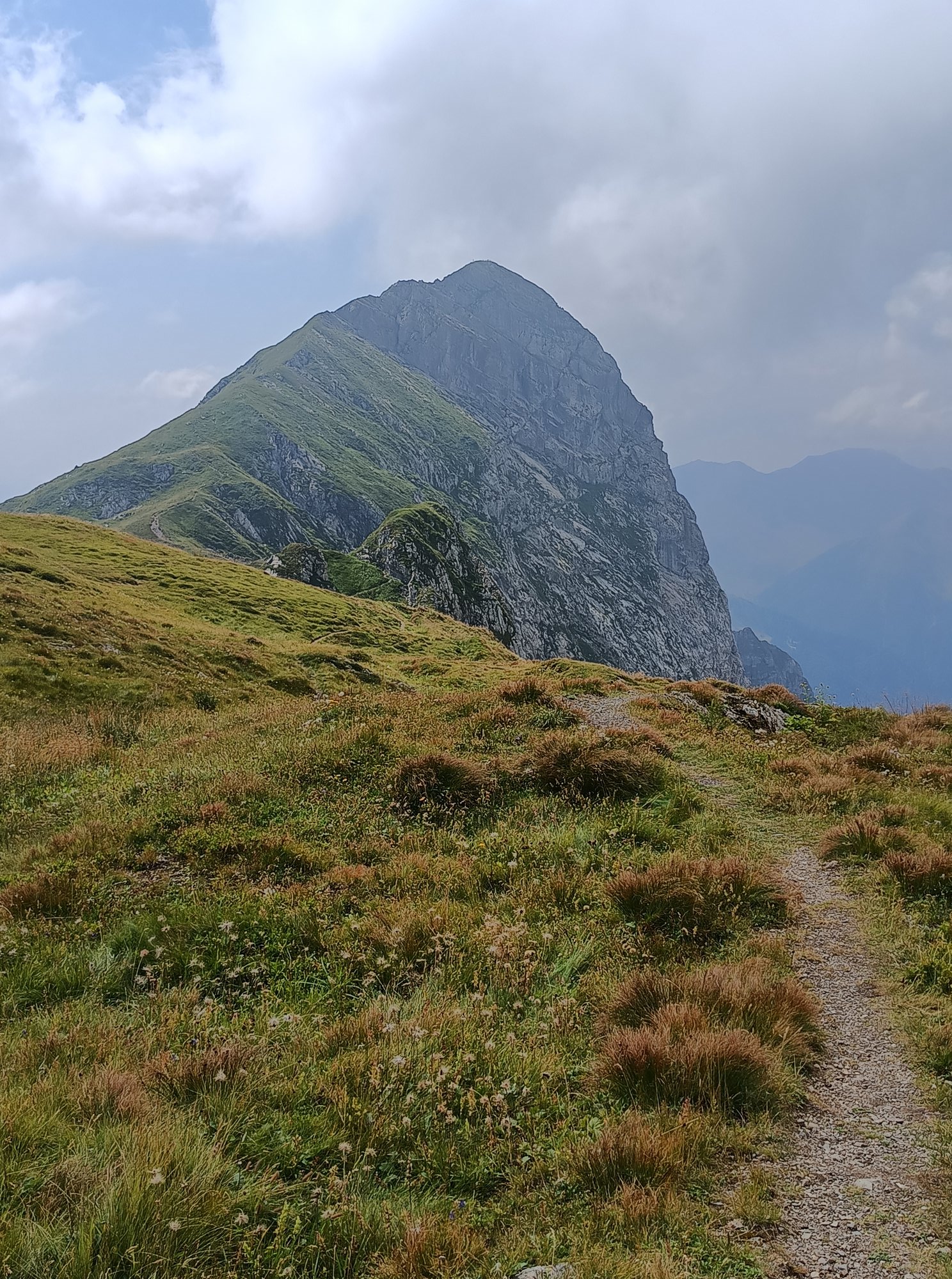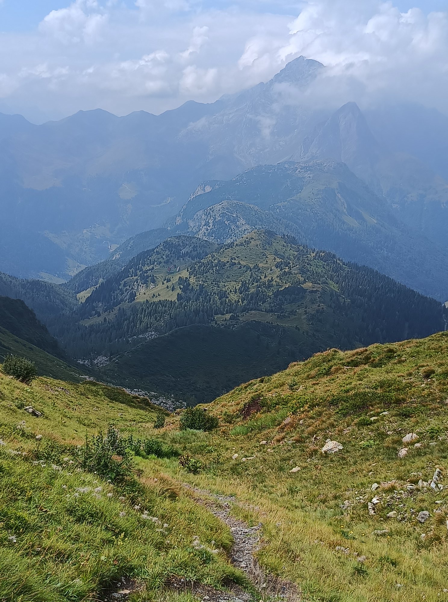Traversant ces écuries d’Augias je crois en avoir fini lorsque je quitte la piste un peu plus loin. Erreur car derrière le même plat m’est servi, mais cette fois sur une sente irrégulière d’une vingtaine de centimètres de large tout au plus, qui serpente entre les hautes herbes. Même si la boue disparaît peu a peu, les kilomètres suivants seront particulièrement éprouvants en raison de l’étroitesse du chemin et de la végétation luxuriante. Difficile de prendre du plaisir malgré les vues spectaculaires. A en lire les commentaires sur le site de la Via Alpina il semble que je ne suis pas le seul à en avoir souffert. On dirait que ce chemin est très peu emprunté, car sans doute trop loin d’accès en voiture. D’ailleurs je ne croise aucune âme qui vive pendant 2 heures.