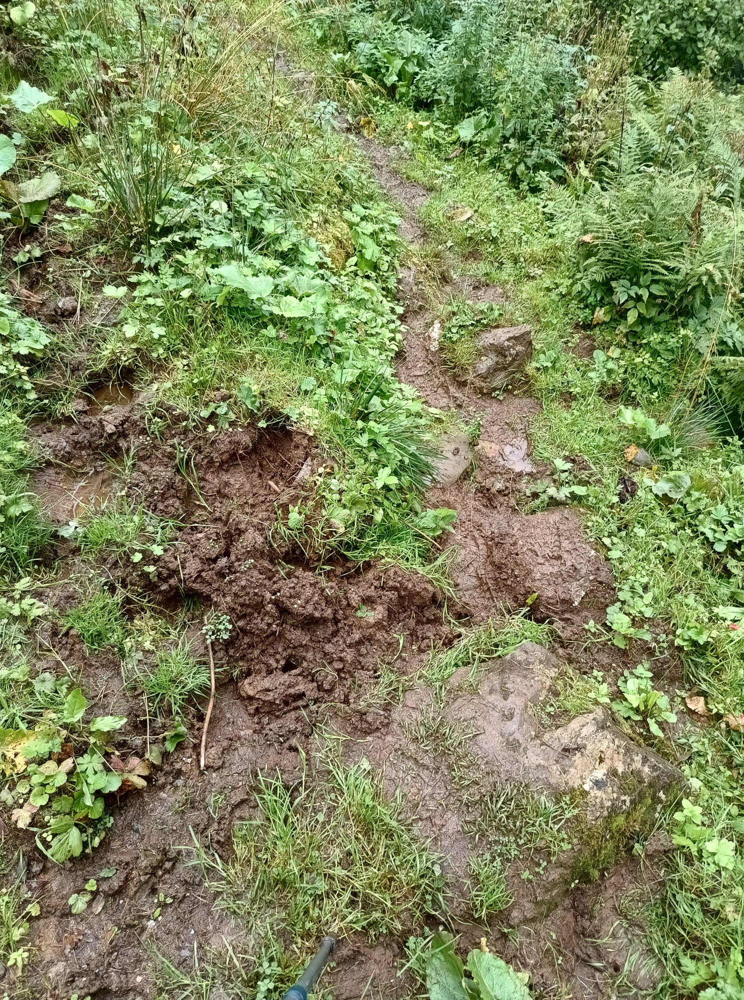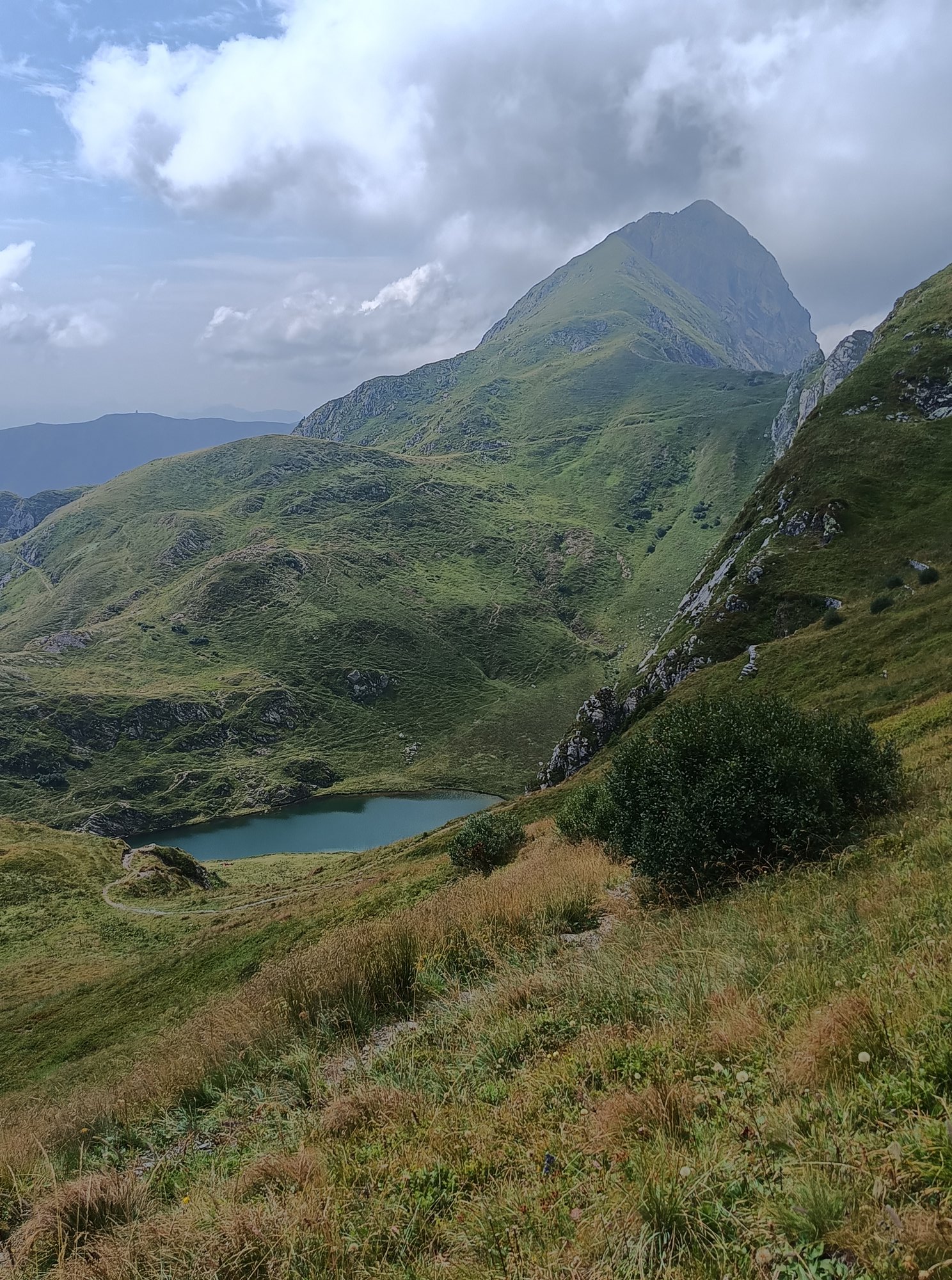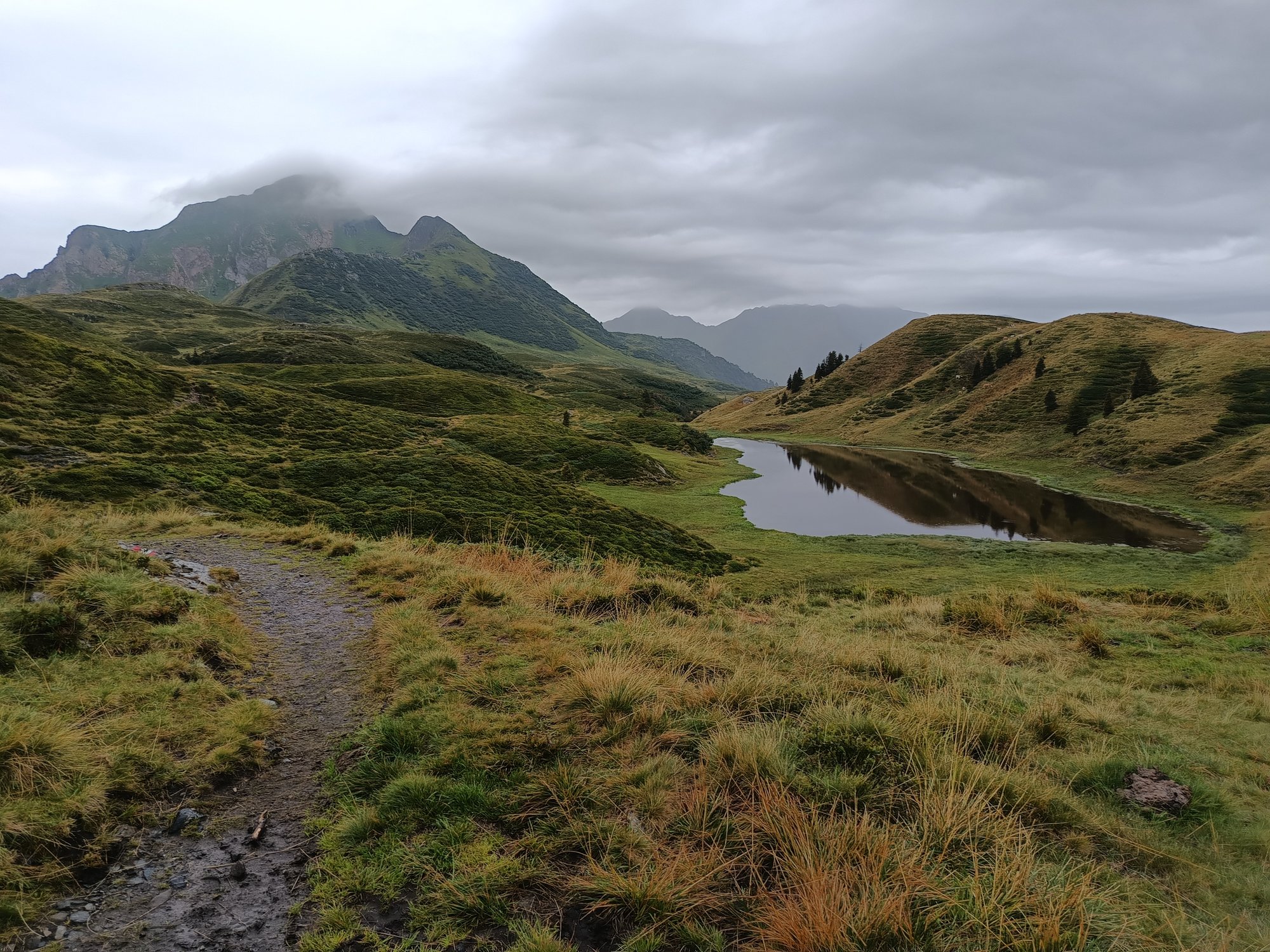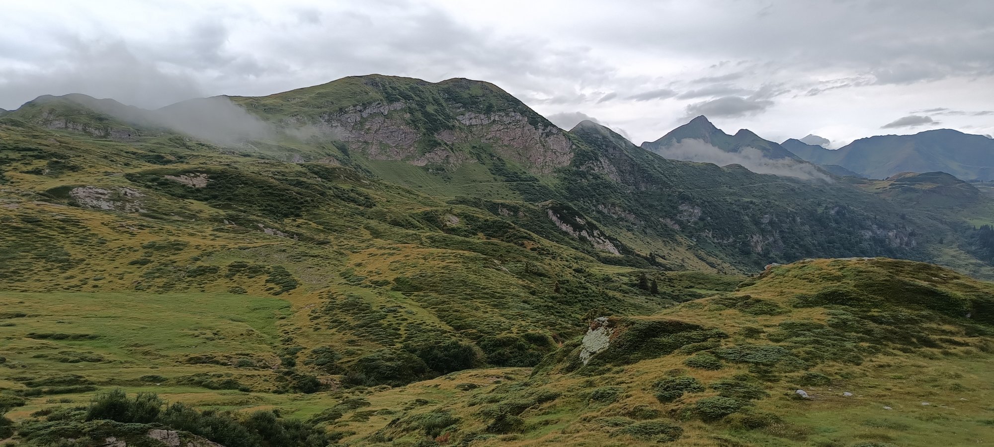 Traversant ces écuries d’Augias je crois en avoir fini lorsque je quitte la piste un peu plus loin. Erreur car derrière le même plat m’est servi, mais cette fois sur une sente irrégulière d’une vingtaine de centimètres de large tout au plus, qui serpente entre les hautes herbes. Même si la boue disparaît peu a peu, les kilomètres suivants seront particulièrement éprouvants en raison de l’étroitesse du chemin et de la végétation luxuriante. Difficile de prendre du plaisir malgré les vues spectaculaires. A en lire les commentaires sur le site de la Via Alpina il semble que je ne suis pas le seul à en avoir souffert. On dirait que ce chemin est très peu emprunté, car sans doute trop loin d’accès en voiture. D’ailleurs je ne croise aucune âme qui vive pendant 2 heures.