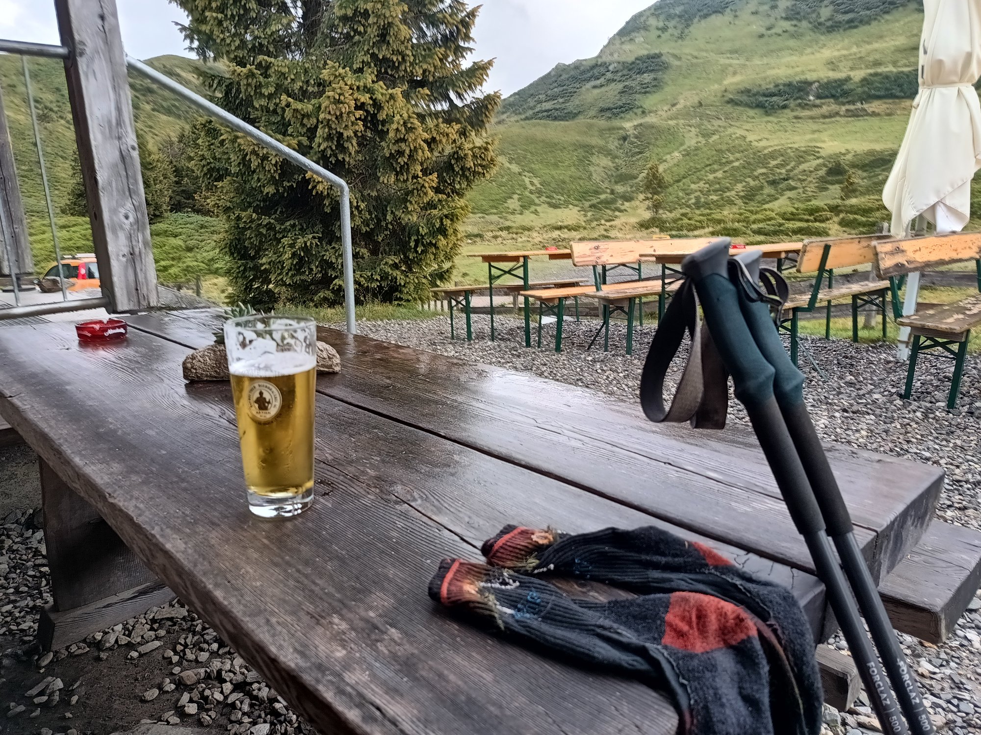 Pour me récompenser de ma bravoure, le balcon se conclut par une trouée entre de hautes herbes dont je sors complètement trempé. Je débouche alors sur un large plateau avec son centre une cuvette emplie par le lac de Zollnersee. C’est charmant mais j’imagine toutefois les lieux plus jolis et agréables par beau temps. Non seulement le crachin n’a pas cessé de tomber, mais en plus les sentiers sont assez boueux et bousillés par le piétinement intensif des nombreuses vaches qui broutent aux abords du lac. Je n’ai qu’une hâte, c’est d’arriver à la Zollnersee-Hütte pour faire une pause et essorer mes chaussettes. Je l’atteins peu avant 10h, et après ces 3 heures d’effort sous un temps pluvieux et froid, marquées en plus par une erreur d’orientation, je ne juge absolument pas qu’il est trop tôt pour m’offrir une bière et souffler une petit demi-heure.