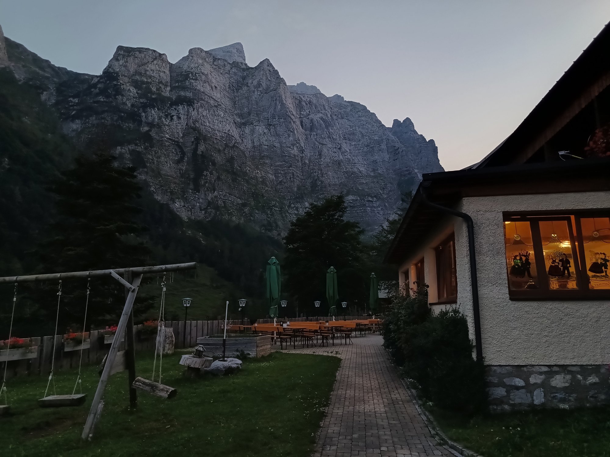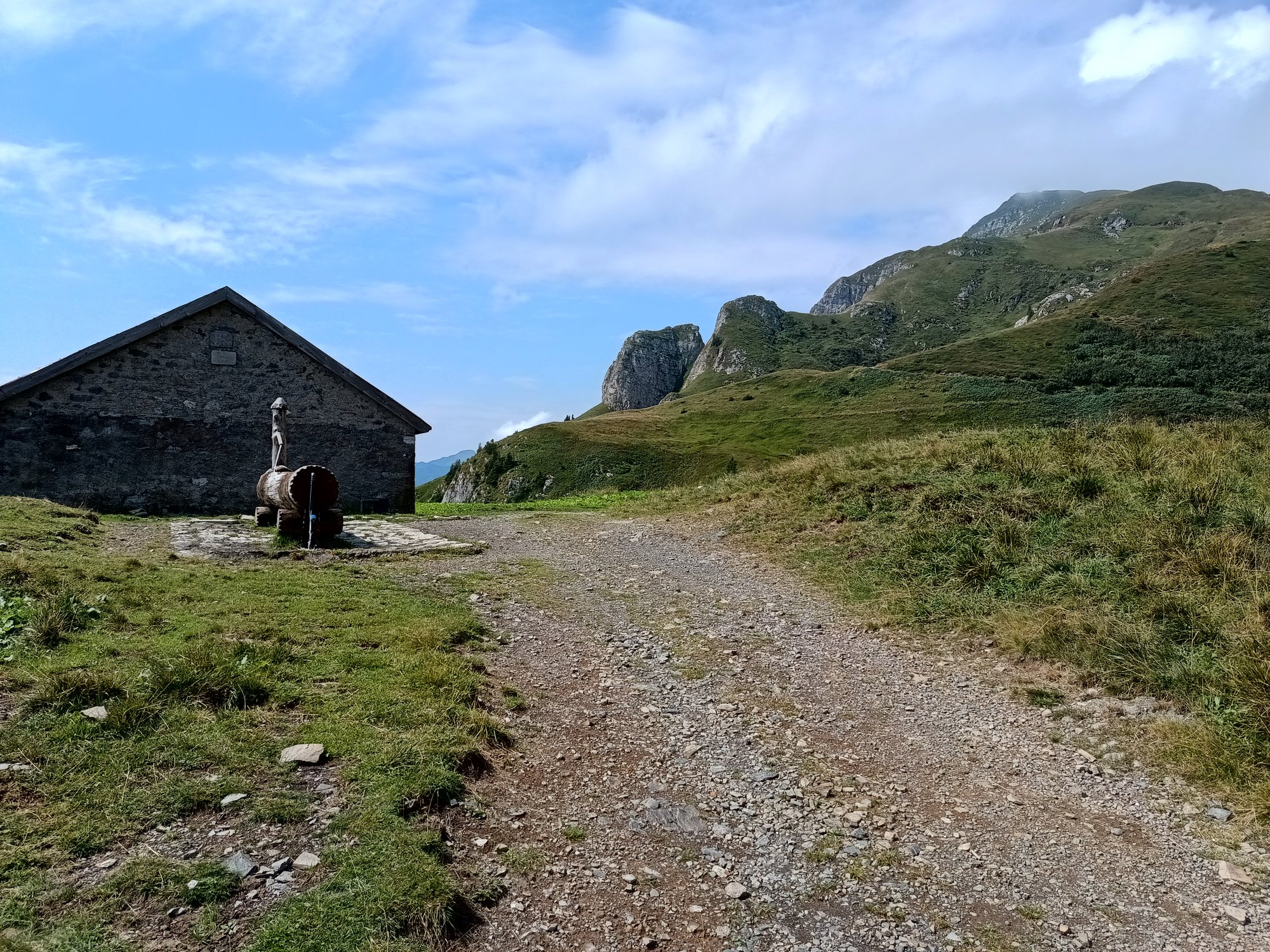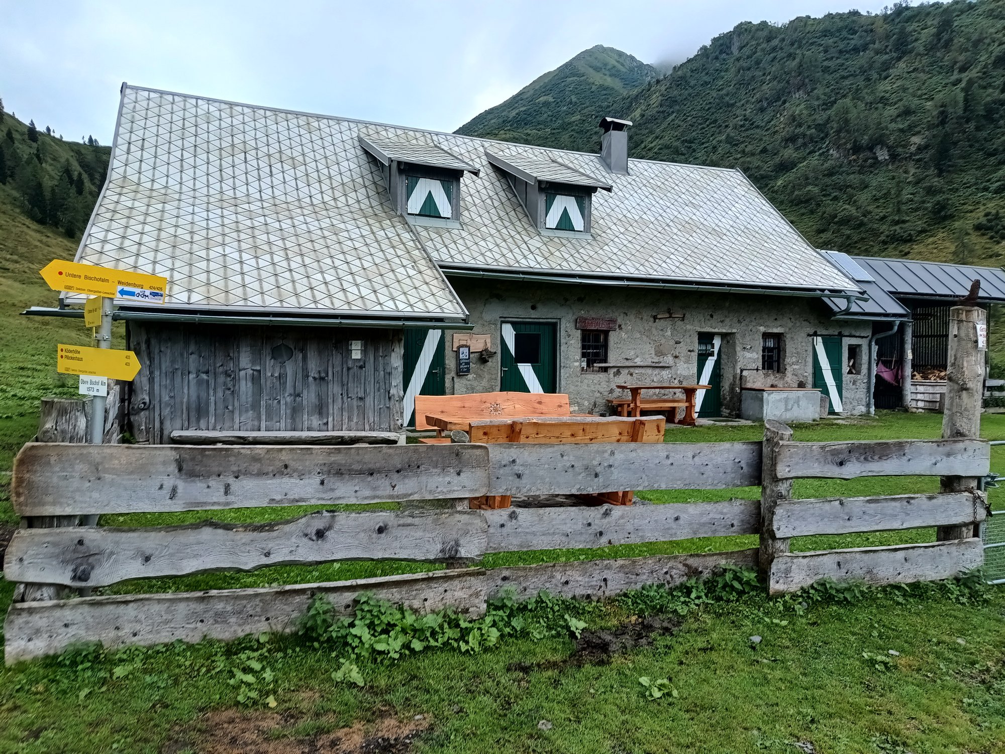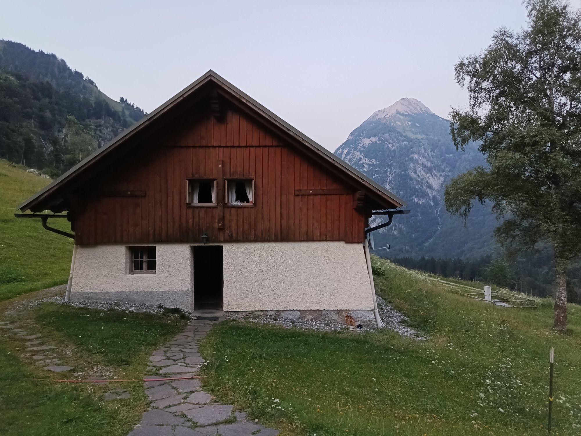 Pas d’autre choix que de poursuivre, et 45mn plus tard je me trouve devant l’alpage de Valentinalm (1200m). J’y vois pas mal de monde mais surtout des gens qui sont montés en voiture via la piste caillouteuse à 15 % (no comment), je me rassure en me disant qu’ils sont juste venus pour manger mais n’y passeront pas la nuit. En effet une fois encore je n’ai rien réservé, mais puisqu’on est fin août je crois en ma chance. Et je fais bien car les tenanciers, super sympas (à rebours de certains commentaires sur le site de la Via Alpina – mais il semble que la gestion a changé en 2023), me confirment qu’ils ont de la place dans le dortoir qui est dans le bâtiment d’à côté (l’ancienne lagerhaus). Puis, quand je leur raconte d’où je viens et tout ce que j’ai marché aujourd’hui, ils semblent me prendre en pitié et m’offrent carrément une chambre pour le même prix, normalement non louée aux touristes, et située au rez de chaussée de ce même bâtiment dortoir. Je me sens assez chanceux, ma chambre étant en outre à proximité immédiate des commodités partagées (toilettes, douche, lavabo pour rincer mes chaussettes). Je pense aussi que puisque j’étais seul, ils voulaient laisser la jouissance du dortoir à un groupe qui y était déjà installé.