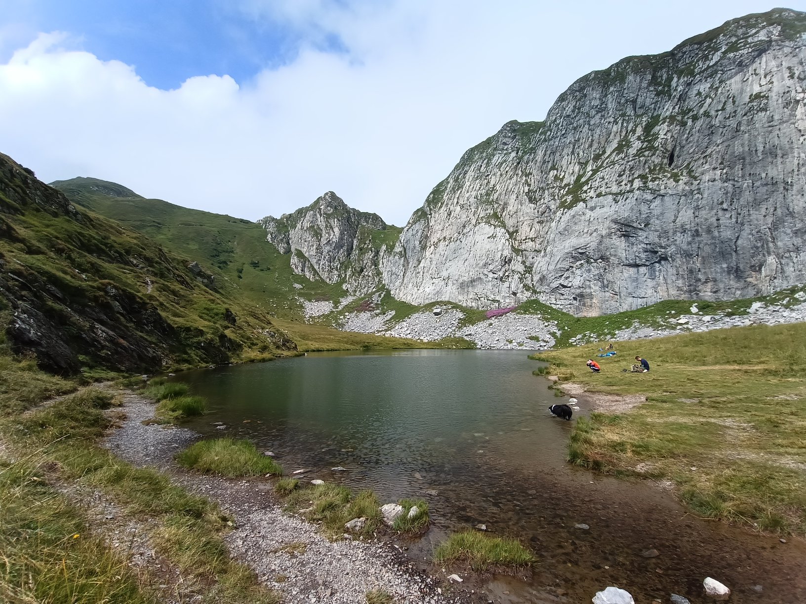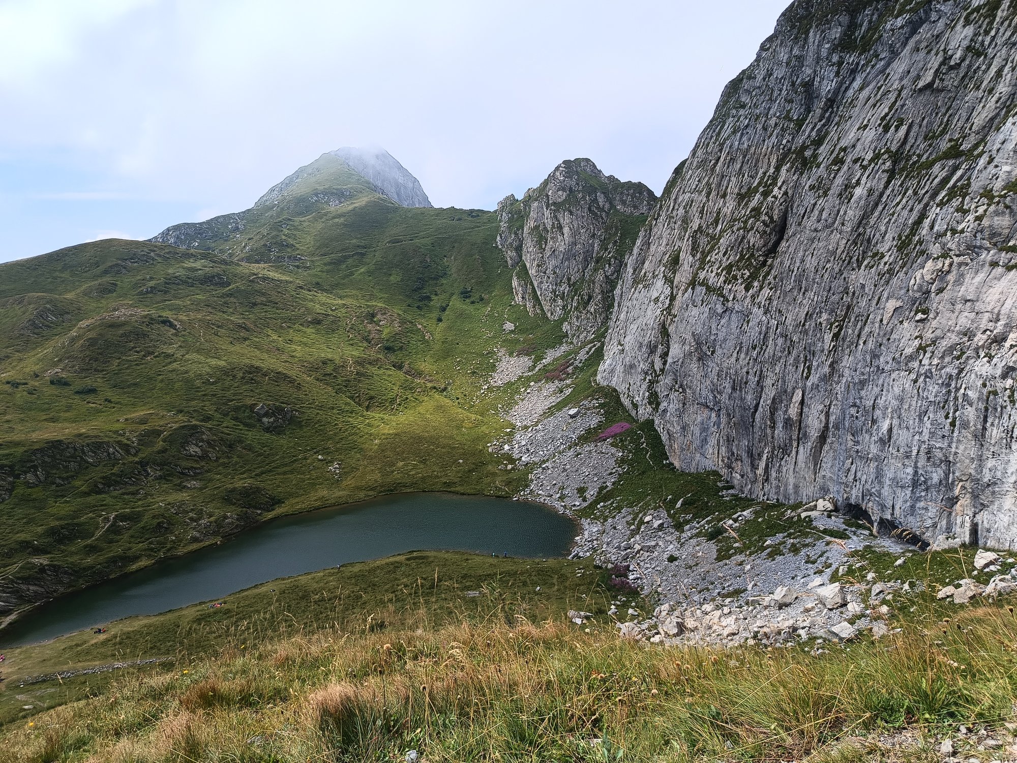 Après une courte montée me voici au lac d’Avostanis (1936m) à 12h45. Le soleil a pointé le bout de son nez et le paysage tient toutes ses promesses : parfait pour la pause déjeuner. Je m’installe sur une table face au lac et sa paroi effrayante et sors mon pain et mon fromage, même si d’emblée je sais que je ne vais pas y passer des heures car le vent est assez fort. D’autant que dans le refuge non gardé derrière moi, un groupe plutôt agité et bruyant (pour ne pas dire pénible) a colonisé l’endroit . Me retournant je les vois alors porter des packs de 6 grandes bouteilles d’eau comme s’ils s’installaient pour la semaine. Je me demande quel est exactement le projet, sachant qu’il y a une fontaine un peu plus bas..