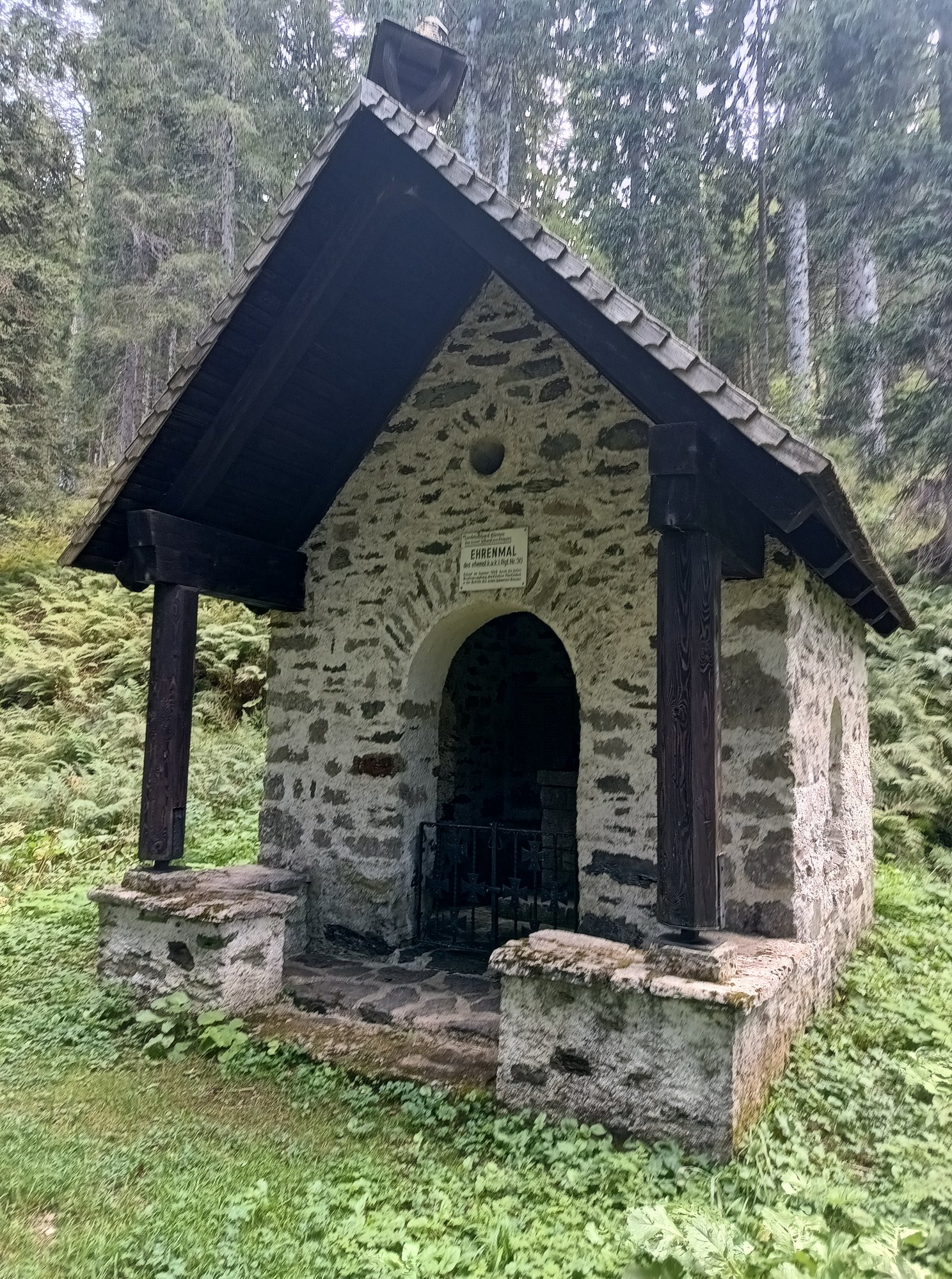 Par une descente sans difficulté j’atteins le Passo di Pal grande (1761 m), et quelques mètres plus tard je bifurque à droite pour remonter légèrement et repasser sur l’autre flanc. A cet endroit, loin de tout et sur de petits sentiers, j’entends le bruit incongru d’une motocross qui ne doit pas être à plus de 200 mètres de là. Il y a de ces fous…Je ne croise finalement pas l’énergumène. Par une longue piste forestière de 5km dont la seule attraction sera la présence d’une petite chapelle, mémorial de la première guerre, j’arrive au Plöckenpass à 15h30. J’y avais repéré une auberge mais celle-ci est fermée. J’apprendrai plus tard que la route du col côté italien est toujours fermée suite a un glissement de terrain l’année précédente. Ceci explique sans doute cela.