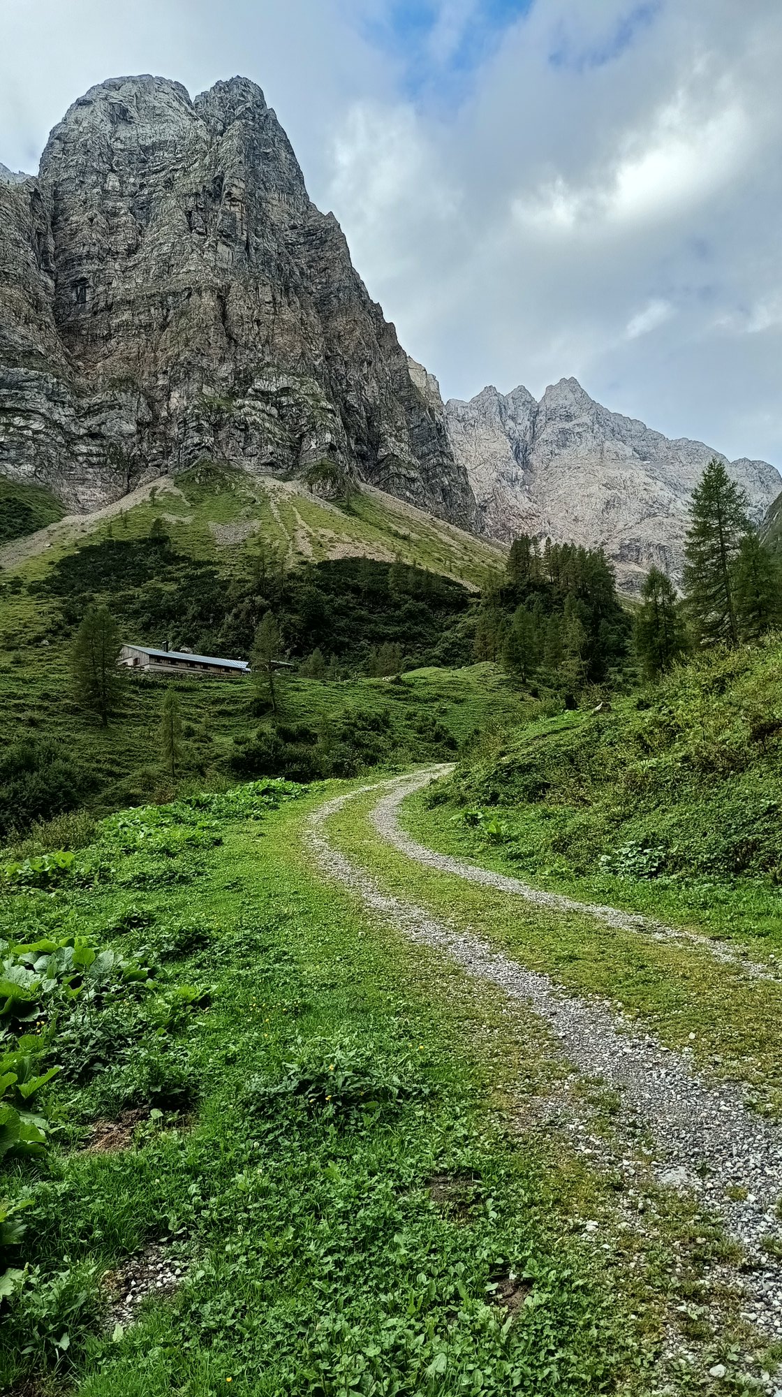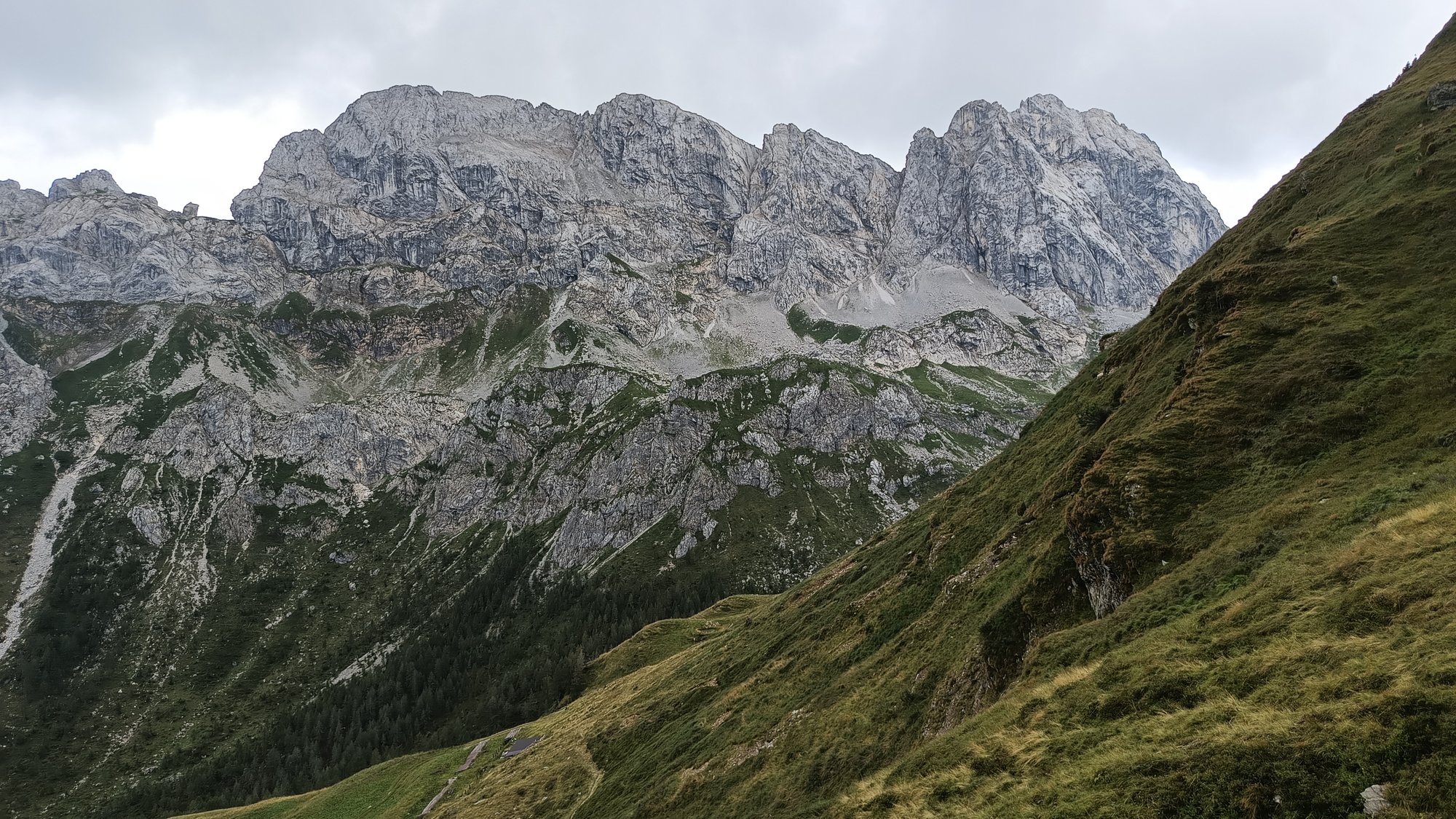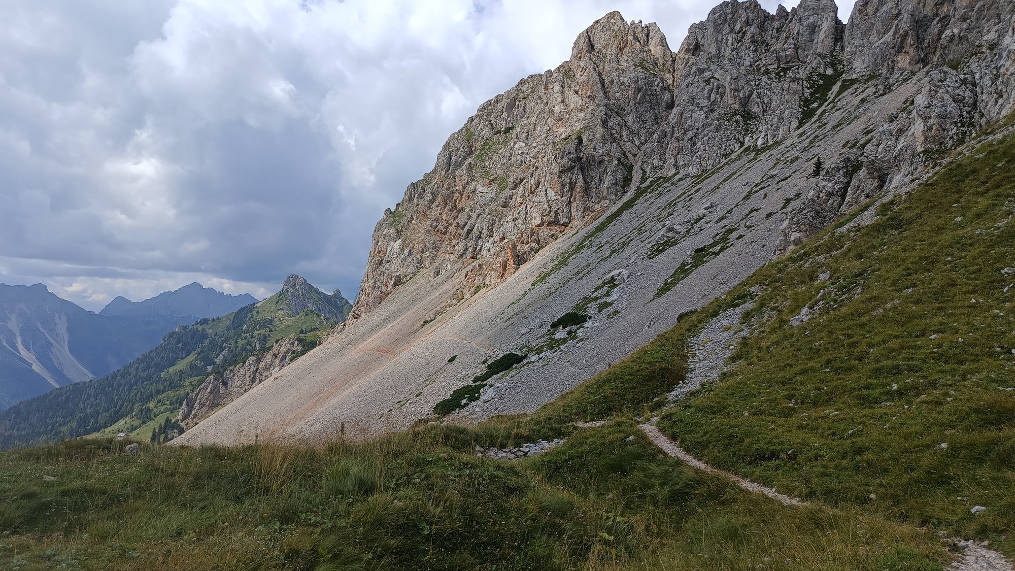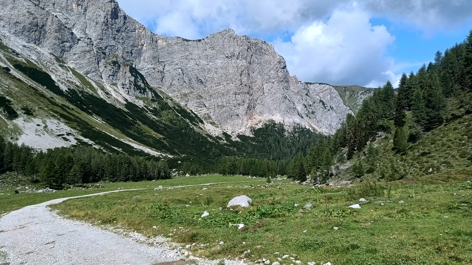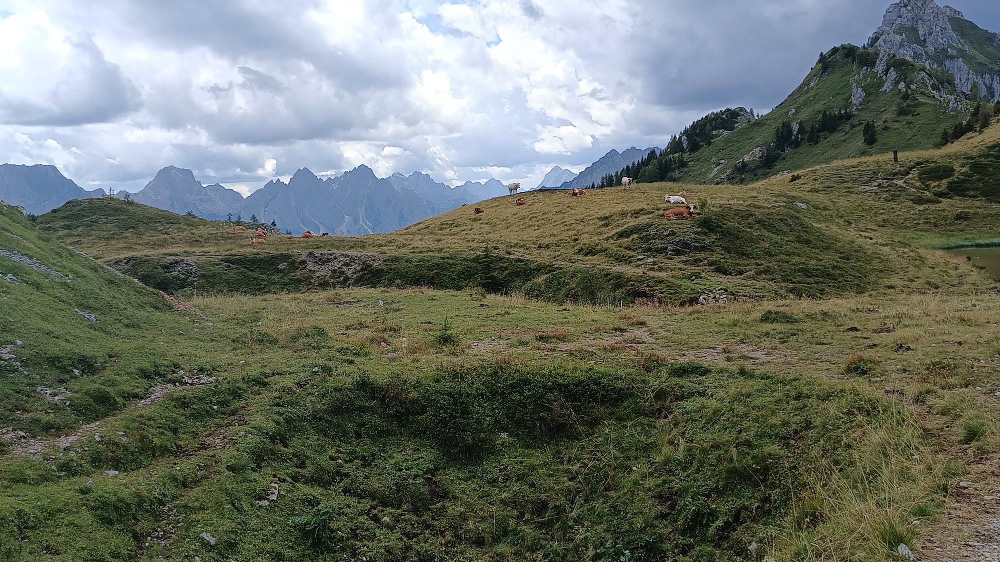 Je croise plusieurs mobylettes sans essence vélos électriques, mais aussi quelques courageux qui montent en pédalant (quand meme 9km à 10 % depuis le parking en bas si mes calculs sont corrects ). Atteignant la vallée de Wolayer bach je retrouve les vaches et un alpage entouré d’un immense cirque. Je dois passer derrière cette paroi mais je me demande bien par où ! La réponse ne tarde pas à arriver, après un virage la vue se dégage et je remarque au fond à gauche une trouée, où passe probablement le chemin qui mène en Italie via le col de Giramondo (2005m). Ici je quitte la piste et l’itinéraire touristique principal pour revenir sur une plus petite trace. Je marche d’abord à flanc de montagne et profite de vues spectaculaires sur l’entrée de la vallée et les sommets du Gamskofel (2526 m) et du Monte Coglians (2781 m). Même si l’altitude pourrait paraître modeste il ne faut pas s’y tromper : le plancher est plus bas et c’est très vertical (comme en Slovénie d’ailleurs).