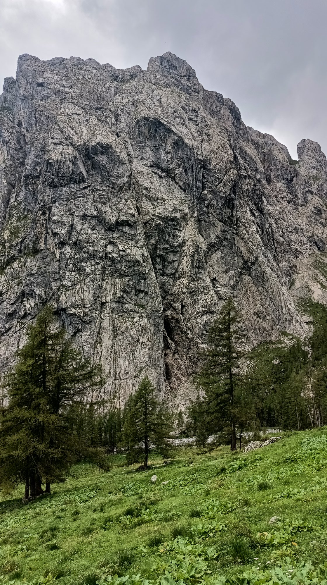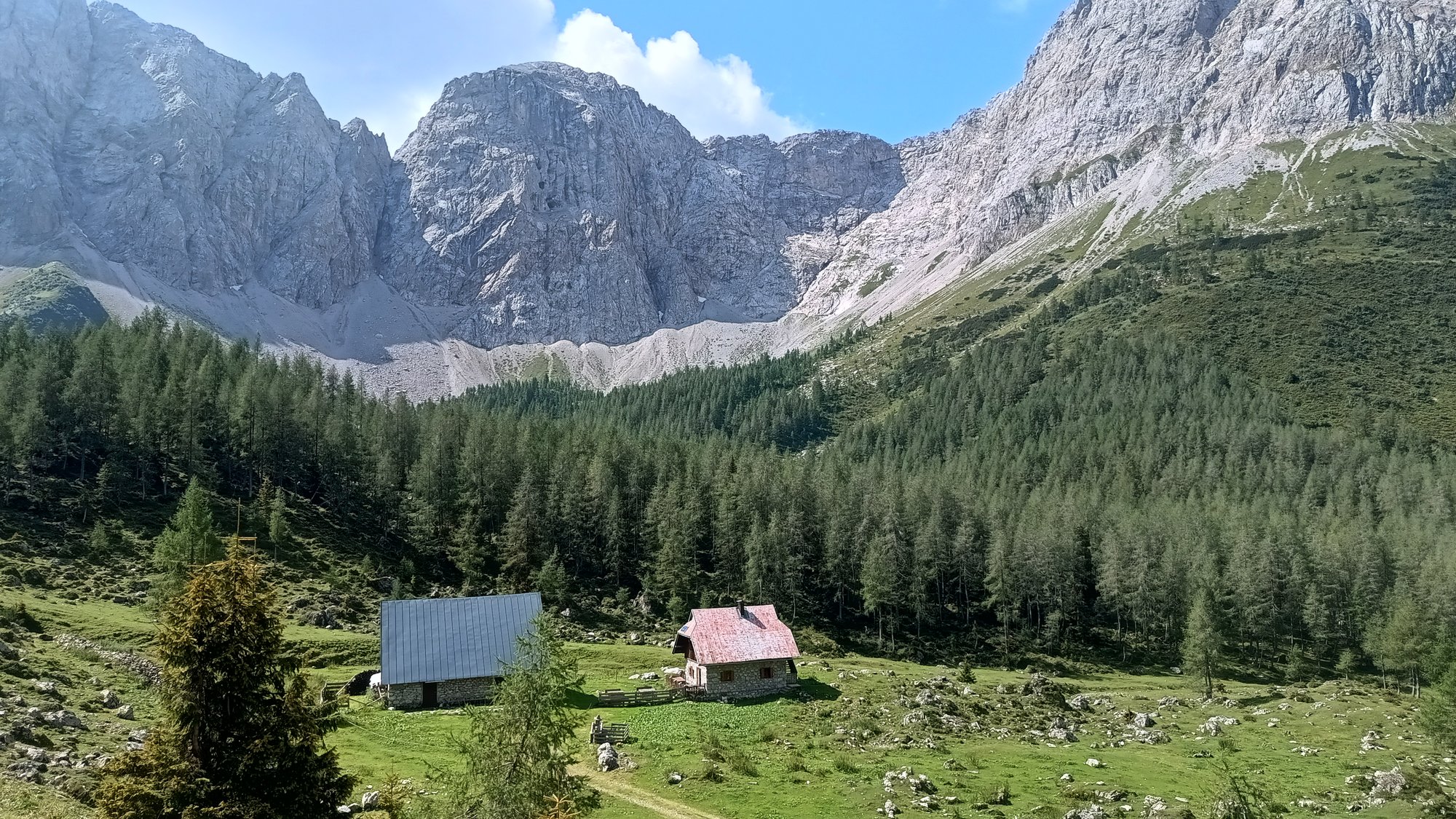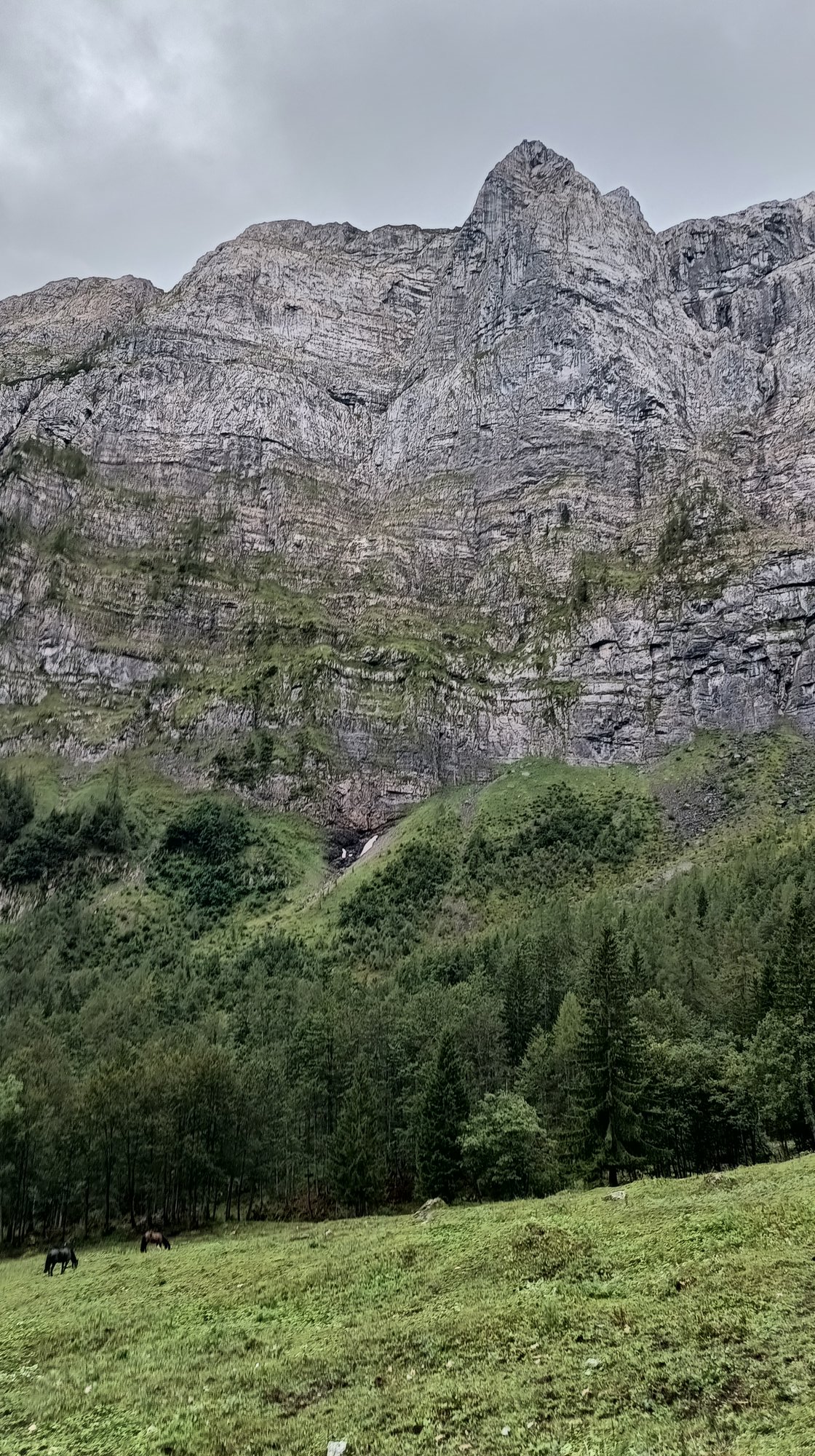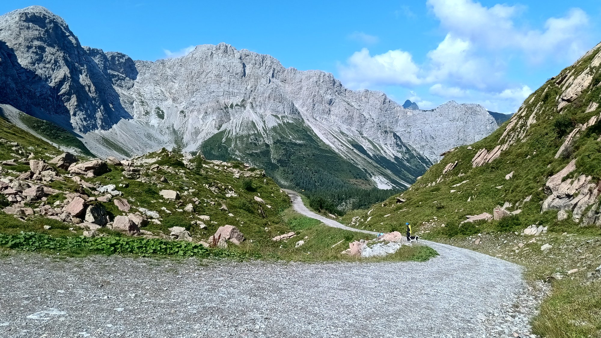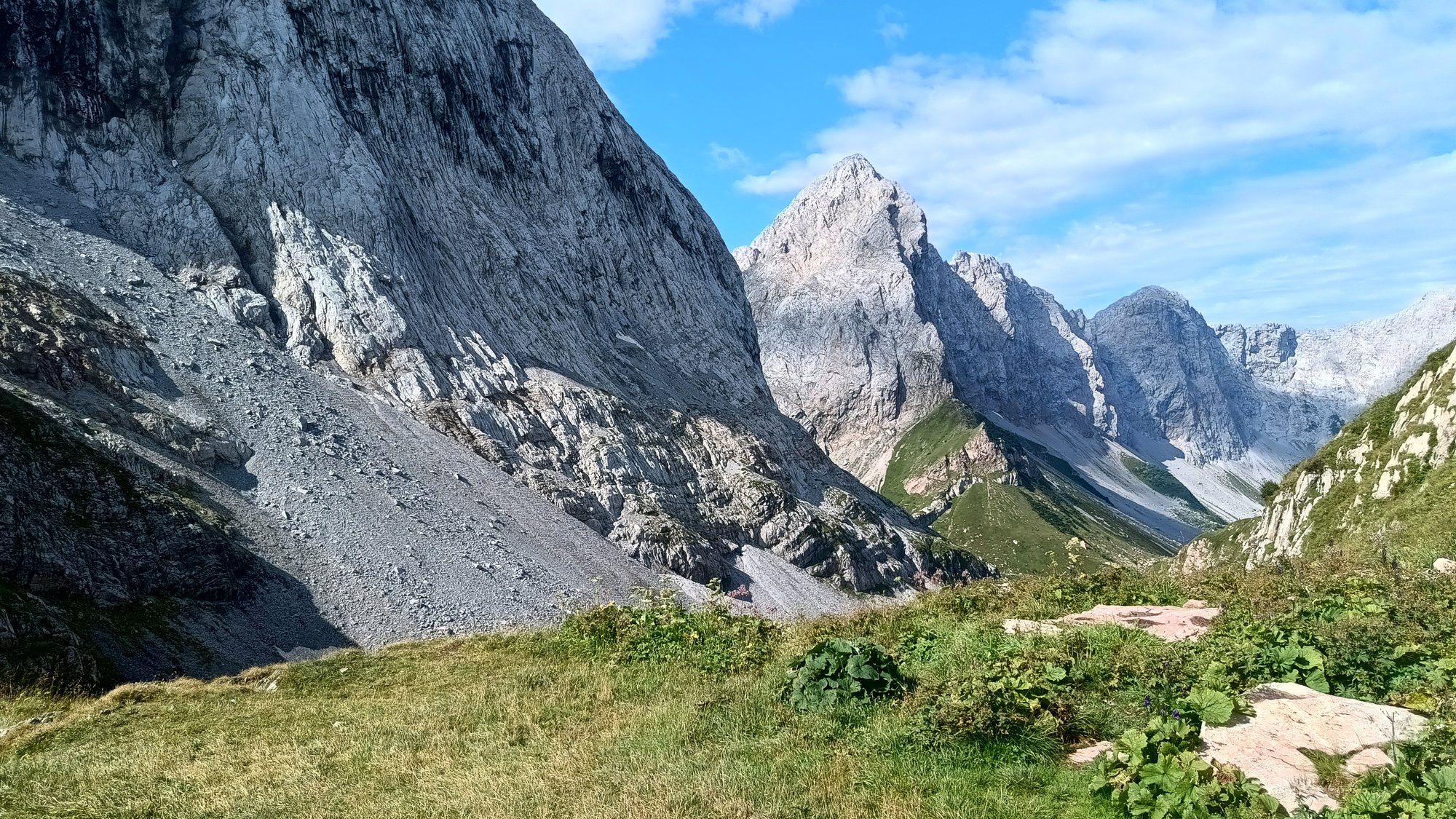 Je croise plusieurs mobylettes sans essence vélos électriques, mais aussi quelques courageux qui montent en pédalant (quand meme 9km à 10 % depuis le parking en bas si mes calculs sont corrects ). Atteignant la vallée de Wolayer bach je retrouve les vaches et un alpage entouré d’un immense cirque. Je dois passer derrière cette paroi mais je me demande bien par où ! La réponse ne tarde pas à arriver, après un virage la vue se dégage et je remarque au fond à gauche une trouée, où passe probablement le chemin qui mène en Italie via le col de Giramondo (2005m). Ici je quitte la piste et l’itinéraire touristique principal pour revenir sur une plus petite trace. Je marche d’abord à flanc de montagne et profite de vues spectaculaires sur l’entrée de la vallée et les sommets du Gamskofel (2526 m) et du Monte Coglians (2781 m). Même si l’altitude pourrait paraître modeste il ne faut pas s’y tromper : le plancher est plus bas et c’est très vertical (comme en Slovénie d’ailleurs).
