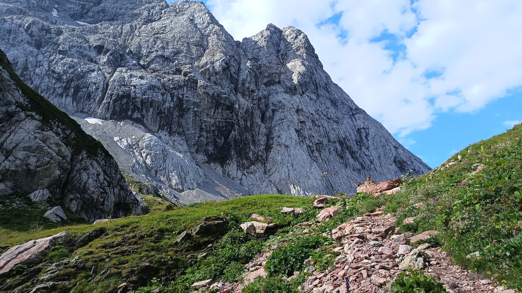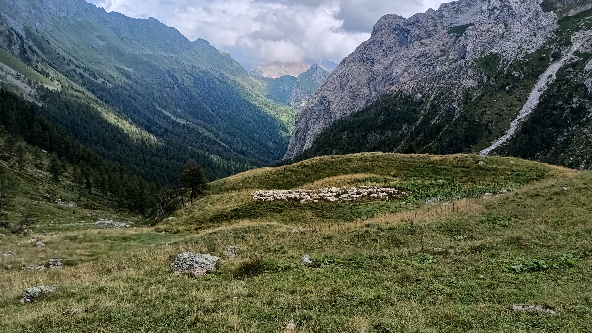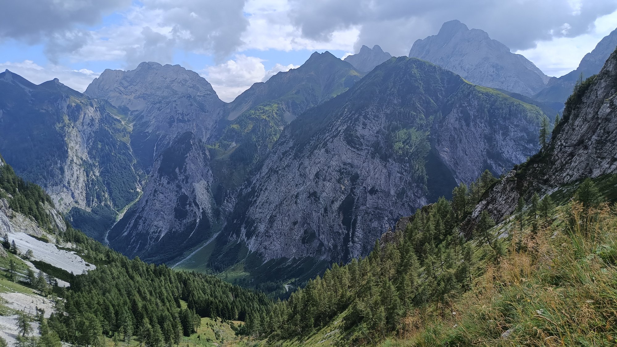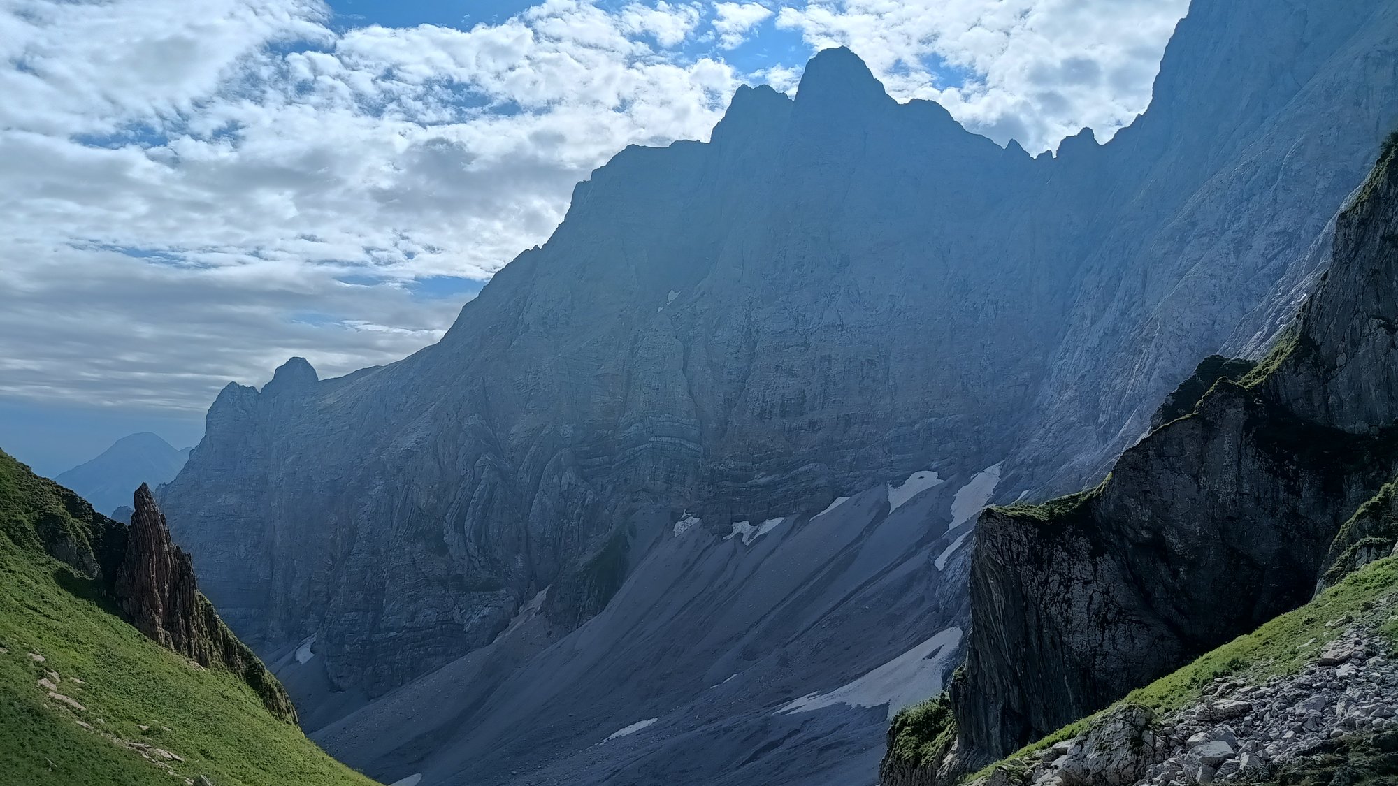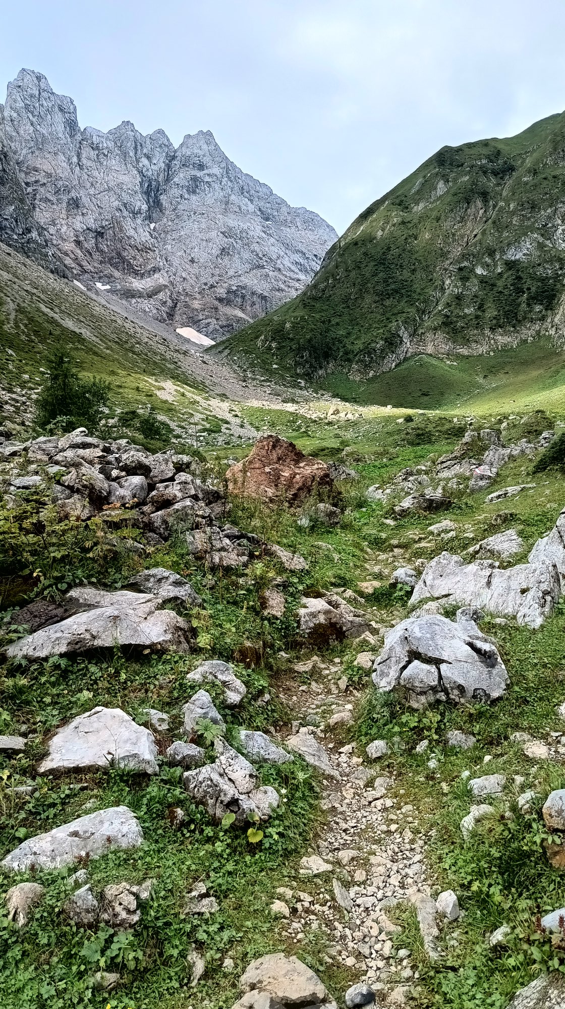 Je croise plusieurs mobylettes sans essence vélos électriques, mais aussi quelques courageux qui montent en pédalant (quand meme 9km à 10 % depuis le parking en bas si mes calculs sont corrects ). Atteignant la vallée de Wolayer bach je retrouve les vaches et un alpage entouré d’un immense cirque. Je dois passer derrière cette paroi mais je me demande bien par où ! La réponse ne tarde pas à arriver, après un virage la vue se dégage et je remarque au fond à gauche une trouée, où passe probablement le chemin qui mène en Italie via le col de Giramondo (2005m). Ici je quitte la piste et l’itinéraire touristique principal pour revenir sur une plus petite trace. Je marche d’abord à flanc de montagne et profite de vues spectaculaires sur l’entrée de la vallée et les sommets du Gamskofel (2526 m) et du Monte Coglians (2781 m). Même si l’altitude pourrait paraître modeste il ne faut pas s’y tromper : le plancher est plus bas et c’est très vertical (comme en Slovénie d’ailleurs).