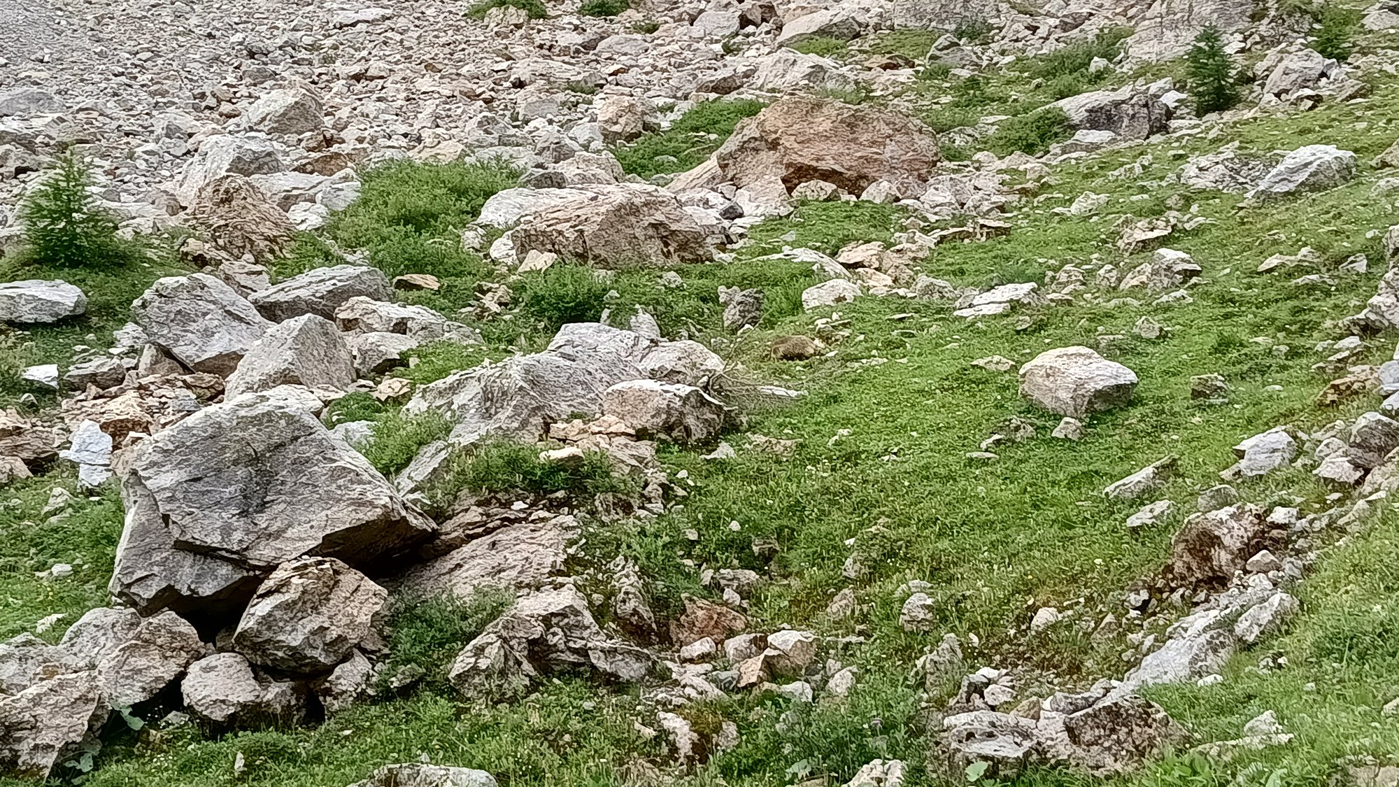 A mesure que je gagne le fond de la vallée le paysage devient plus alpestre, avec de grandes étendues herbeuses ça et là couvertes de gros cailloux tombés d’en haut. Dans un tel décor je ne suis pas étonné d’observer quelques minutes plus tard un groupe de marmottes, dont la sentinelle donne l’alerte à mon approche. Je ne me dispense pas du cliché de prendre un cliché, effort vain qui se traduira comme d’habitude par la capture d’une tache marron à peine discernable au milieu des rochers.