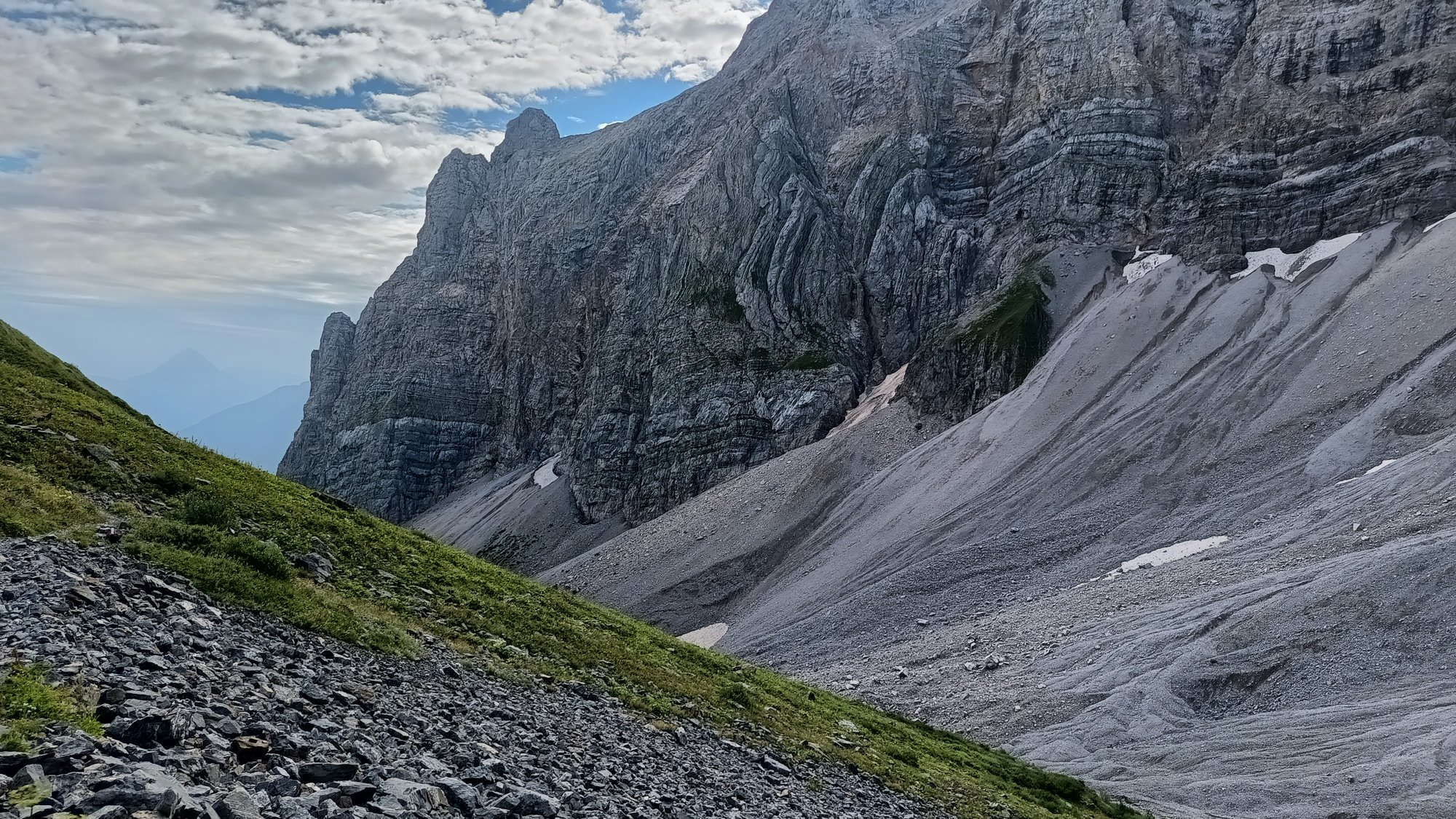 A 1750 mètres, le sentier se fait plus raide pour attaquer la dernière partie. Sur ma gauche, les parois sont toujours plus spectaculaires et laissent maintenant clairement deviner la trace d’un ancien glacier. Il y a même encore des névés fin août à cette altitude, preuve que sous cette face nord il ne doit pas faire bien chaud…C’est magnifique et j’en prends plein les yeux.