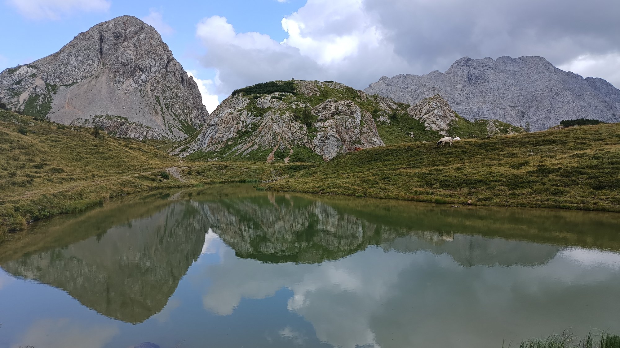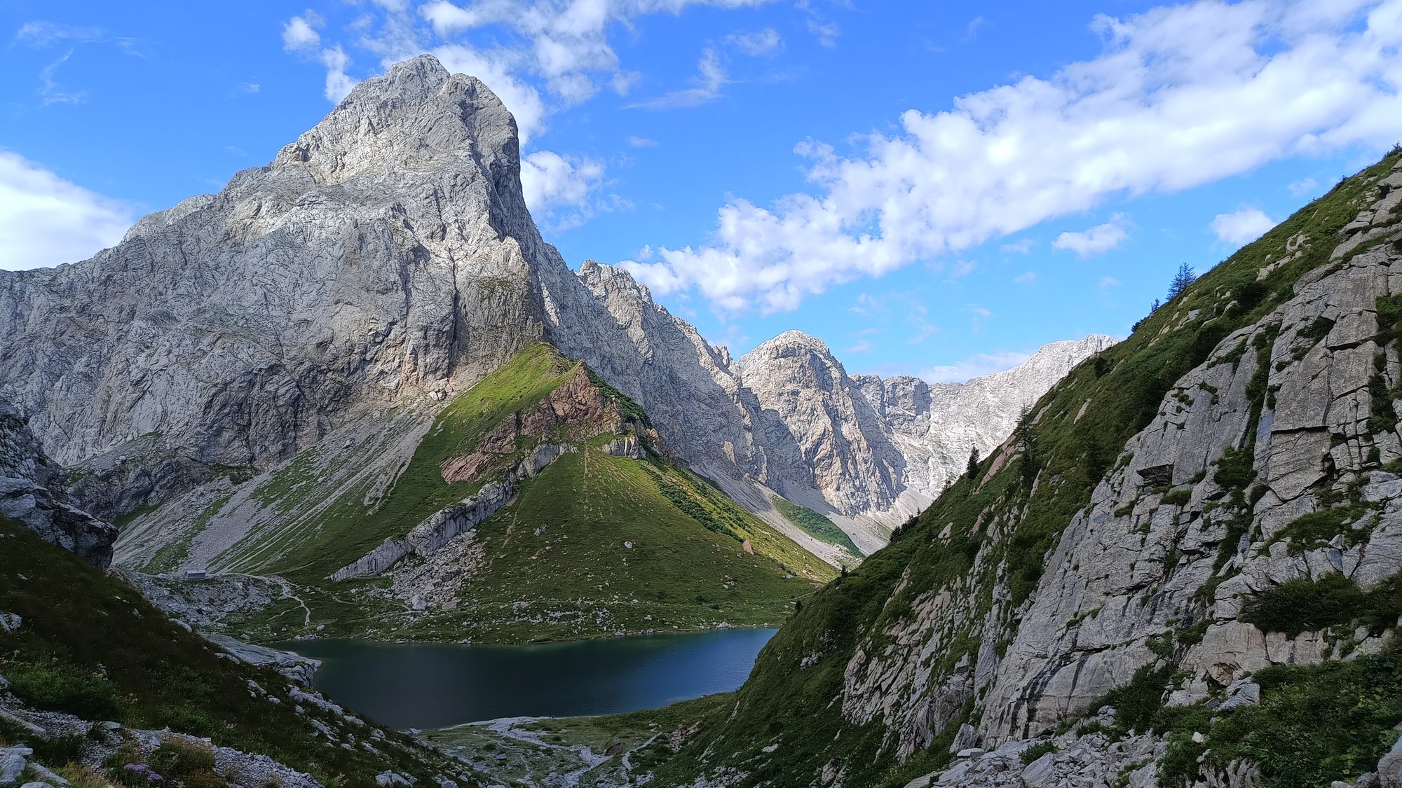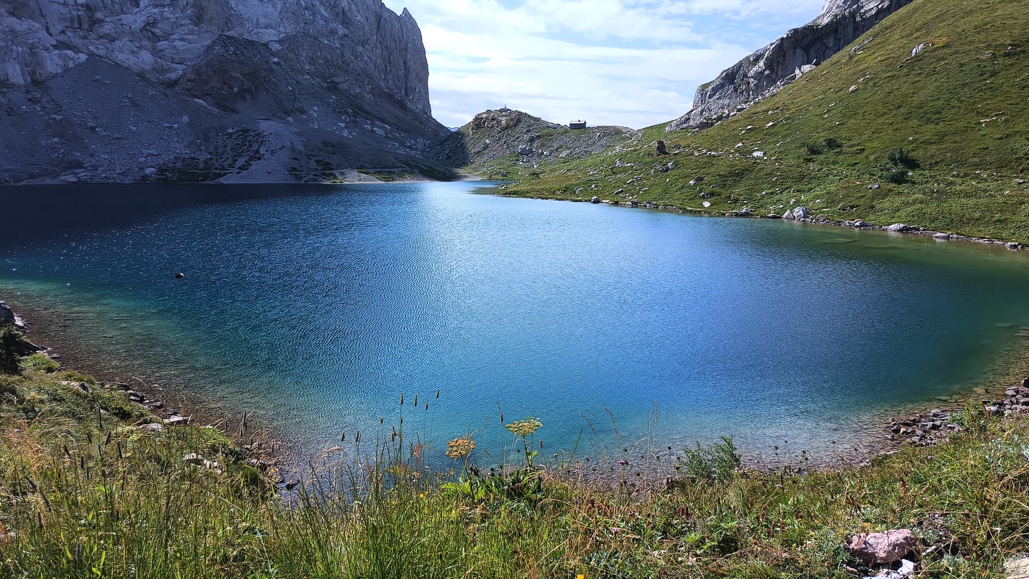 Sans conteste cette fin d’ascension et la descente vers le lac de Wolayersee forment le plus beau passage de ma Via Alpina 2024. Je ne dois d’ailleurs pas être le seul à le penser, car je croise de plus en plus de randonneurs. Pour couronner le tout le temps s’est progressivement dégagé et c’est sous un ciel bleu que j’atteins le col à 10h15, puis une vingtaine de minutes plus tard les berges du lac, sous l’imposant Seekopf (2554 m).