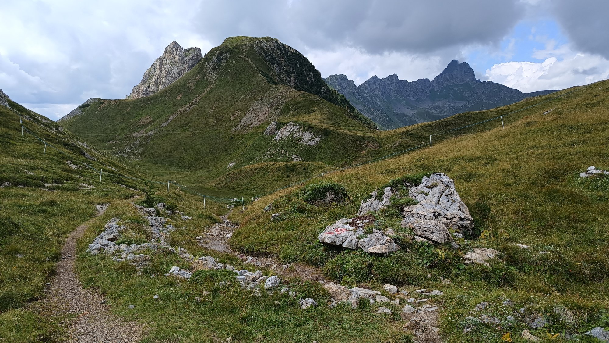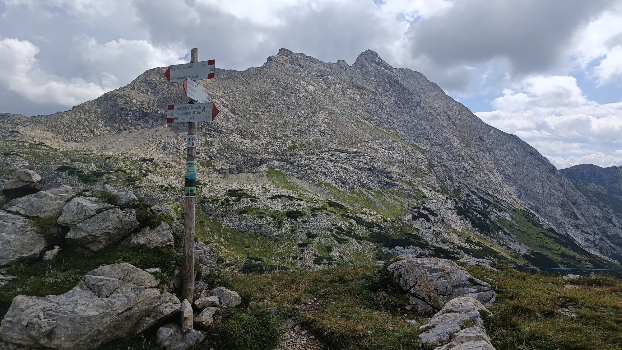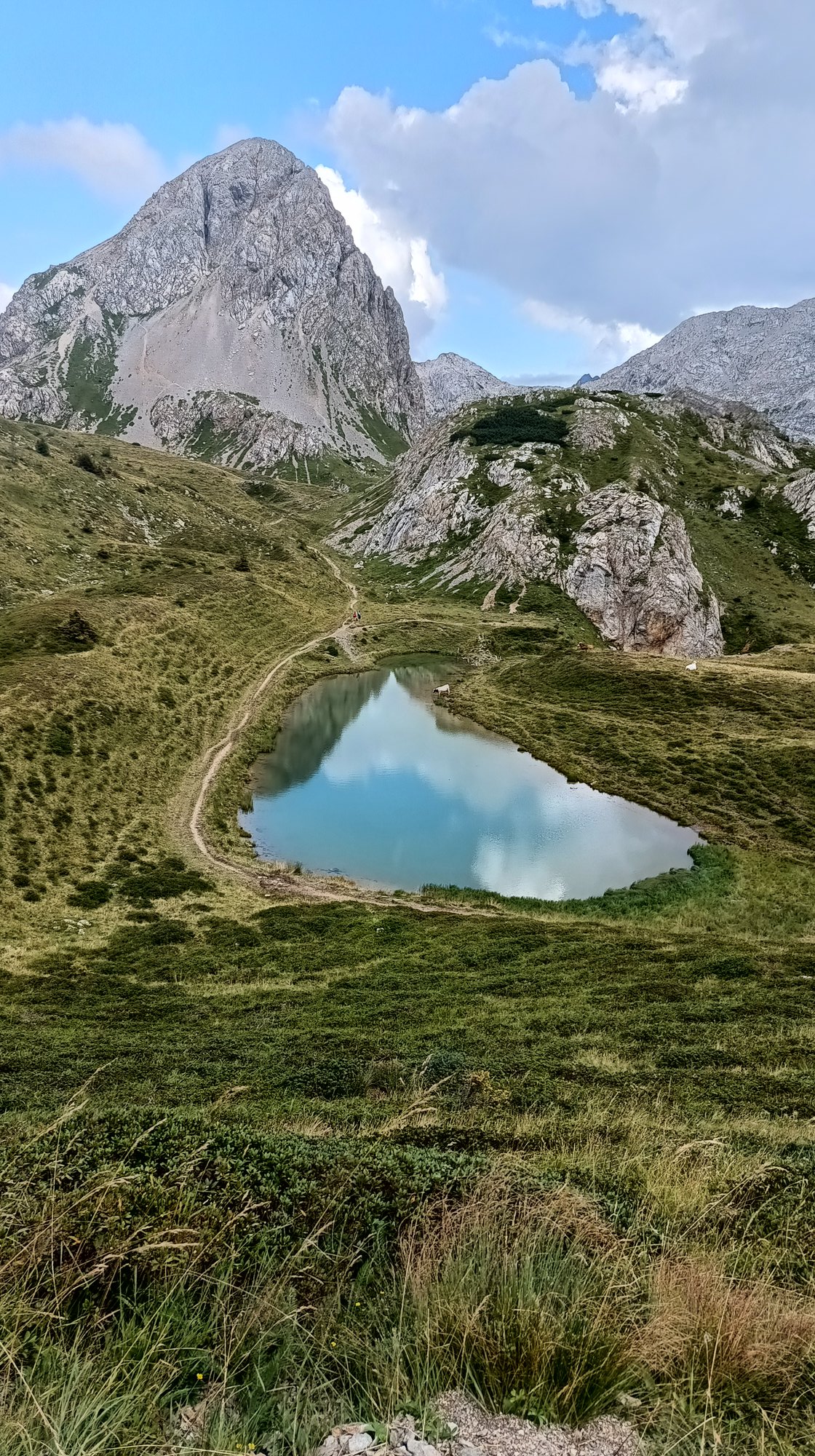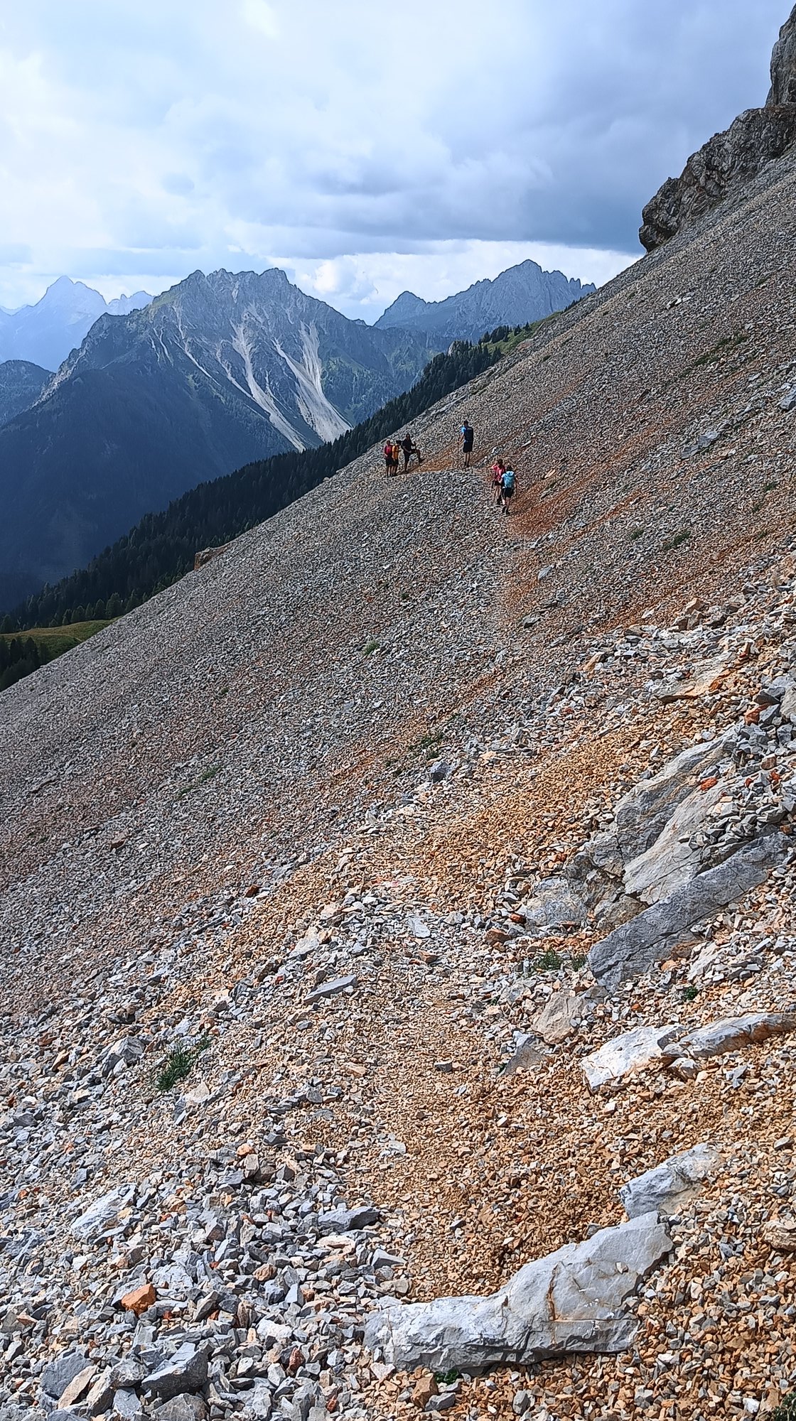 Sans conteste cette fin d’ascension et la descente vers le lac de Wolayersee forment le plus beau passage de ma Via Alpina 2024. Je ne dois d’ailleurs pas être le seul à le penser, car je croise de plus en plus de randonneurs. Pour couronner le tout le temps s’est progressivement dégagé et c’est sous un ciel bleu que j’atteins le col à 10h15, puis une vingtaine de minutes plus tard les berges du lac, sous l’imposant Seekopf (2554 m).