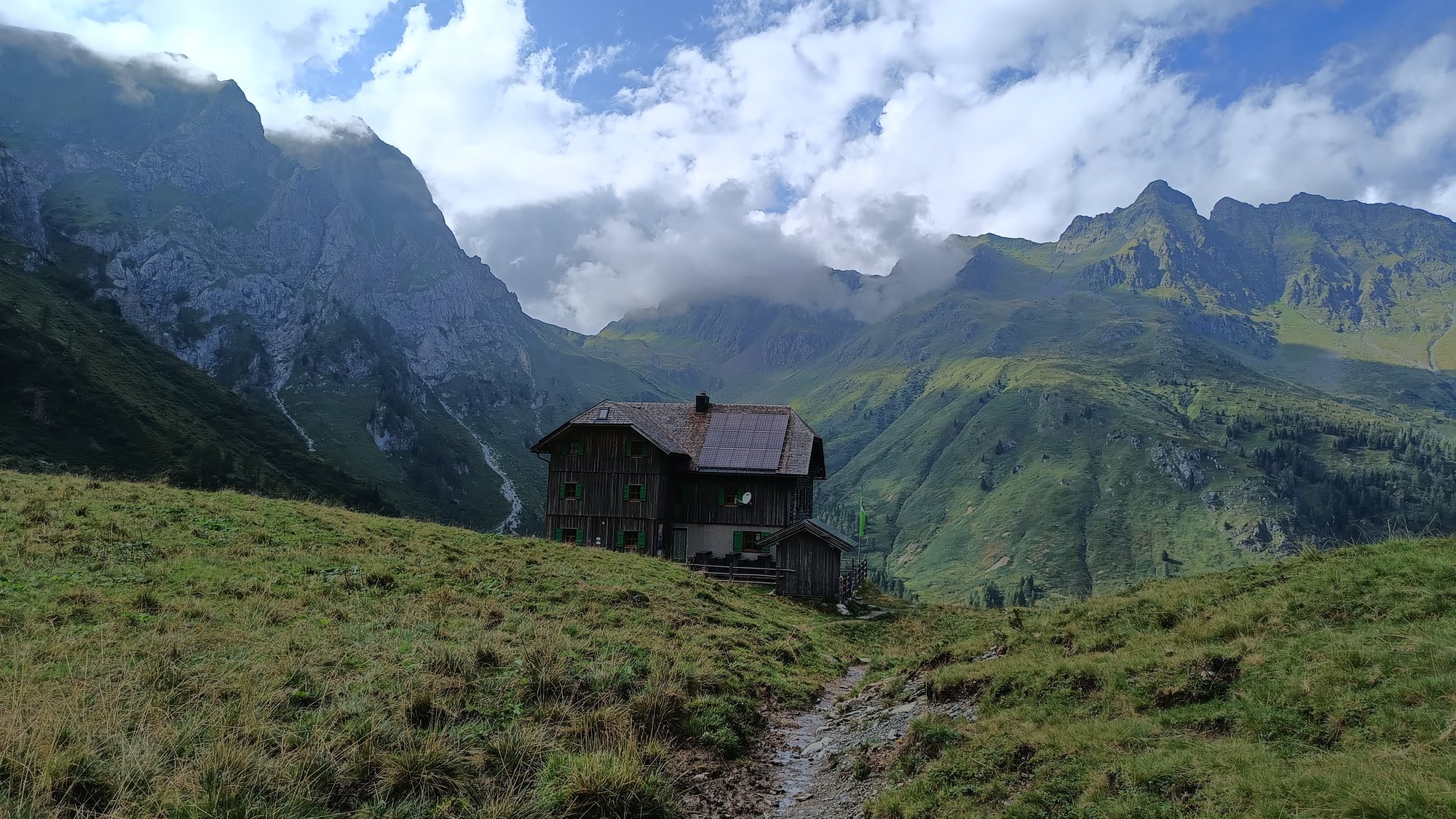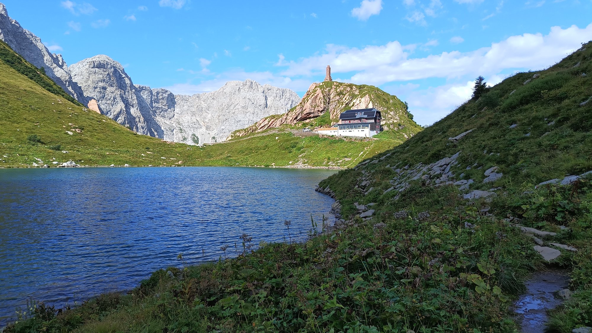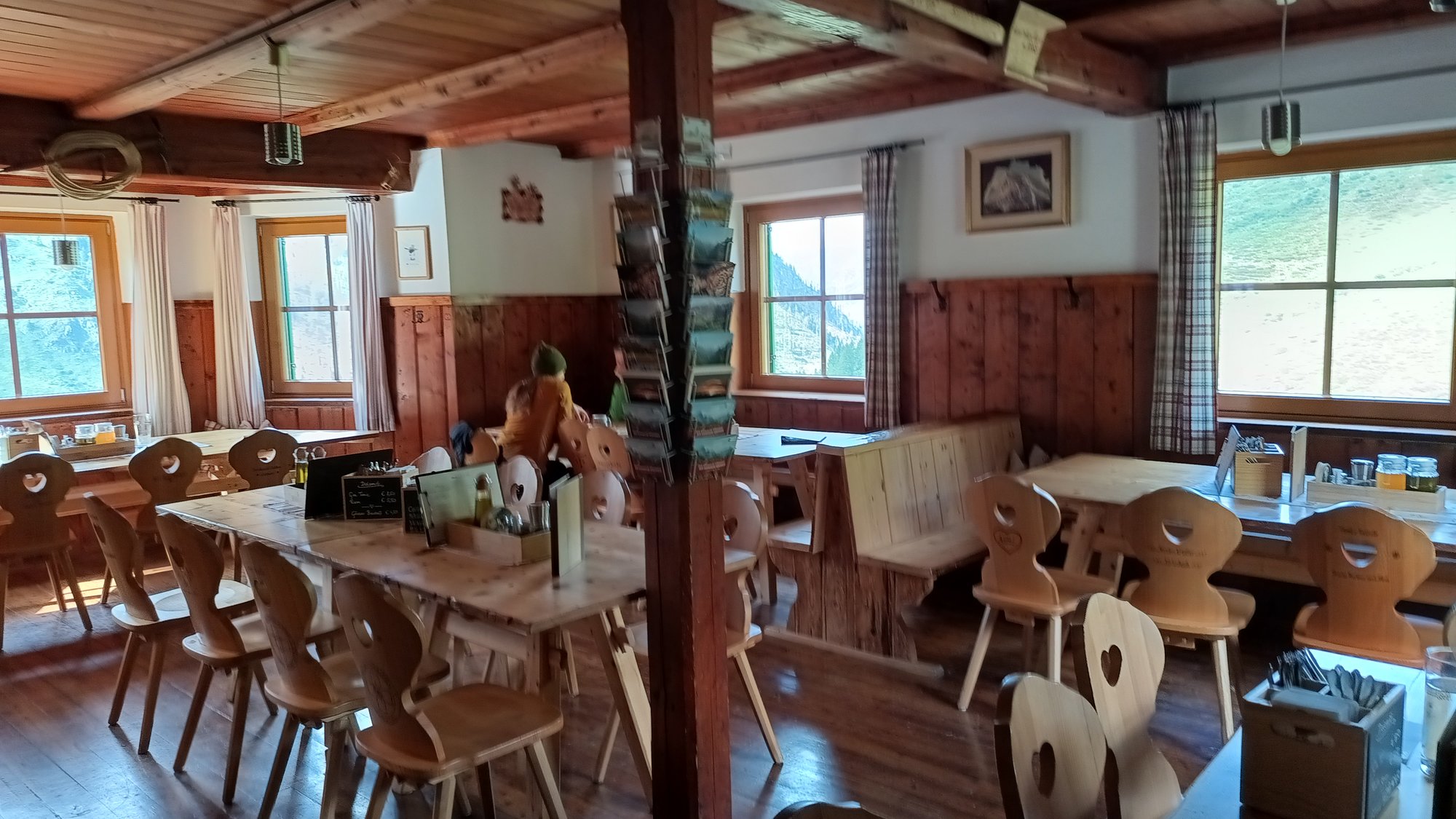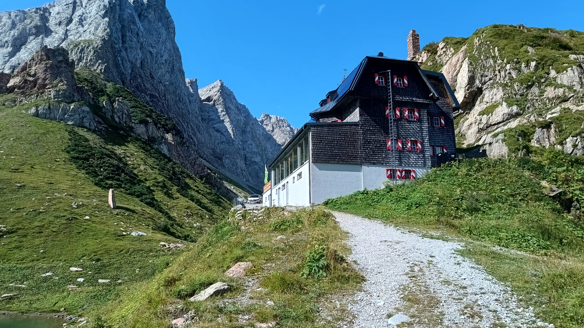D’ici je rallie en peu de temps le refuge de Wolayerseehütte, dont les intérieurs luxueux font davantage penser à un hôtel. Les lieux semblent être assez fréquentés en temps normal, étant accessible depuis le côté autrichien via une piste qui attire de nombreux touristes en vélo à moteur (je ne sais pas si on doit réellement s’en réjouir).