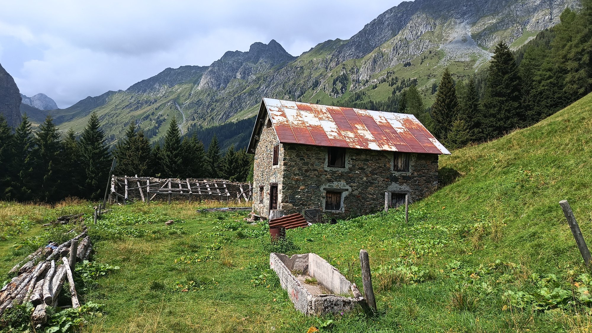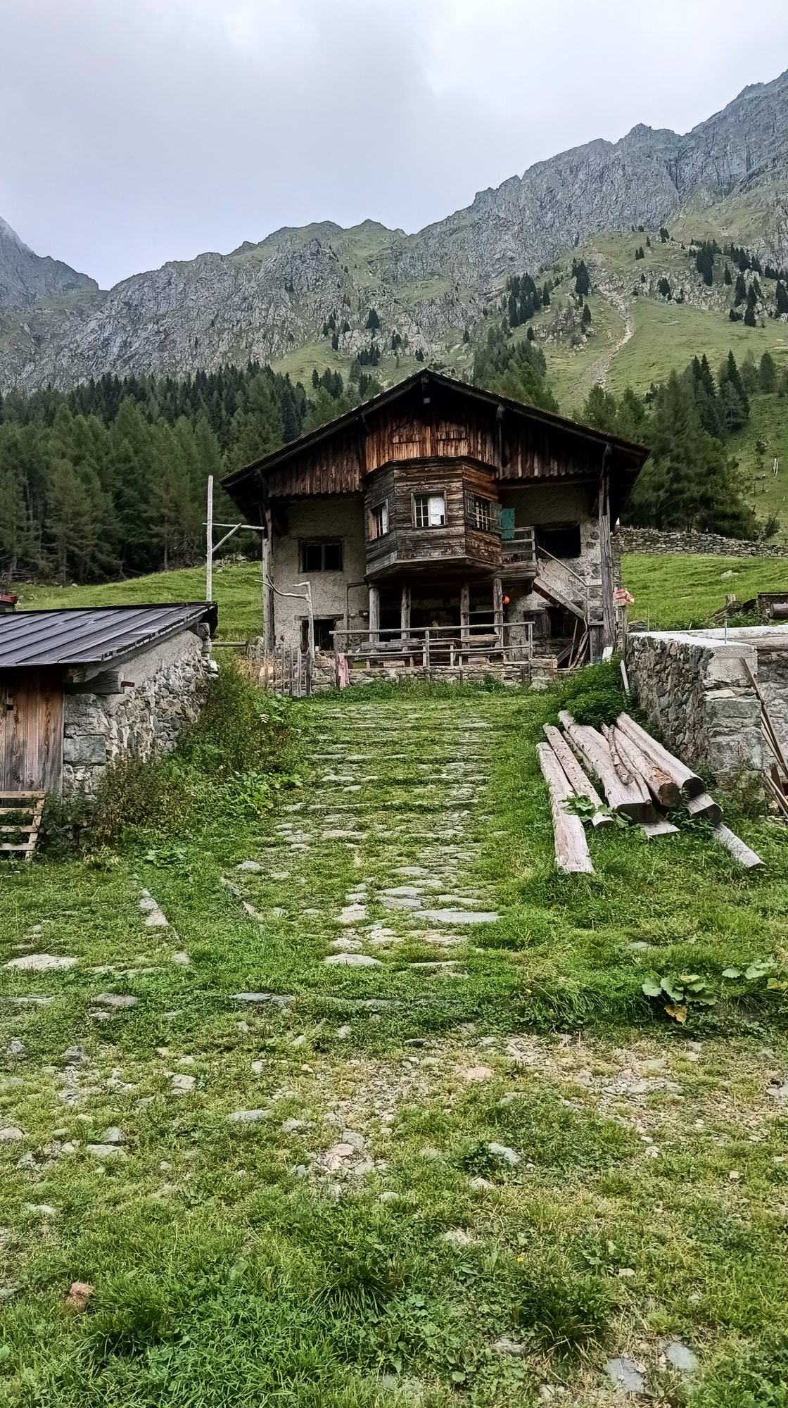 Ce matin bonne nouvelle : c’est couvert mais il ne pleut pas. Je traîne un peu devant le petit déjeuner gargantuesque (décidément une adresse à retenir) et ne quitte les lieux qu’à 7h45. Une grosse journée m’attend avec 1800 mètres de dénivelé, dont une bonne moitié à gravir tout de suite pour atteindre le col de Valentintörl (2138 m). Je décide d’y aller doucement et d’économiser cuisses et mollets en suivant la piste carrossable tant que c’est possible. C’est un poil plus long mais les pourcentages sont beaucoup plus cléments que sur le sentier qui coupe tout droit à travers les lacets. La piste s’arrête à l’altitude 1550m, devant l’alpage d’Oberer Valentinalm, perché sous les parois gigantesques du groupe du Kellerspitzen (2774 m). Contrairement à Straniger Alm pas de vaches ni de fromage ici, le bâtiment n’est plus en service et il ne reste en bas que l’activité touristique dont j’ai profité hier.