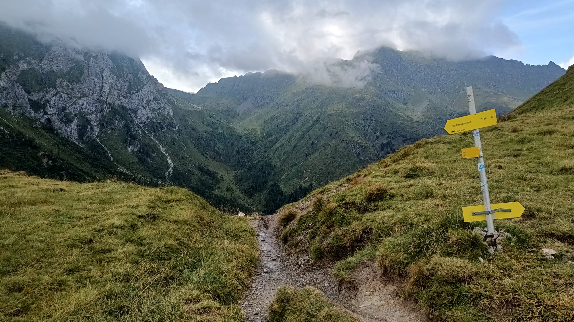 Mais après la pluie à défaut du beau temps vient au moins un temps sans pluie, et je m’en satisfait pleinement pour la dernière ascension de 400 mètres me faisant retournant en Autriche via le col de Öfner Joch (2011 m). J’avais envisagé un instant de repasser sur le versant italien sud pour dormir au refuge « Pier Fortunato Calvi », mais cela aurait supposé encore 300m de dénivelé supplémentaires, et j’estime en avoir eu assez. Ce sera donc une nuit à la « Hochweißsteinhaus ». Laissant un rare troupeau de moutons derrière moi (et rassuré de ne pas avoir rencontré le patou le gardant, un panneau plus bas alertant de la possible présence du monstre et du comportement à adopter si je venais à le croiser), je passe le col à 16h00 tout rond et atteins mon refuge autrichien à 16h20.