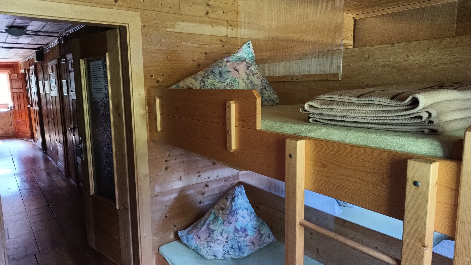Je pénètre alors dans un bâtiment vénérable, construit en 1927 et haut-lieu de la vie montagnarde locale. Par contre, c’est blindé de monde car un club de randonnée y a prévu son étape du soir. Puisque c’est très grand, on me trouve quand même une place, mais l’organisation est un peu militaire : place de dortoir numérotée, distribution d’une petite fiche pour y noter toutes ses consommations, et repas servi comme à la cantine. Il me faudra d’ailleurs choisir les plats à l’avance, puis trouver une place dans le réfectoire surchargé, avec les différents services qui prennent une éternité (amuse-bouche, soupe, plat principal etc etc). Le repas durera bien 1h30, et ce soir avec la présence du large groupe c’est la fête : ça picole, ça parle fort. Je n’ai envie que d’une chose, c’est de me poser dehors au calme avec ma bière, face à la montagne.