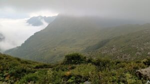 Alors qu’on se rapproche enfin de la fin du repas, j’aperçois par la fenêtre 2 silhouettes qui descendent du col en direction du refuge. Je crois les reconnaître et petit à petit mon intuition se confirme : il s’agit du couple de français que j’avais rencontrés à Straniger Alm. Heureux de voir un échappatoire à cette atmosphère un peu trop oppressante et germanophone à mon goût, je les rejoins dès que possible dehors. Nous passerons un moment à échanger sur notre parcours et notre expérience des derniers jours. J’apprends qu’ils sont étudiants, et si dans un premier temps je les avais un peu pris pour des novices car ils partaient tard dans la journée pour arriver tard, c’est en fait plutôt le contraire. Le gars vit à Grenoble et fait du ski rando l’hiver et de l’alpinisme l’été. Quand je leur annonce vouloir prendre la variante demain car le temps est mauvais et le sentier par les crêtes exposé, ça ne les émeut pas plus que ça : ils passeront par en haut quand même. Comment prendre un coup de vieux… J’ai malheureusement pris trop de temps à écrire ce récit, et faute d’avoir amené un carnet de notes cette année, j’ai oublié leurs prénoms, alors que je m’en souvenais parfaitement il y a encore quelques semaines. Coup de vieux numéro 2. En se quittant on se donne rendez-vous au prochain refuge (Porzehütte), sans que je me doute alors que ce n’est pas là que je dormirai demain.