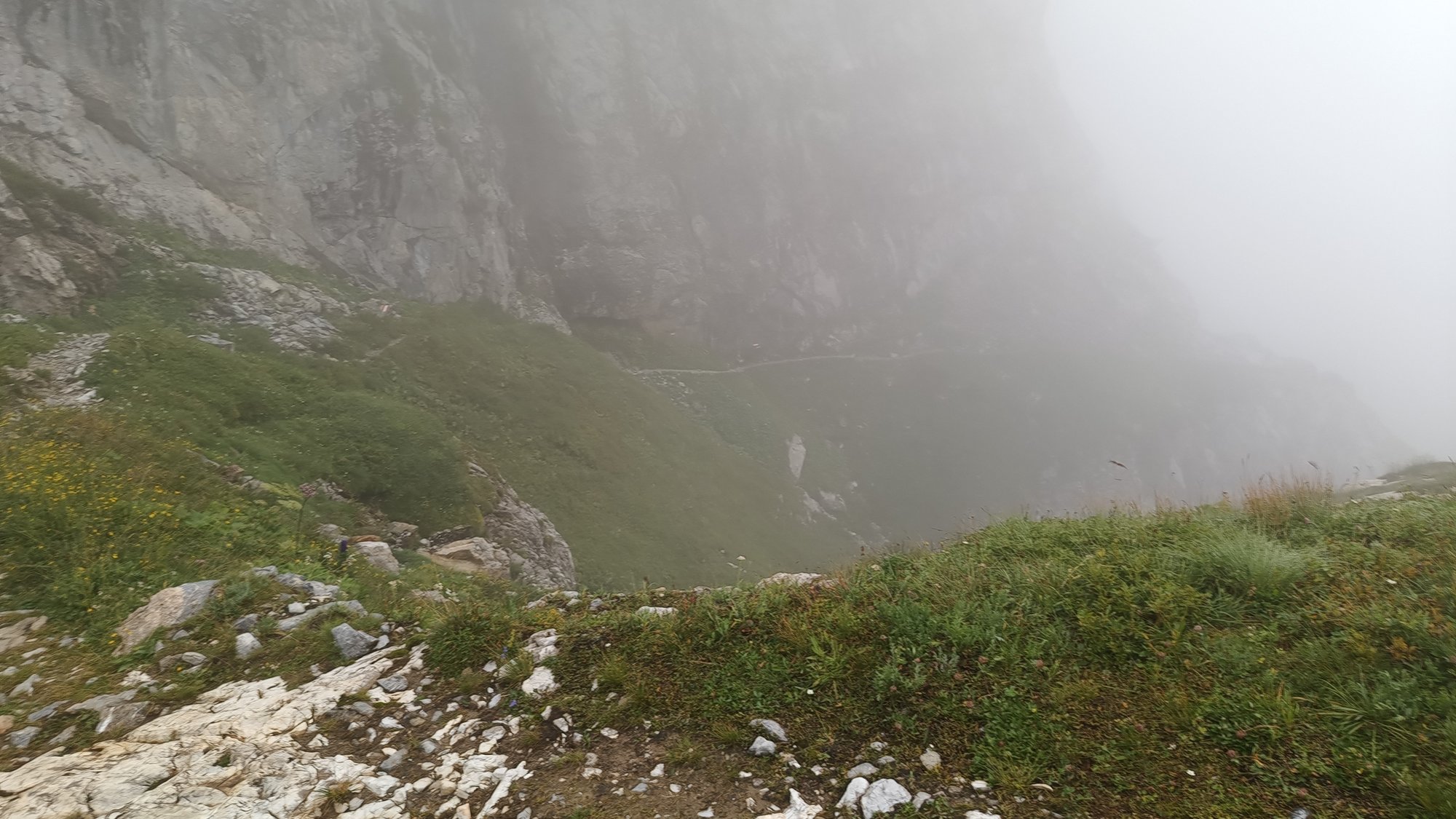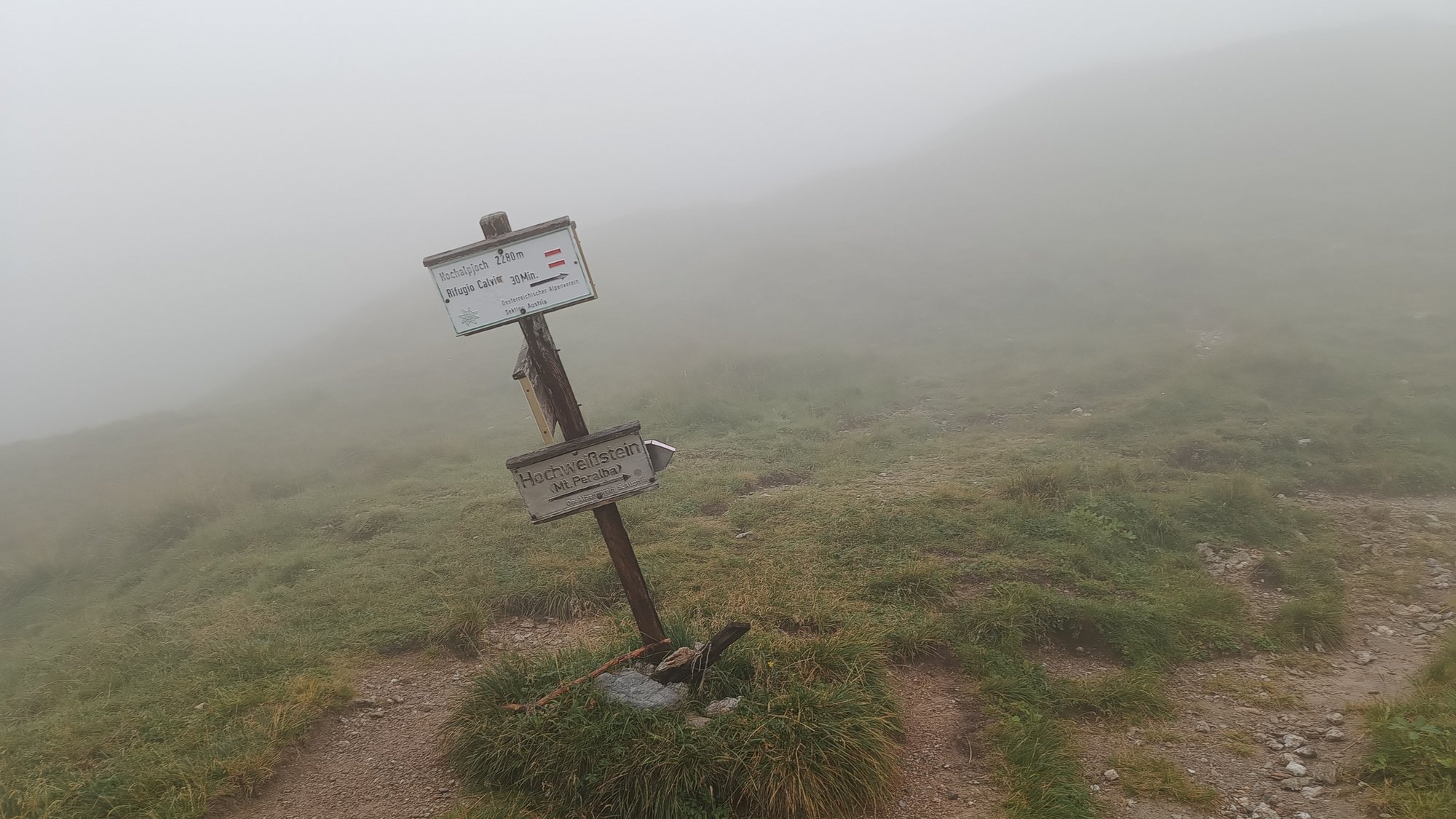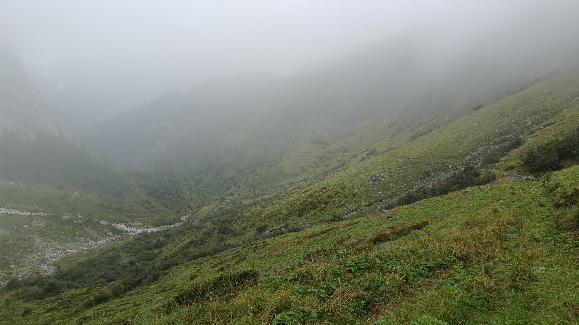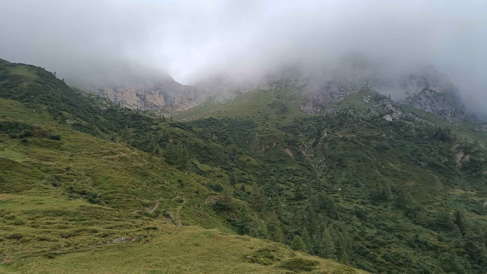 Pour cette étape 22 de la Via Alpina rouge, je dois en principe atteindre la Porzehütte, soit par le sentier des crêtes, apparemment exposé et avec plusieurs passages équipés, soit par une variante côté italien suivant grosso-modo le même itinéraire mais plus bas à flanc de montagne. N’ayant pas envie de jouer au héros, j’ai depuis longtemps tranché pour la seconde option. Pour cela il me faudra néanmoins franchir le col de Hochalpljoch (2281 m), que je vois tout là-haut noyé sous les nuages. En cette heure matinale et avec un taux d’humidité certainement très élevé, il faut être motivé pour se farcir les 400 mètres de dénivelé qui m’attendent…enfin, c’est pas comme si j’avais le choix. Des vaches me tiennent compagnie dans la première partie, mais en grimpant le terrain devient plus hostile et en atteignant le plafond nuageux la visibilité baisse. Tant mieux car à l’approche du col le sentier passe en balcon au-dessus d’un assez haut ravin. Ne rien voir à part le chemin devant moi me convient tout à fait.