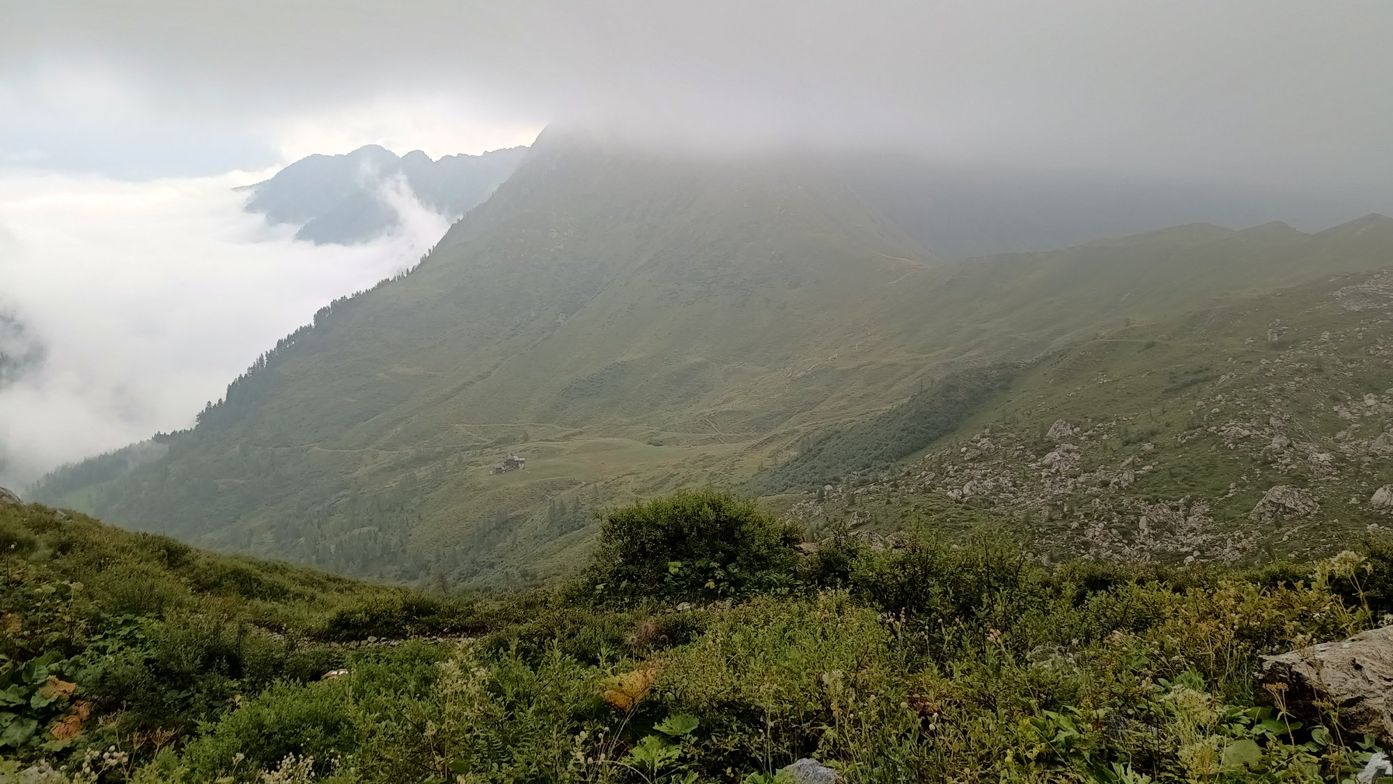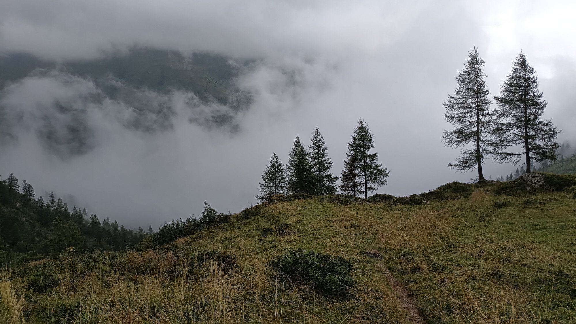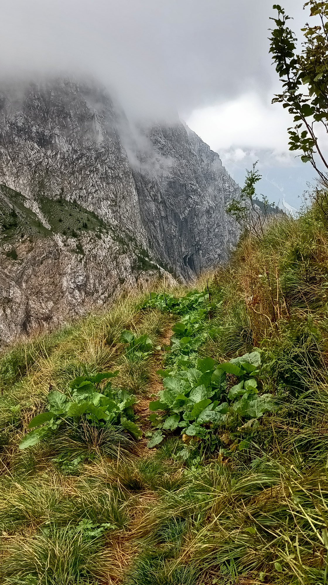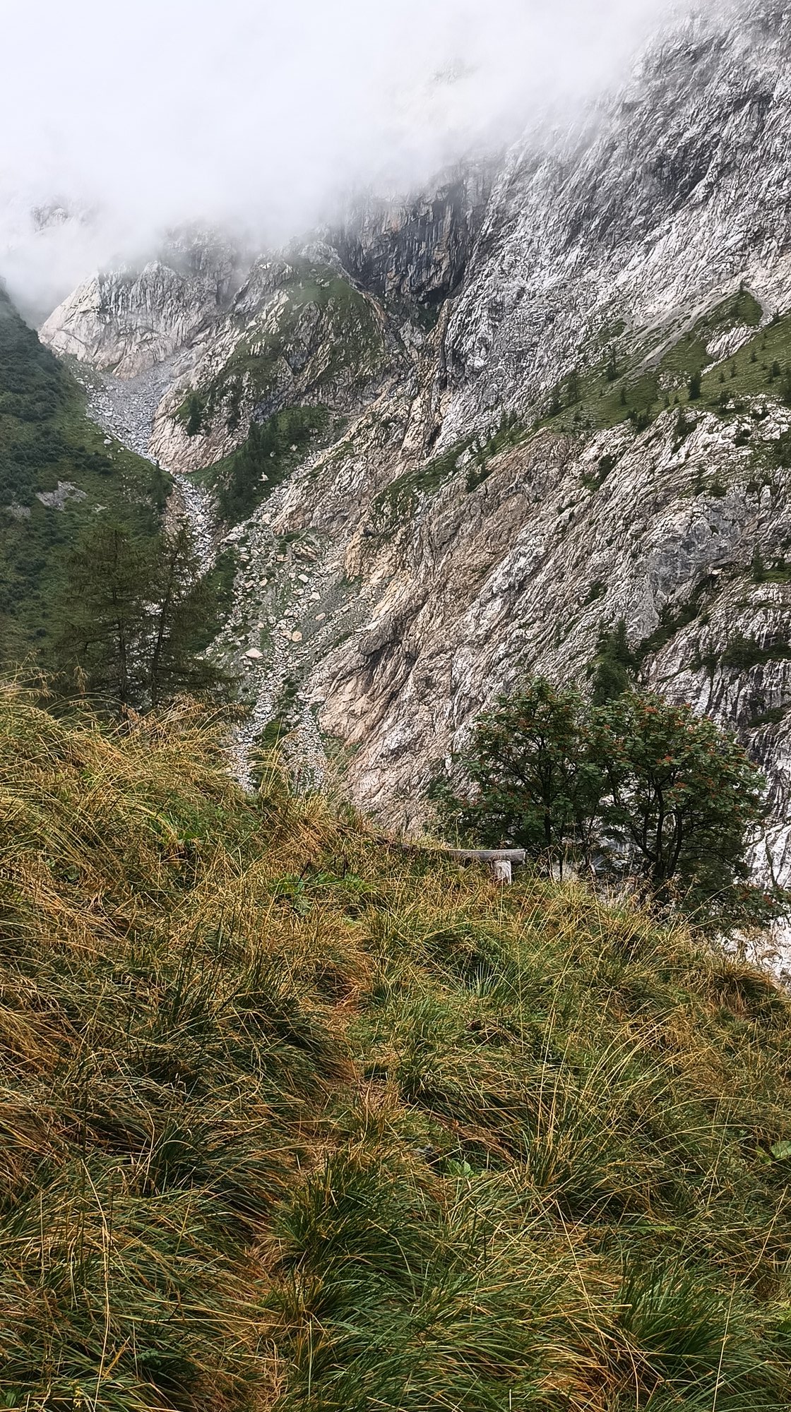 Pour cette étape 22 de la Via Alpina rouge, je dois en principe atteindre la Porzehütte, soit par le sentier des crêtes, apparemment exposé et avec plusieurs passages équipés, soit par une variante côté italien suivant grosso-modo le même itinéraire mais plus bas à flanc de montagne. N’ayant pas envie de jouer au héros, j’ai depuis longtemps tranché pour la seconde option. Pour cela il me faudra néanmoins franchir le col de Hochalpljoch (2281 m), que je vois tout là-haut noyé sous les nuages. En cette heure matinale et avec un taux d’humidité certainement très élevé, il faut être motivé pour se farcir les 400 mètres de dénivelé qui m’attendent…enfin, c’est pas comme si j’avais le choix. Des vaches me tiennent compagnie dans la première partie, mais en grimpant le terrain devient plus hostile et en atteignant le plafond nuageux la visibilité baisse. Tant mieux car à l’approche du col le sentier passe en balcon au-dessus d’un assez haut ravin. Ne rien voir à part le chemin devant moi me convient tout à fait.