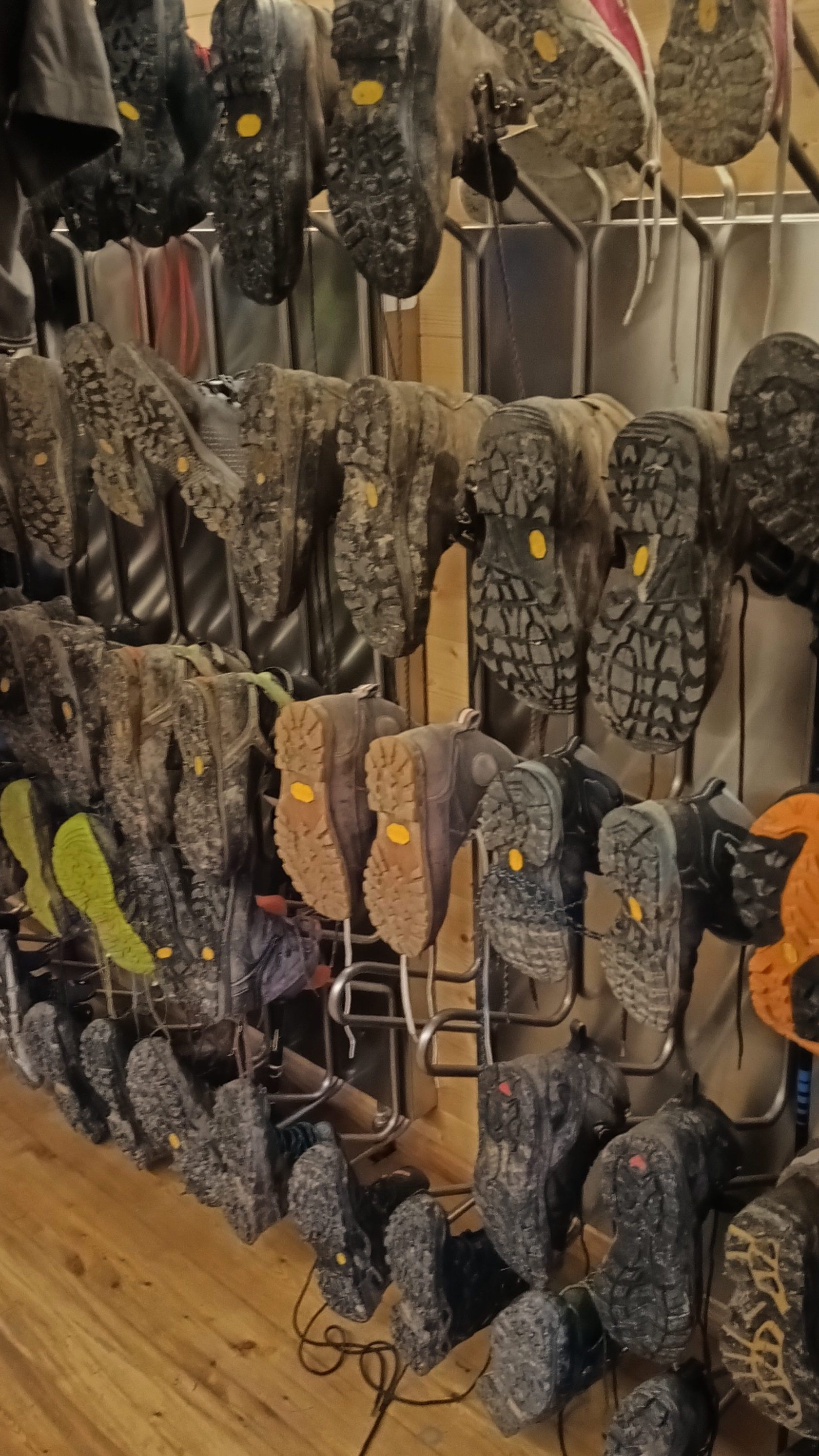 Au réveil c’est la cohue dans le dortoir étroit. Plutôt que de jouer des coudes je préfère attendre perché sur ma couchette que les autres occupants finissent de ranger. Après 15 minutes le sol est enfin libéré des tas de sacs et je peux descendre à mon tour pour plier bagage. Résultat je suis le dernier arrivé au petit déjeuner, mais j’en repartirai malgré tout le premier : à 7h00 je suis dehors et m’apprête au depart. Je récupère mes chaussures dans la cabane de rangement dédiée, et me rends compte qu’ il a plu cette nuit et que j’ai oublié de rentrer mes chaussettes que j’avais mises à sécher sur la rambarde. Ca commence bien, les pieds seront mouillés dès le départ.