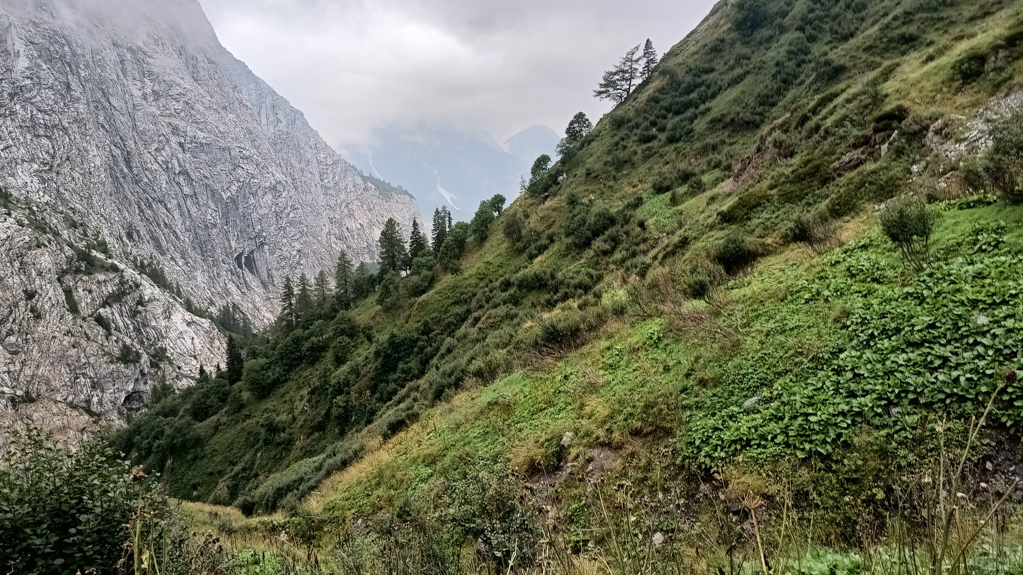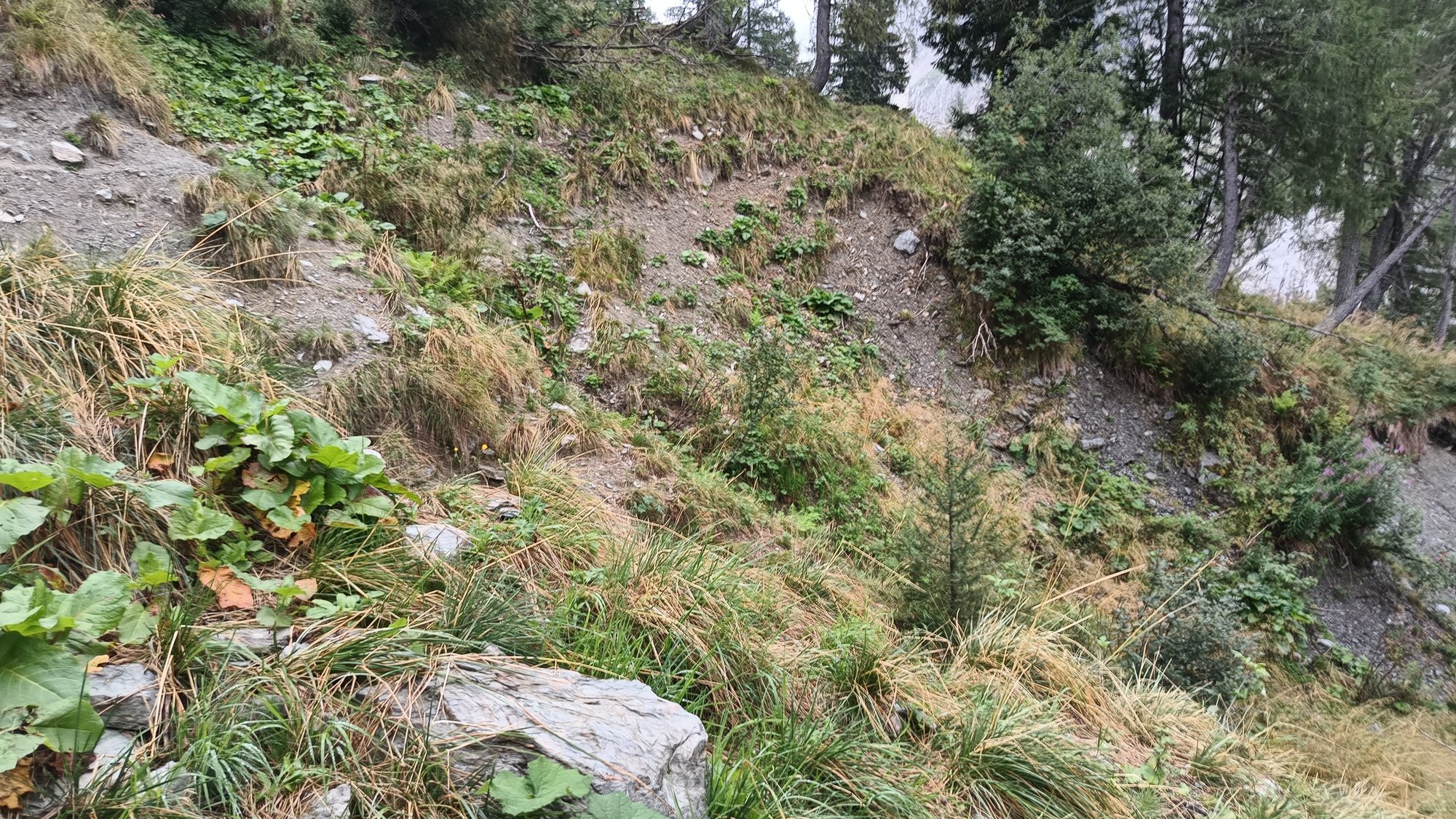 Bien que spectaculaire, la descente particulièrement désagréable depuis le Hochalpljoch me conforte dans ma décision. Pendant près de 45mn je vais évoluer sur une sente très étroite, envahie par la végétation, et éboulée à plusieurs endroits, obligeant à une vigilance de tout instant.