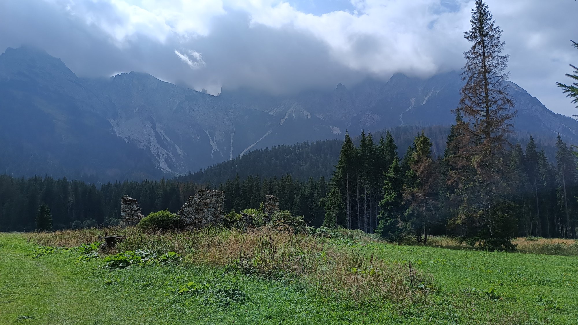 Il est presque 10h lorsque je rejoins enfin une piste qui me permet de marcher sans regarder mes pieds. Ici, je quitte la variante 403a (« chemin des malga ») pour descendre par la 170 vers le Val Visende. Je repasse pour de bon sous le plafond nuageux et à partir de ce moment le ciel va progressivement se dégager, je serai même gâté en milieu de journée par quelques éclaircies. En atteignant le plancher des vaches je suis surpris du nombre de touristes dans cette vallée loin de tout et en cul-de-sac. Ca semble être un endroit prisé pour les balades à la journée. Je croise un groupe qui me demande où se trouve une sorte de monument/mémorial de la guerre, malheureusement je n’en sais fichtre rien.