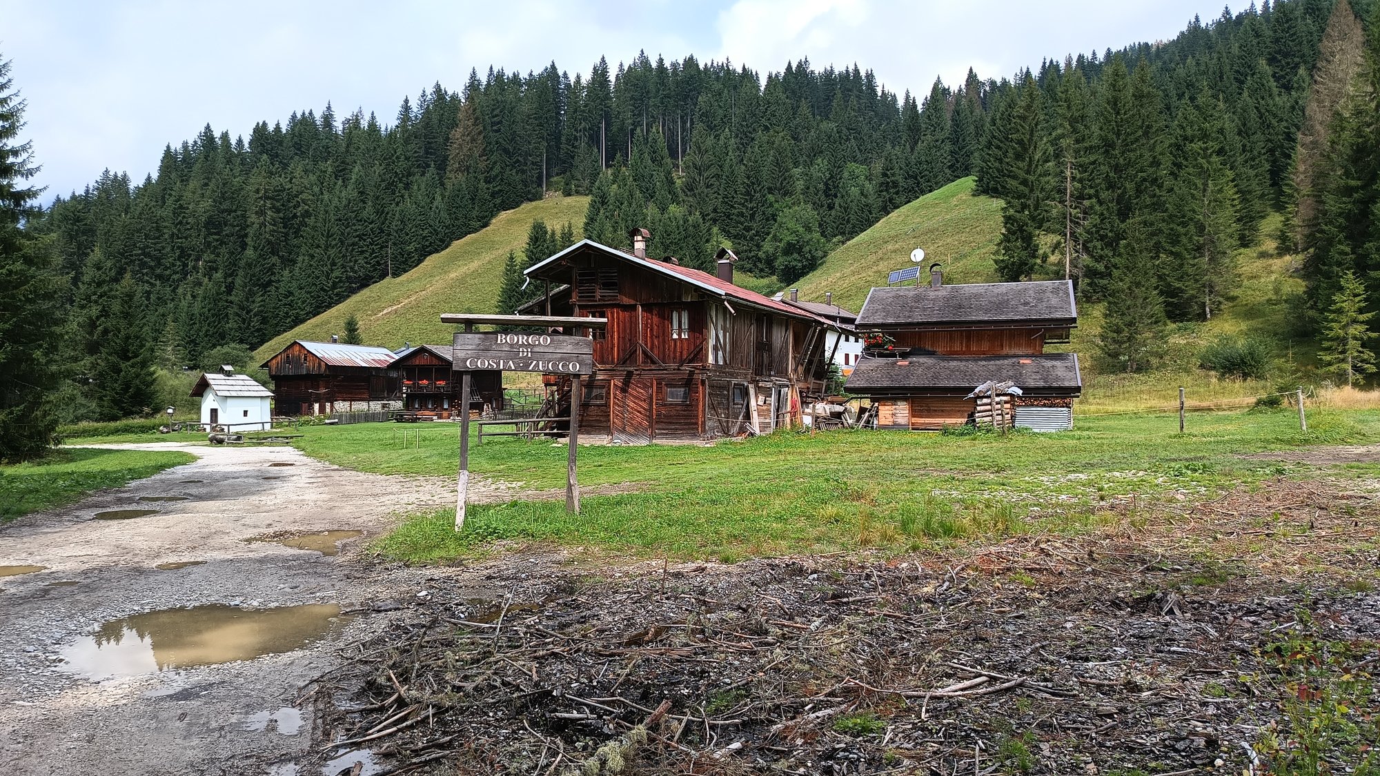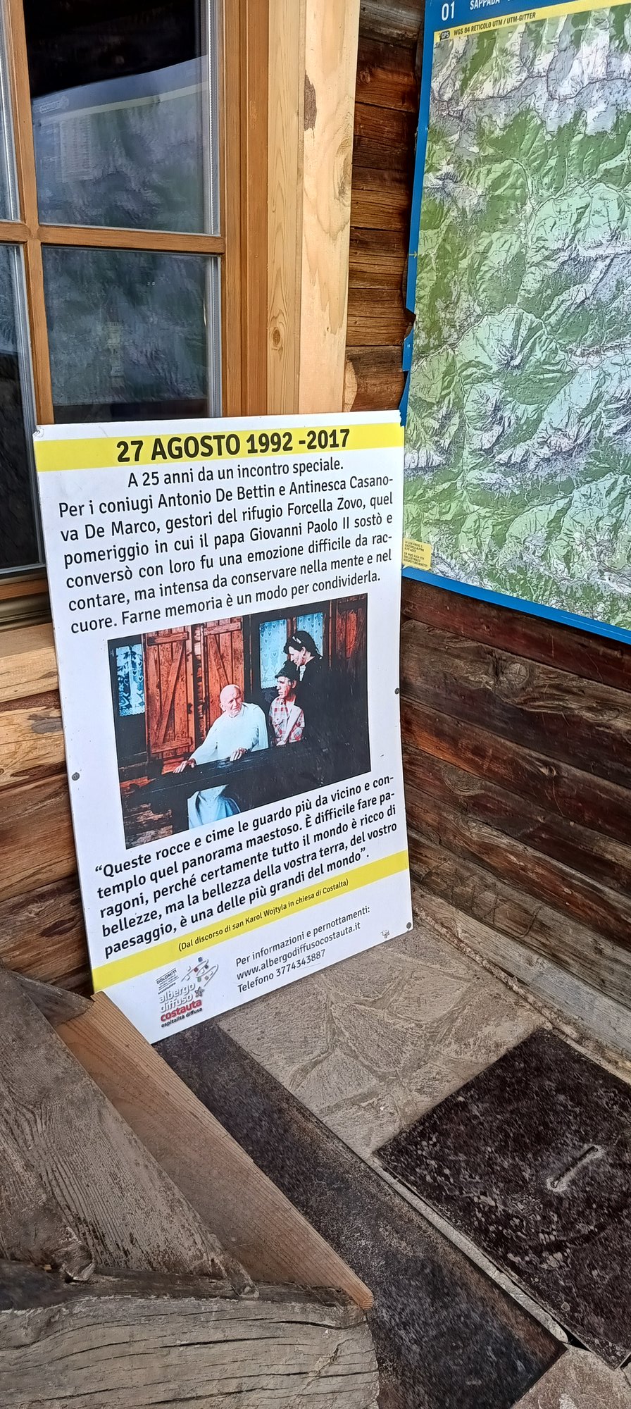 C’est à cet instant que j’apprends par une pancarte la curieuse anecdote concernant ce refuge : il a été visité par le pape Jean-Paul II il y a 30 ans. Il n’usurpe pas en tout cas l’appellation de refuge familial, étant aujourd’hui tenu par un couple et leurs enfants. Le bonhomme qui assure la réception est très sympa, même si la communication n’est pas aisé car il ne parle qu’un anglais limité. On peut voir la famille poser au complet sur leur site : https://www.rifugioforcellazovo.it/ , lequel m’apprend par ailleurs qu’ils ont aussi reçu la visite très récente de Francesco Moser, l’ancien champion cycliste. Vraiment un drôle d’endroit, qui ne me fait pas regretter mon détour…