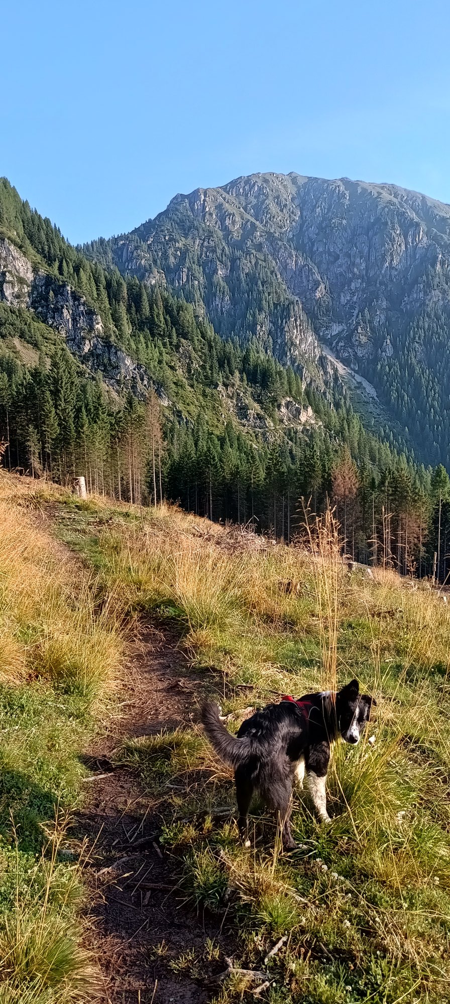 Je m’élance sous un franc soleil à 7h40 sur le sentier 169 en direction du nord et de la Forcella Longerin (2045 m). Le chien du refuge a décidé de m’accompagner, et je tente en vain de le renvoyer chez lui. Je ne m’en inquiète pas outre mesure, me disant qu’il doit régulièrement se servir des promeneurs pour faire sa petite balade, et qu’il finira bien par faire demi-tour tout seul. Après 10mn, alors que je le prends en photo pour un souvenir, j’entends derrière une voix et un sifflement : c’est son propriétaire qui est venu chercher le fuyard. En effet ça ne devait pas être sa première fois…