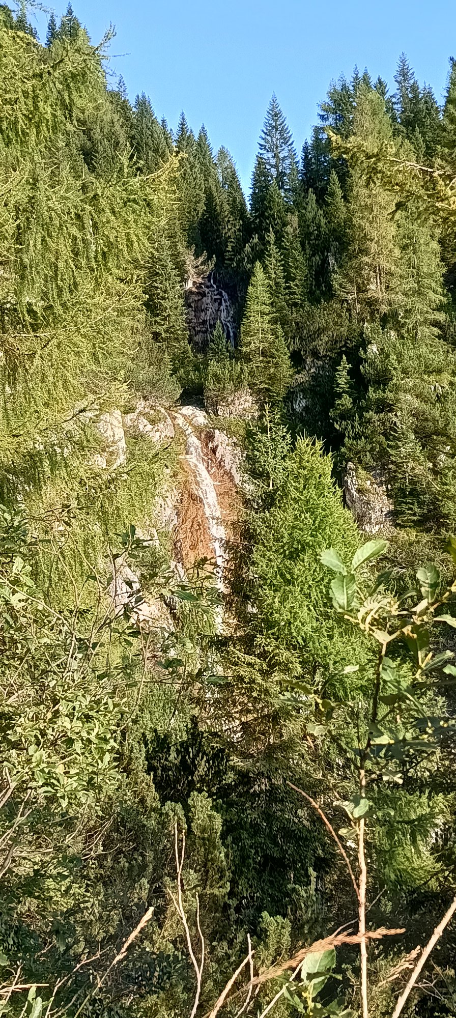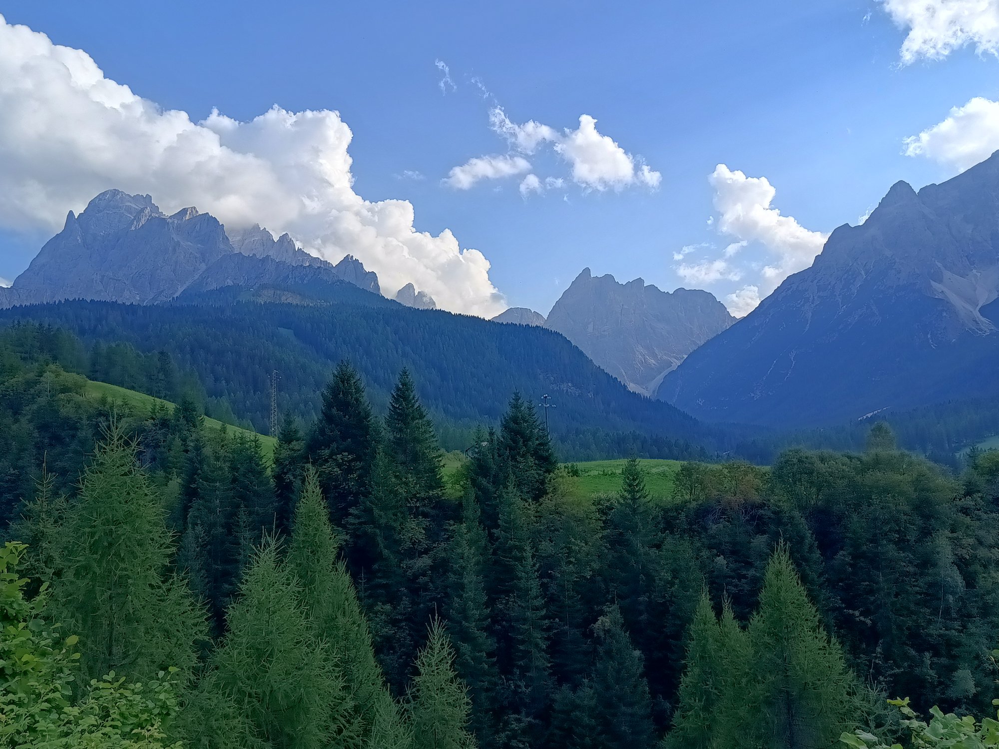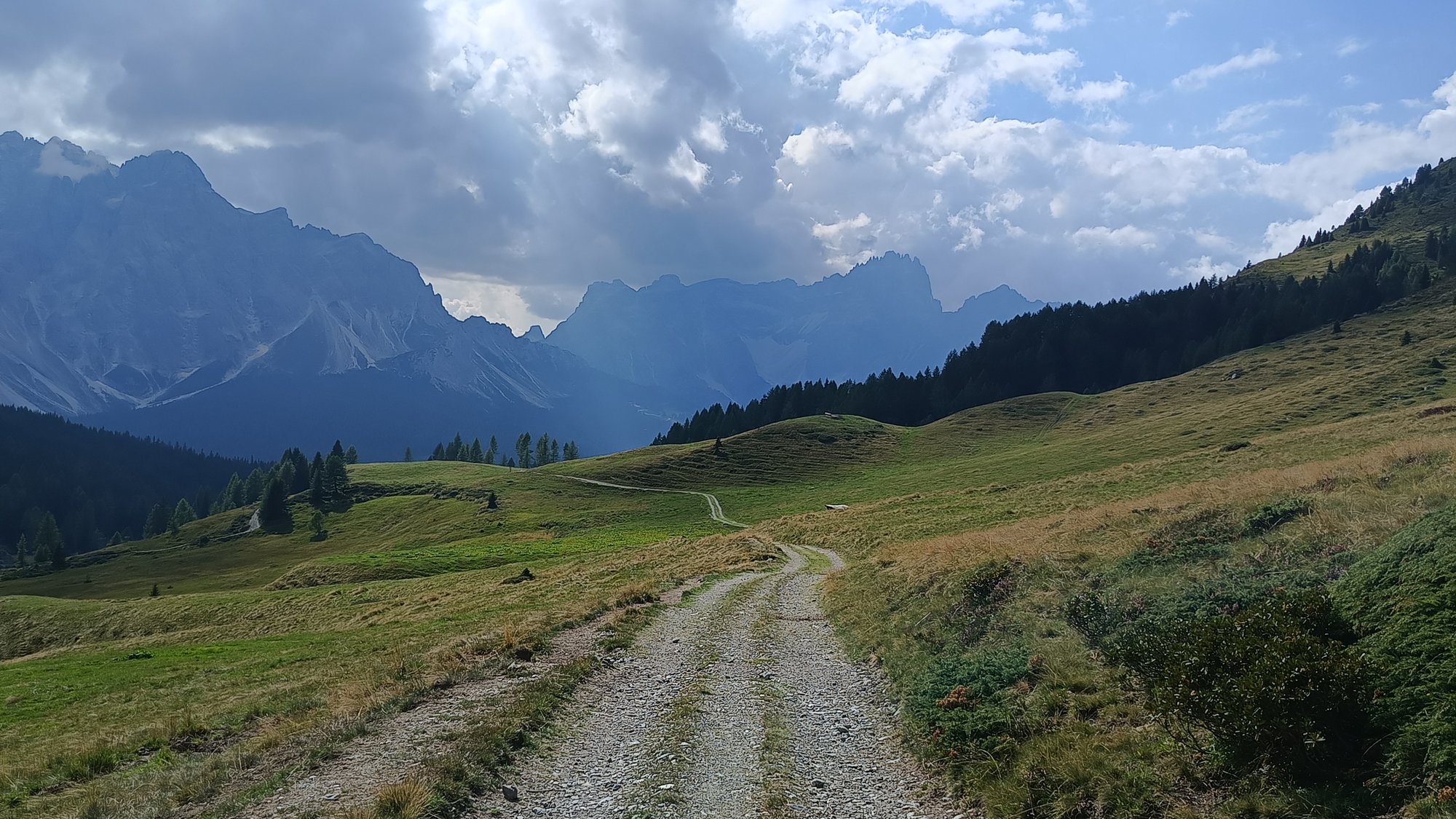 A 14h45 j’atteins le col, et y croise la route de fous cyclistes qui ont grimpé par l’autre versant, pourtant bien moins roulant. J’avais initialement prévu de dormir au refuge Rinfreddo, qui promet de splendides vues sur les Dolomites. Mais celui-ci ne se trouve plus qu’à une heure de là : je suis largement en avance sur mon objectif et je juge qu’il est bien trop tôt pour s’arrêter. Je fais donc le choix de parcourir la douzaine de kilomètres qui me séparent encore de Moso, un village à quelques encablures de Sesto, et ainsi conclure ma Via Alpina 2024 ce soir. Ainsi si tout va bien je pourrai prendre un bus le matin pour la gare de San Candido et être la maison dès demain soir.
