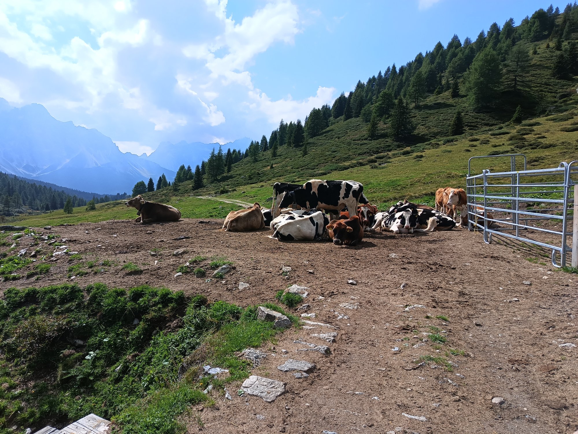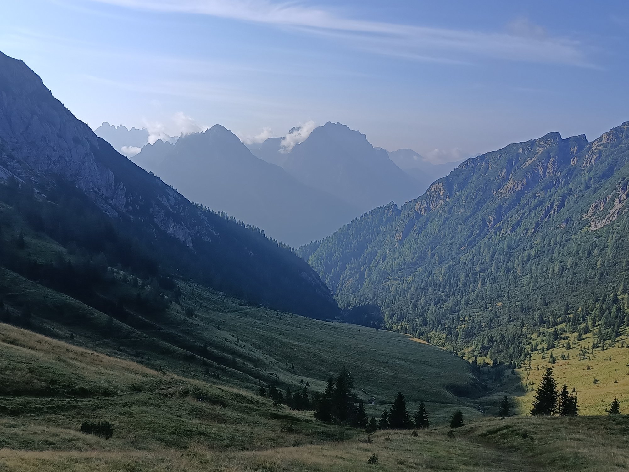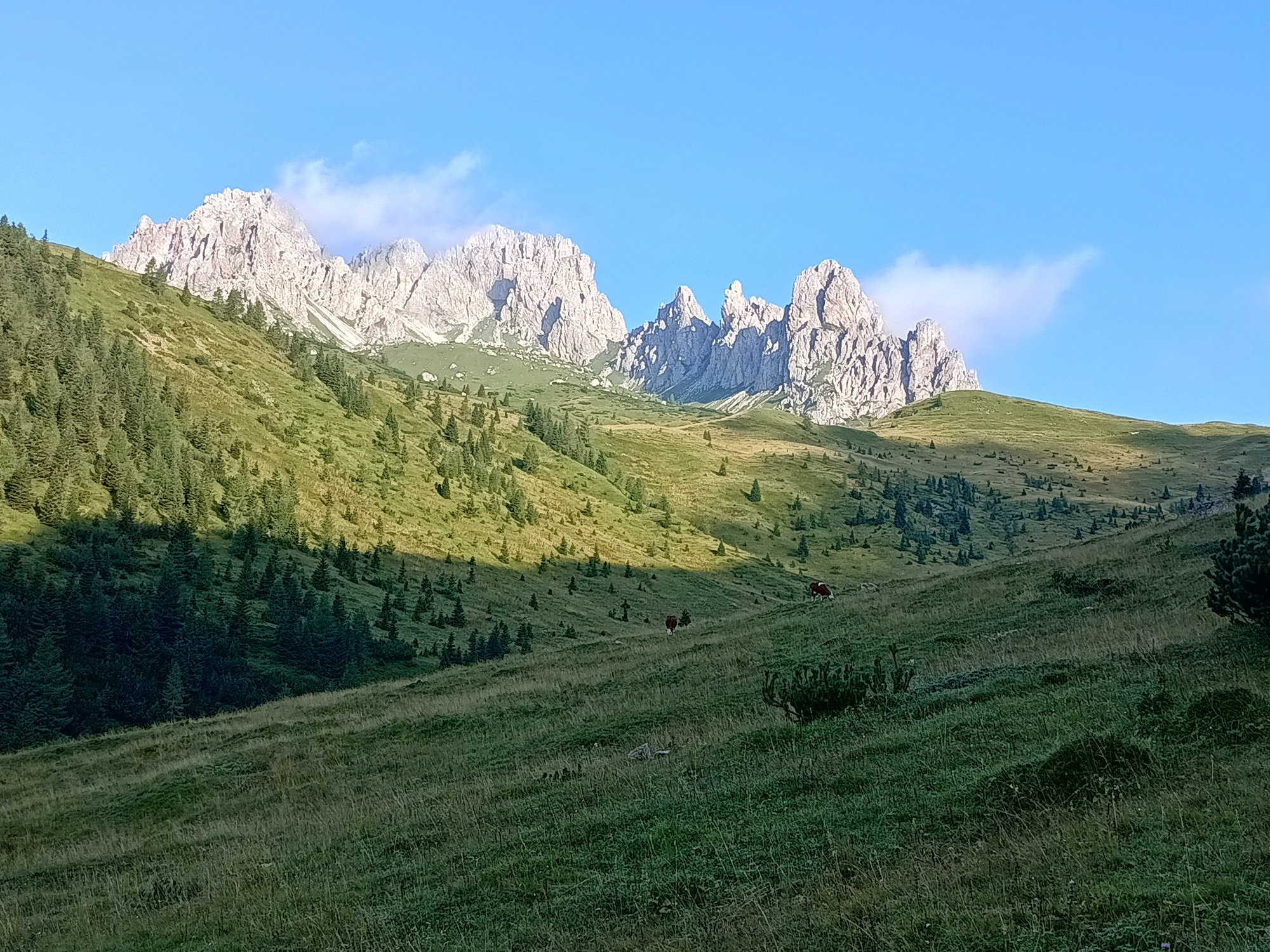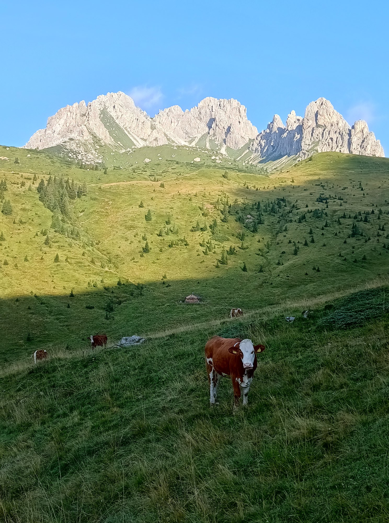 Le chemin passe d’abord au-dessus d’une jolie cascade, puis il me faut enjamber une barrière et marcher le long d’un ruisseau pour pénétrer dans le Val di Vissada. Le paysage devient « dolomitesque », avec des pics rocheux dominant de vastes pâturages, et des vaches qui prennent la pause pour la photo. En me retournant le panorama n’est pas en reste et la vue porte très loin, probablement sur le groupe du Terza Grande (2586m). Alors que je m’approche du fond de vallée je remarque sur l’autre flanc une cabane joliment rénovée, que ma carte indique comme étant le bivouac Casera Vissada. Si j’avais su…ça donne envie d’y passer la nuit en ermitage. Même si je dois avouer que je me suis bien habitué au confort des refuges et leur bonne popote.