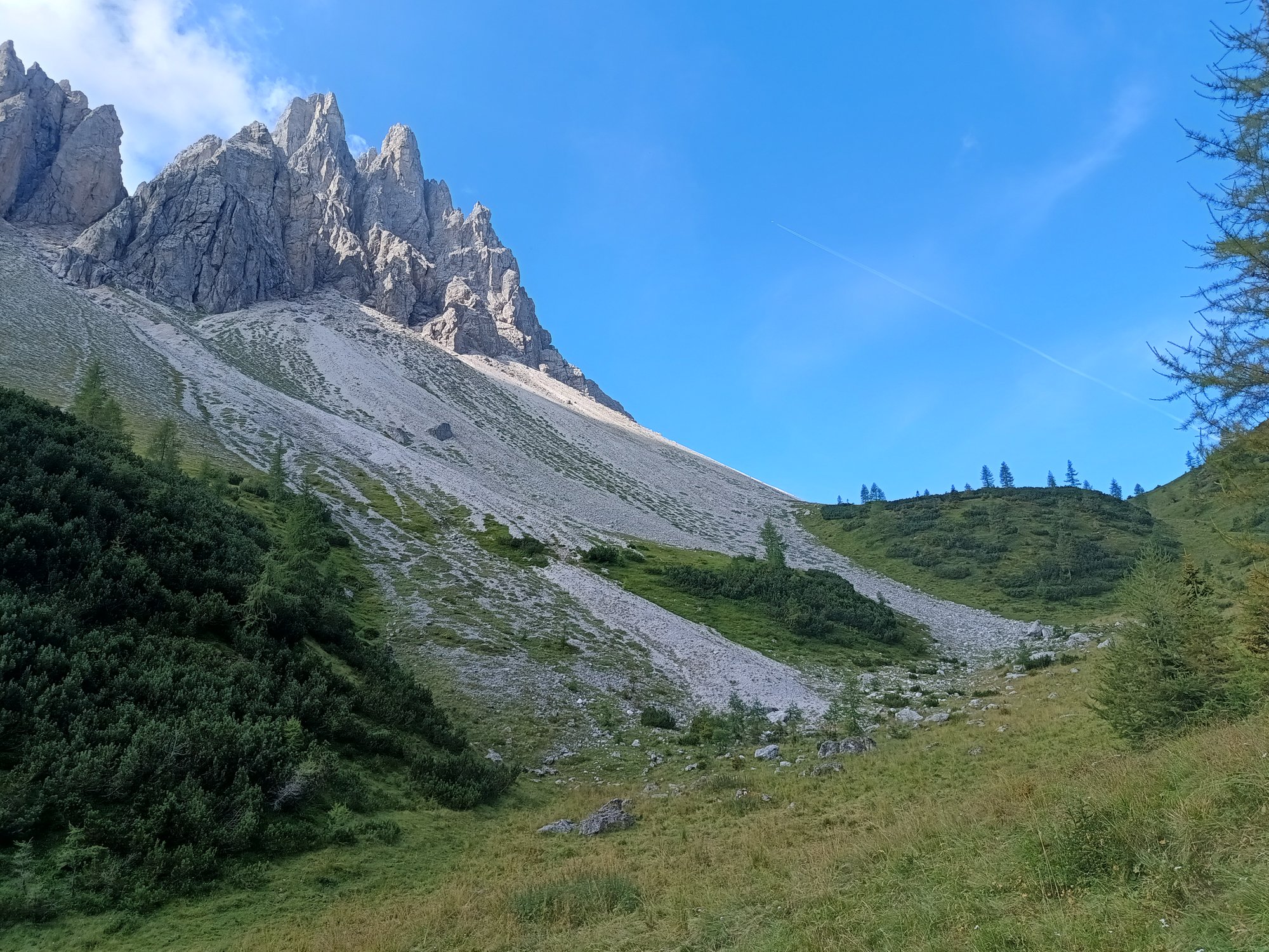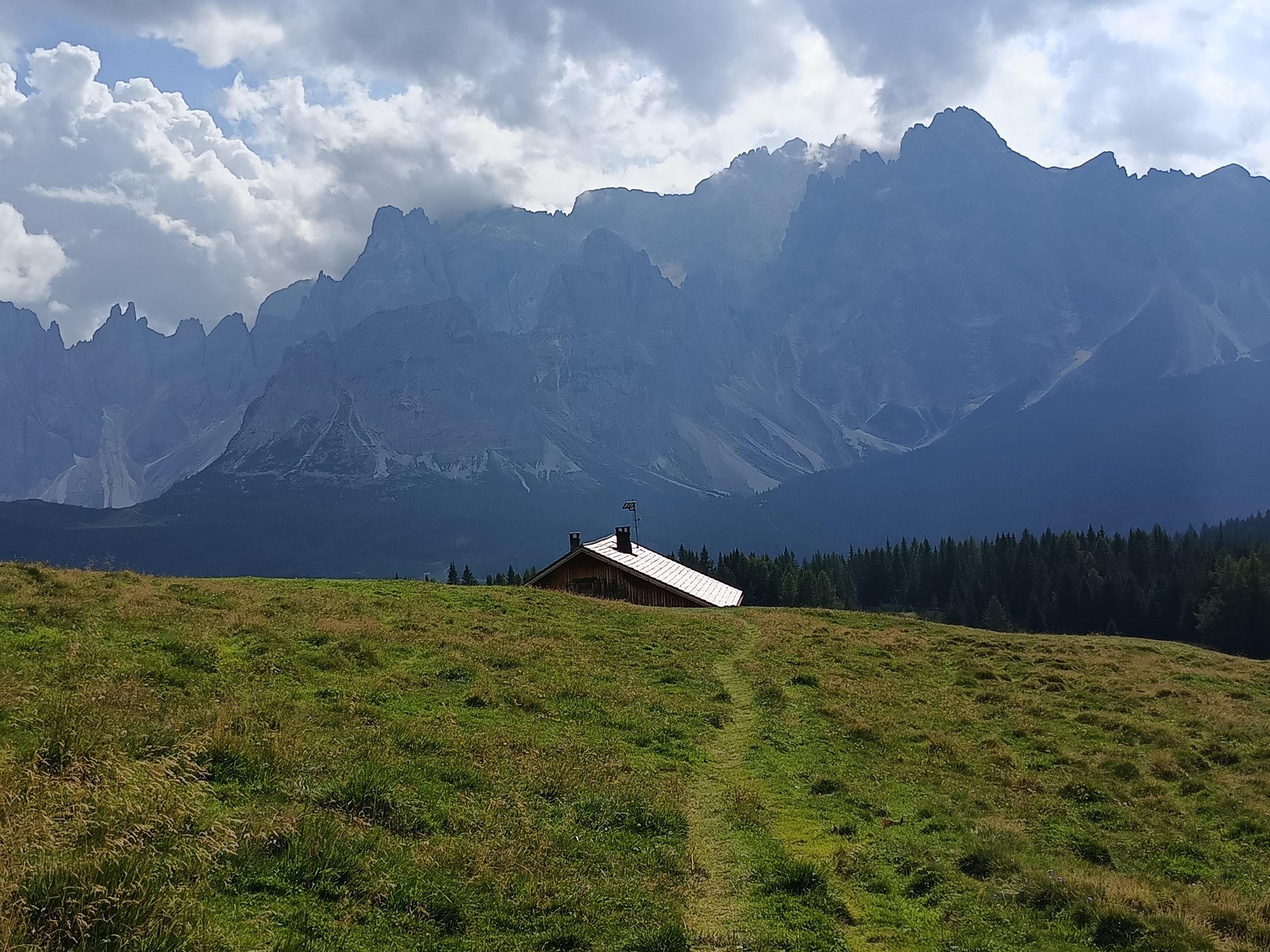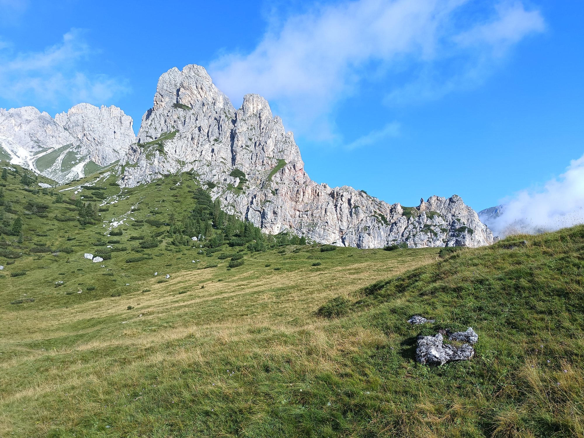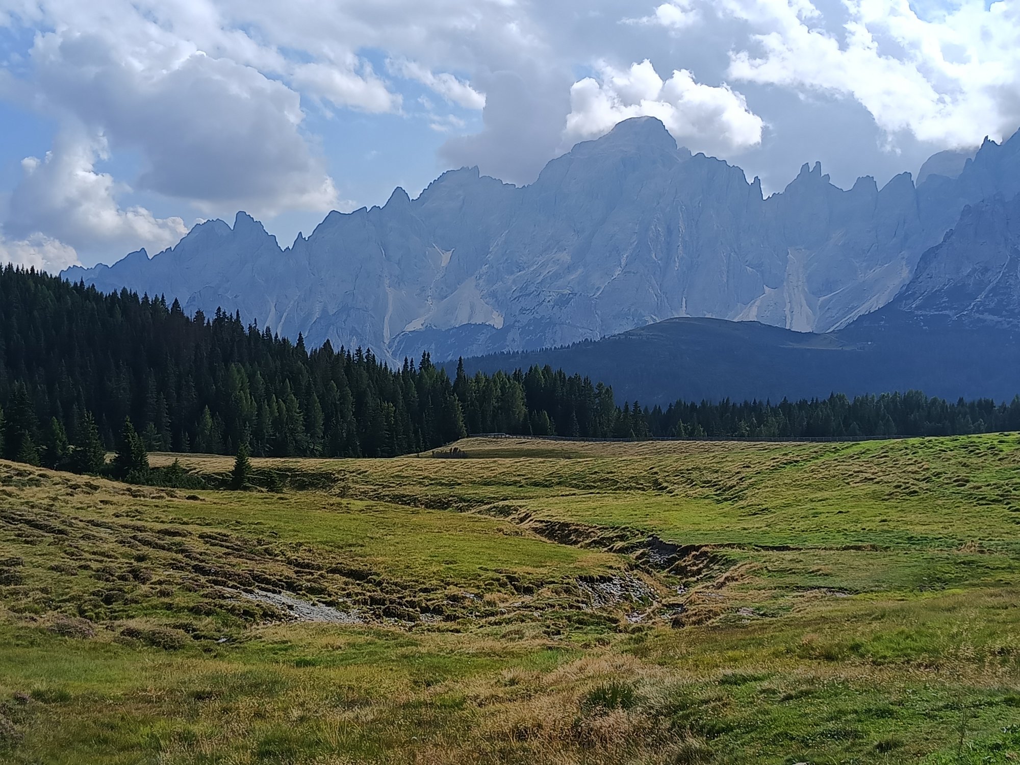 Le chemin passe d’abord au-dessus d’une jolie cascade, puis il me faut enjamber une barrière et marcher le long d’un ruisseau pour pénétrer dans le Val di Vissada. Le paysage devient « dolomitesque », avec des pics rocheux dominant de vastes pâturages, et des vaches qui prennent la pause pour la photo. En me retournant le panorama n’est pas en reste et la vue porte très loin, probablement sur le groupe du Terza Grande (2586m). Alors que je m’approche du fond de vallée je remarque sur l’autre flanc une cabane joliment rénovée, que ma carte indique comme étant le bivouac Casera Vissada. Si j’avais su…ça donne envie d’y passer la nuit en ermitage. Même si je dois avouer que je me suis bien habitué au confort des refuges et leur bonne popote.