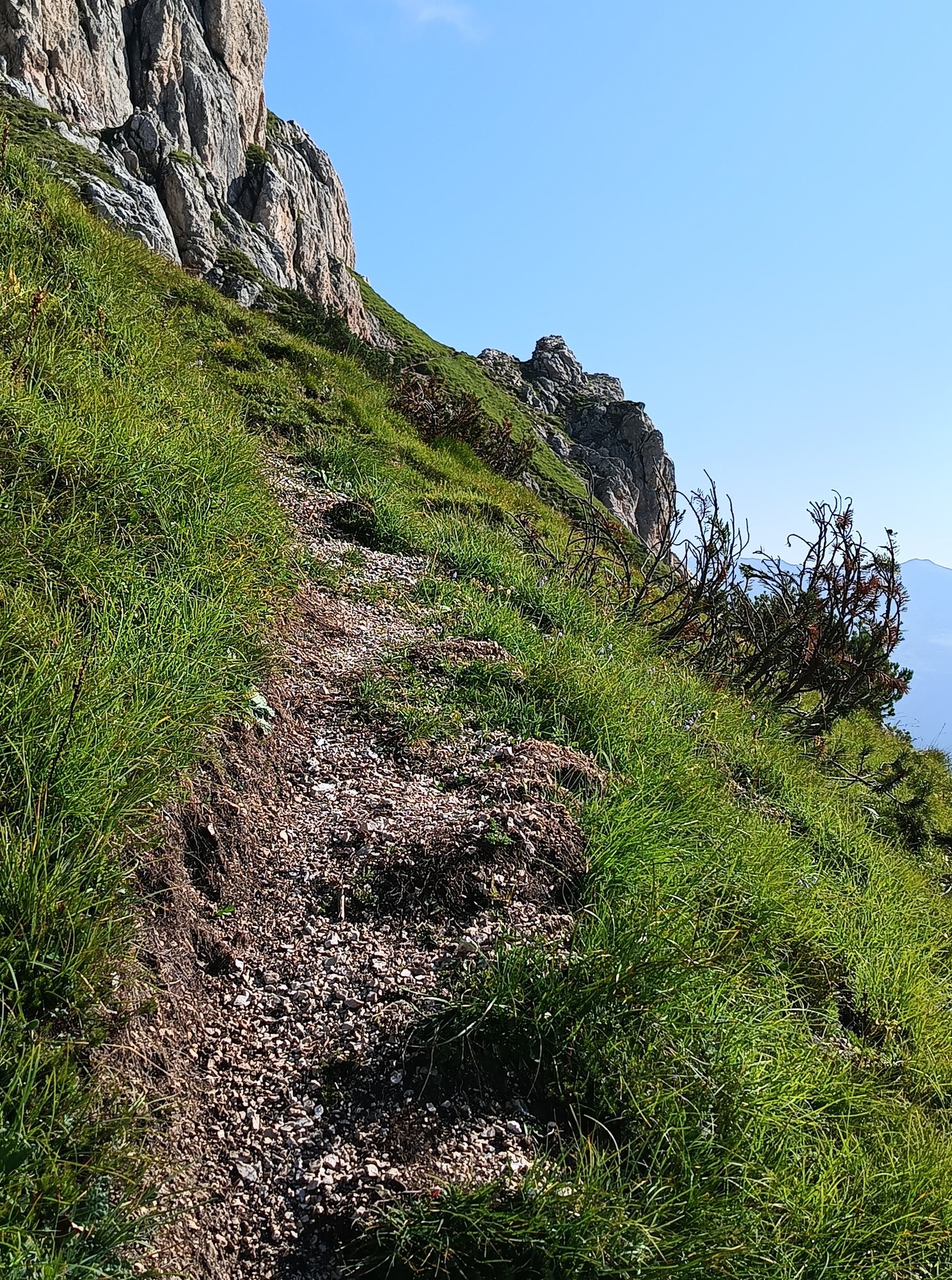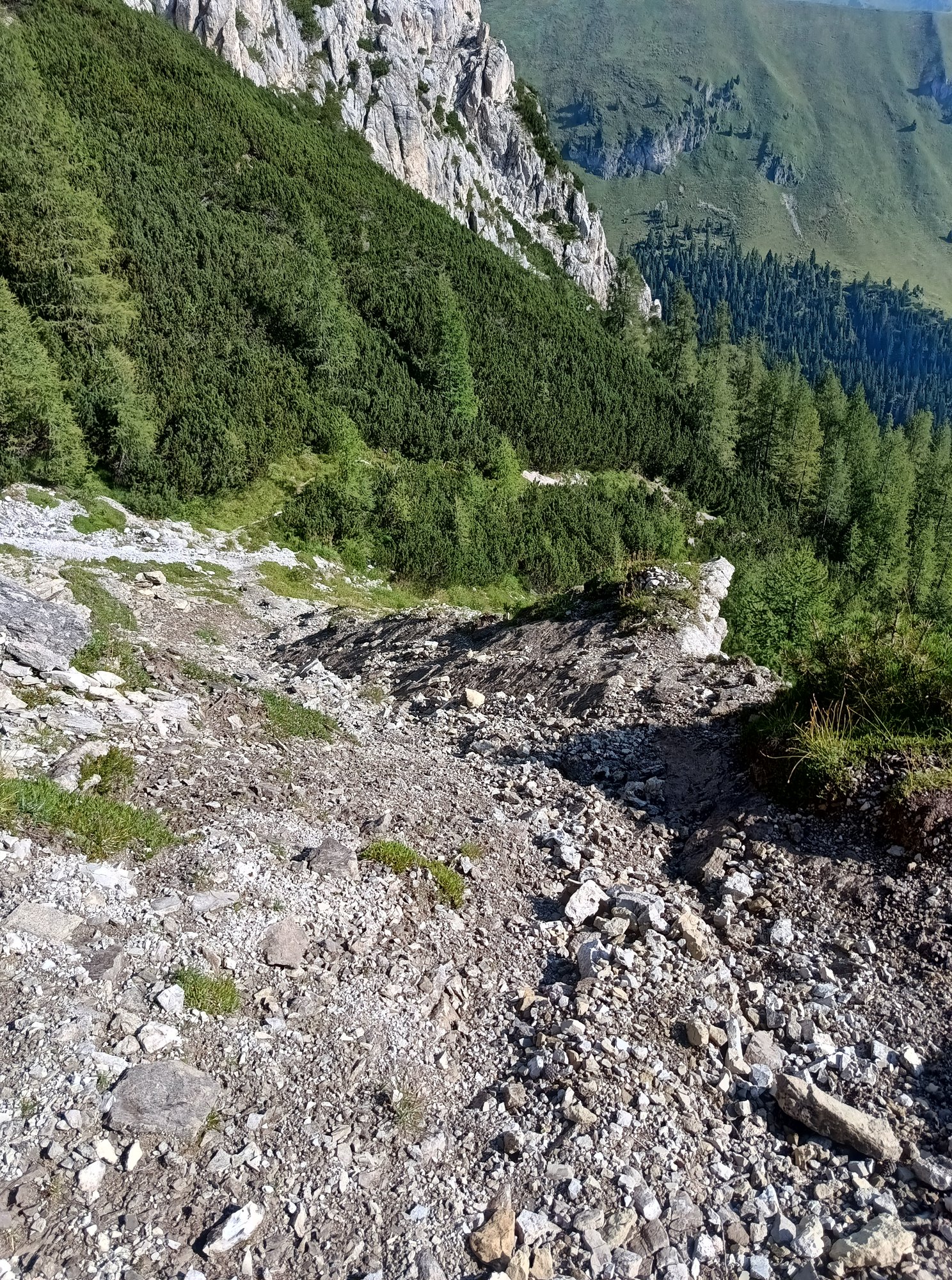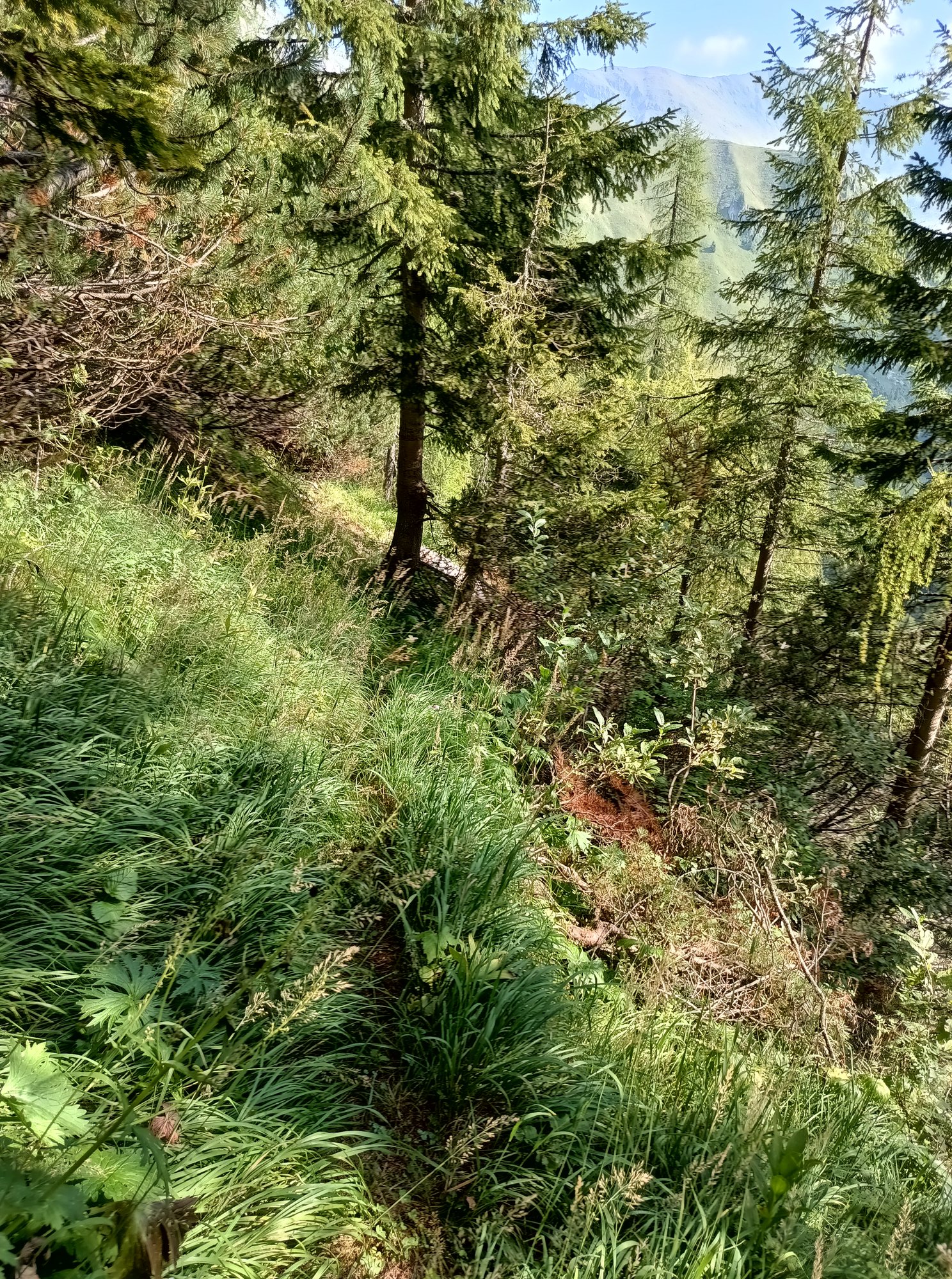 Je décide de m’approcher pour en avoir le cœur net, mais après 10 minutes et presque 100m d’ascension via un raidillon qui m’emmène sur un sentier de plus en plus exposé, je préfère faire demi-tour. Non seulement je marche seul, mais en plus je n’ai croisé personne depuis ce matin. Une glissade, une cheville qui tourne dans cet endroit isolé et j’aurai l’air malin…le jeu n’en vaut pas la chandelle. Je redescends alors au col Longerin pour prendre le sentier 169, c’est plus long et davantage de dénivelé mais plus prudent. Ca ne sera pas pour autant une partie de plaisir, le début étant très pentu, érodé et recouvert de petites pierres, pour ne pas dire franchement casse-gueule. Quant à la suite, elle me réserve une difficile et longue traversée en pleine végétation, sur une sente à peine visible.