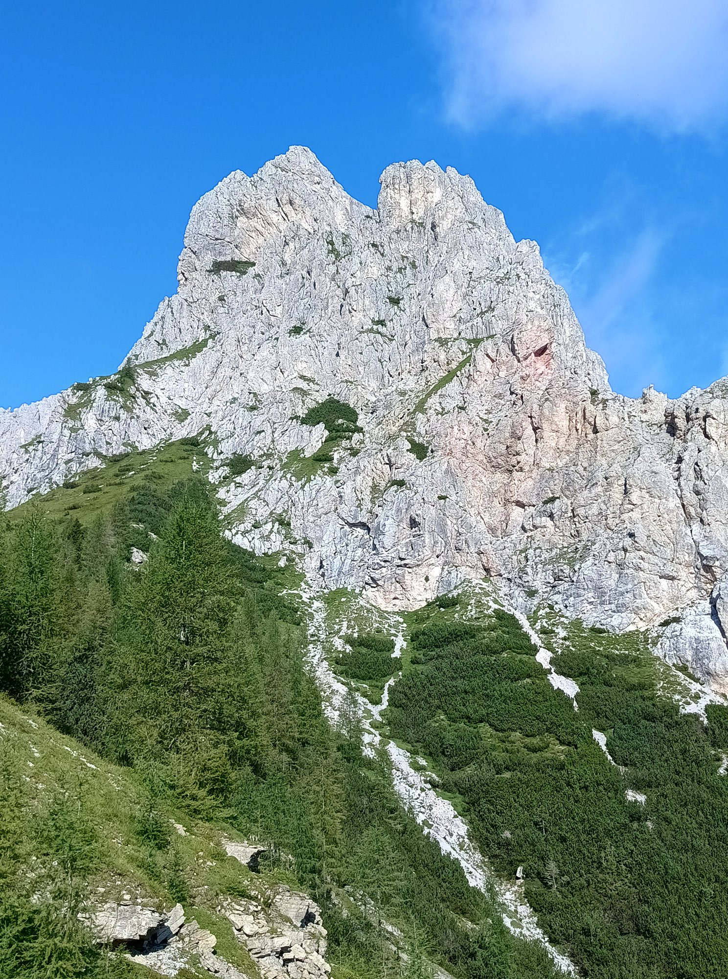 A 9h00 j’atteins le premier col, d’ici il me faut continuer vers le Passo Palombino (2023m) pour gagner le Val Digon. J’ai une incertitude sur la voie à prendre, le chemin 165 est le plus direct mais semble passer dans des endroits pas très accueillants, à vrai dire de loin il est difficile de dire par où exactement il traverse la barre rocheuse.