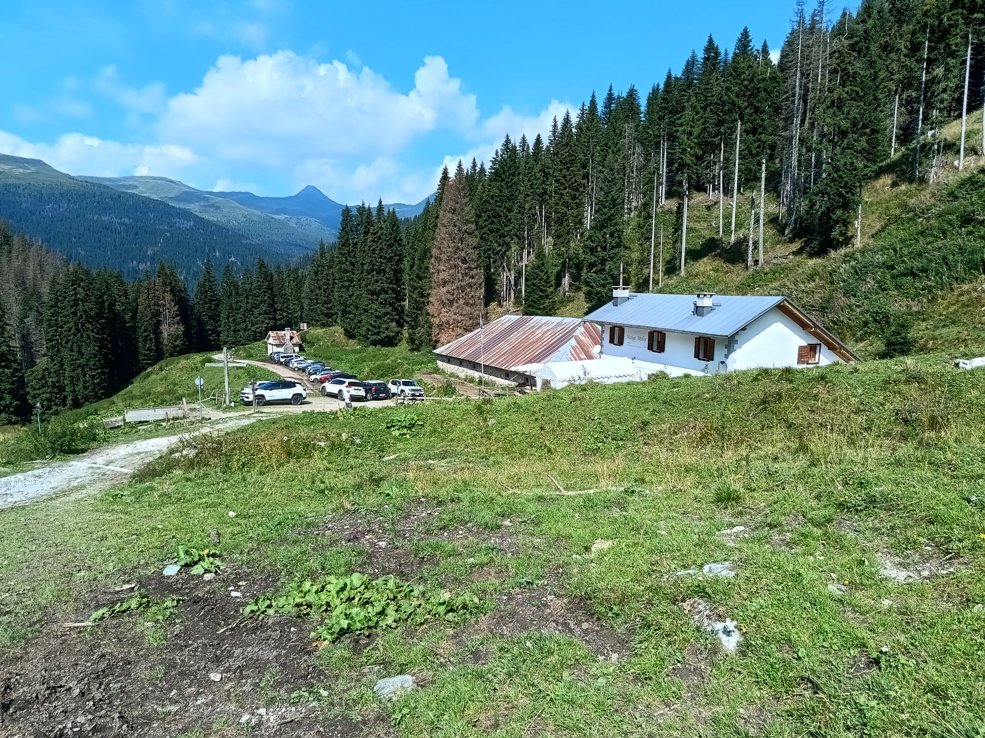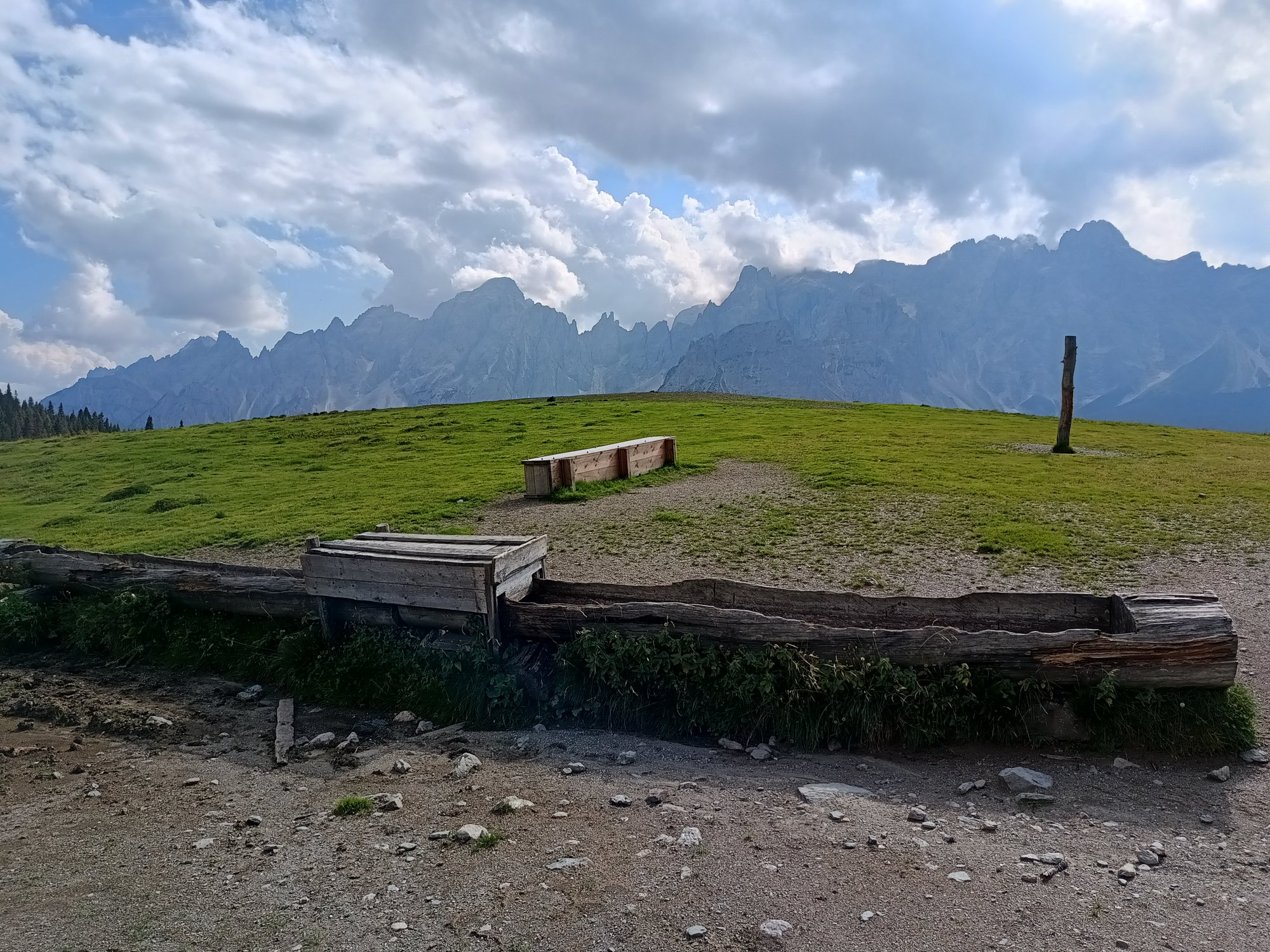 Un peu plus loin au détour d’un virage je découvre la Malga Nemes. Le panorama depuis l’auberge est fantastique et après tant d’efforts je mérite bien une bière. Voire même ne serait-il pas possible de dormir ici ? Il semble en effet que ca a été un refuge à une époque. Même s’ils font maintenant exclusivement de la restauration, je pose la question à tout hasard en allant commander. Après une discussion avec la tenancière qui porte sur mon voyage et ma nationalité (sic), elle se tourne vers son mari qui est assis derrière à une table avec les enfants, et lui demande en italien quelque chose qui devait ressembler à « il est français, il cherche un logement », ce à quoi l’homme répond « oui il peut rester dormir » (je me demande quelle aurait été la réponse si mon passeport avait été différent…)