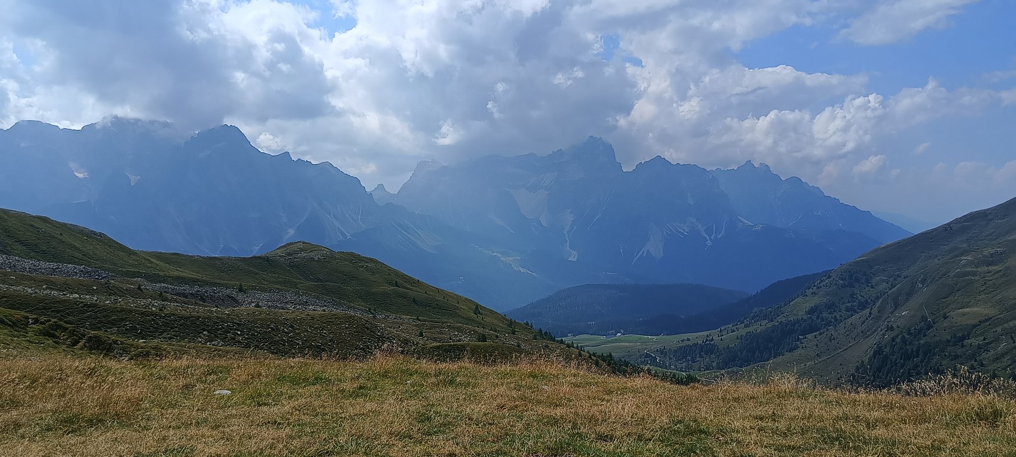 En effet la route du Val Digon me permet de progresser rapidement, et vers 13h j’atteins la Malga Silvella à l’altitude 1800m puis pars à l’assaut des lacets vers le col. Je songe alors que s’il était asphalté, ça serait un col intéressant pour le tour d ‘Italie, avec les 8 derniers kilomètres à 10 % de moyenne. Et tel un coureur cycliste, je dois avoir un début de fringale car je ressens une sorte de « coup de mou », n’ayant rien avalé depuis le petit déjeuner il y a 6 heures de cela. Même si je n’ai pas faim je me force à manger un petit en-cas avant de continuer. Puis me mets de la musique dans les oreilles afin de motiver la marche. En s‘élevant le paysage devient grandiose avec ses grandes pentes herbeuses, et fait un peu penser aux Alpes du Sud. Lorsque je me retourne je mesure le chemin parcouru depuis ce matin, avec le Passo Palombino facilement identifiable sous le Crode dei Longerin (2576m).