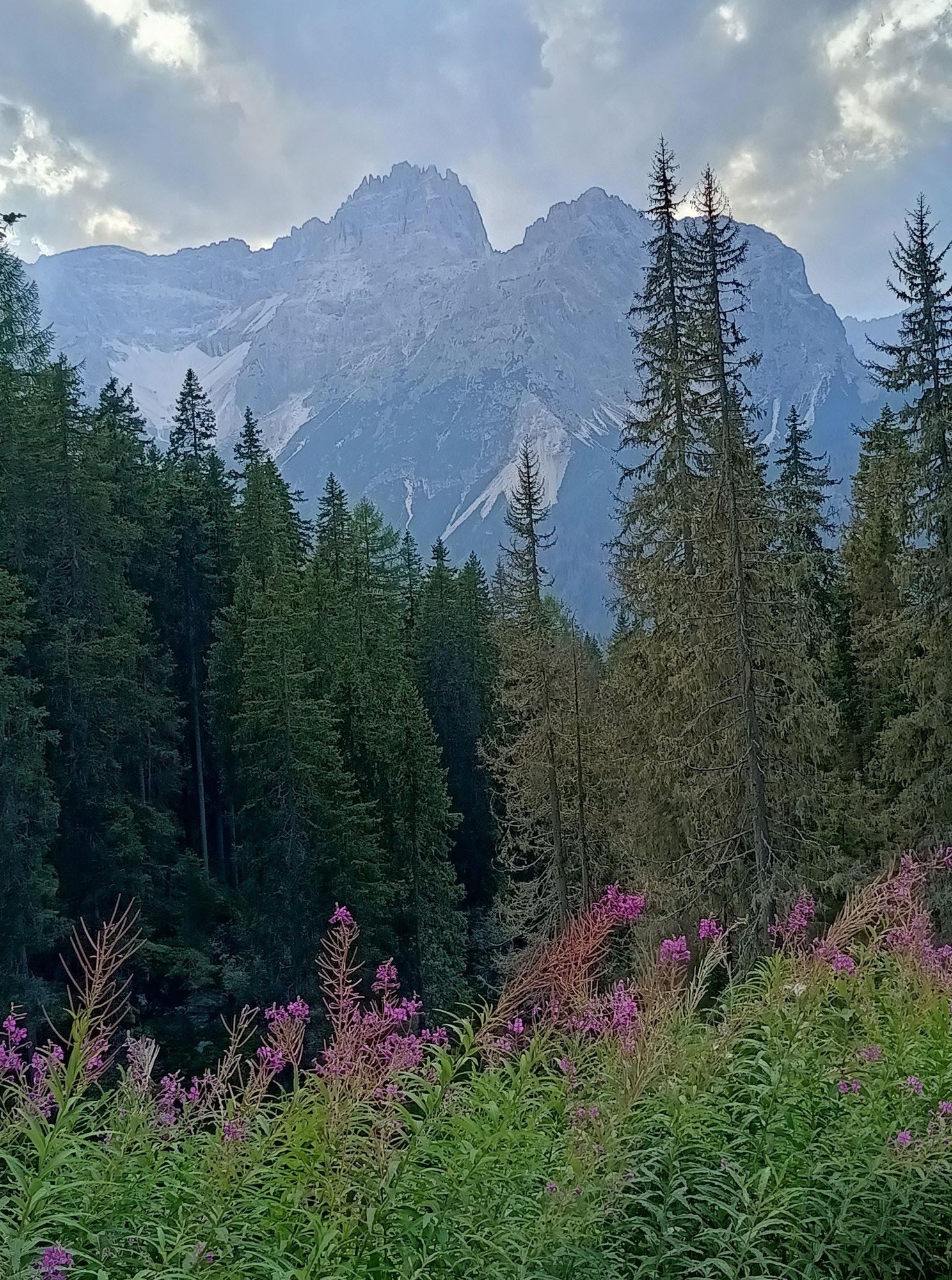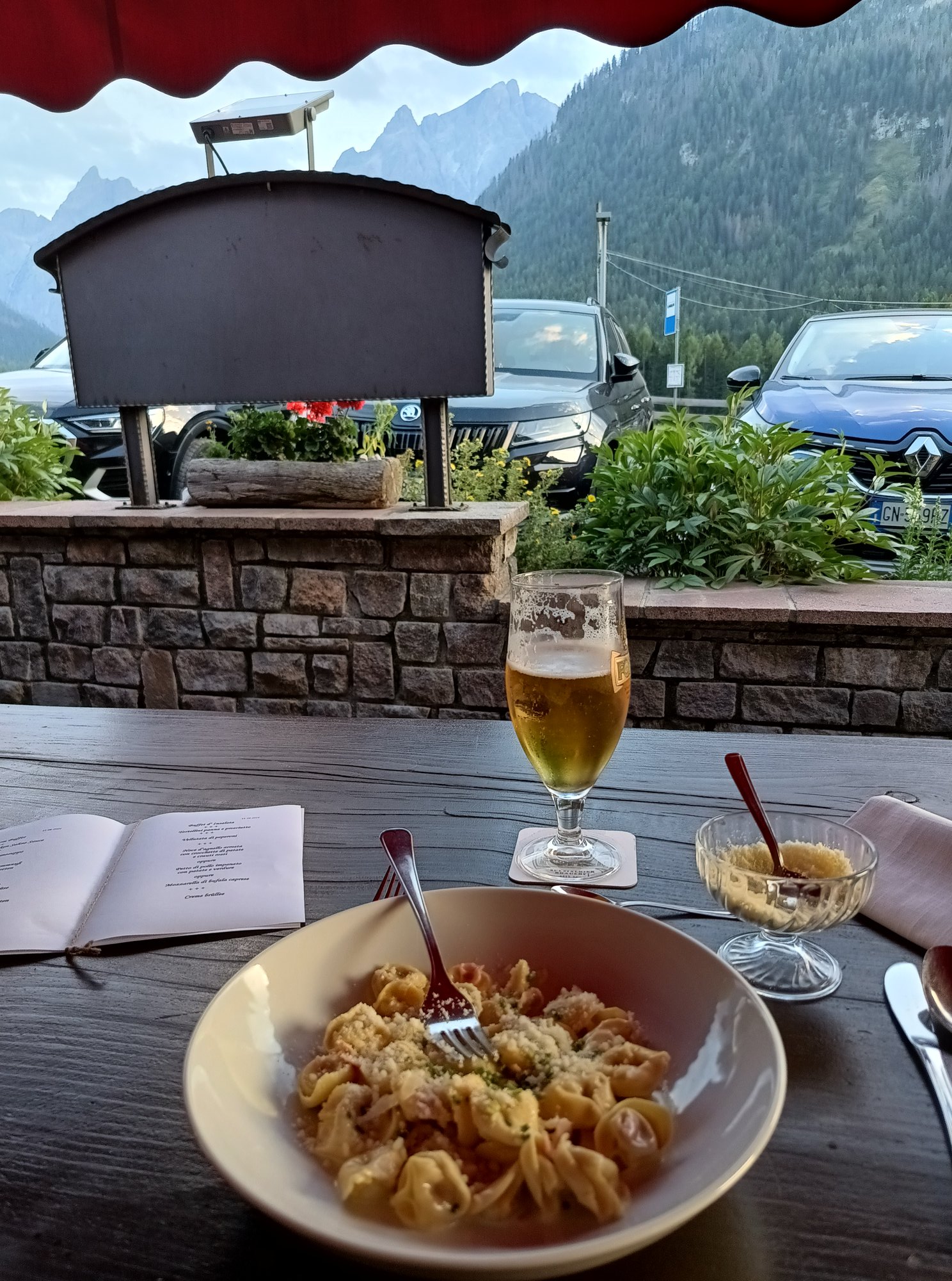 Finalement, alors que j’ai presque perdu espoir, me faisant à l’idée de devoir quitter la ville et planter la tente dans la forêt, je trouve au bout de la rue principale un hôtel « normal », qui ô miracle a encore des chambres simples libres. Pas donné évidemment mais après 8 jours de marche je crois que c’est mérité. C’est sans vergogne que le soir venu je m’empiffre en prenant absolument tous les plats inclus dans la demi-pension, tout en profitant de la vue sur les Tre Cime, entrée vers la suite de mon aventure. Mais qui seront le sujet d’une autre histoire….