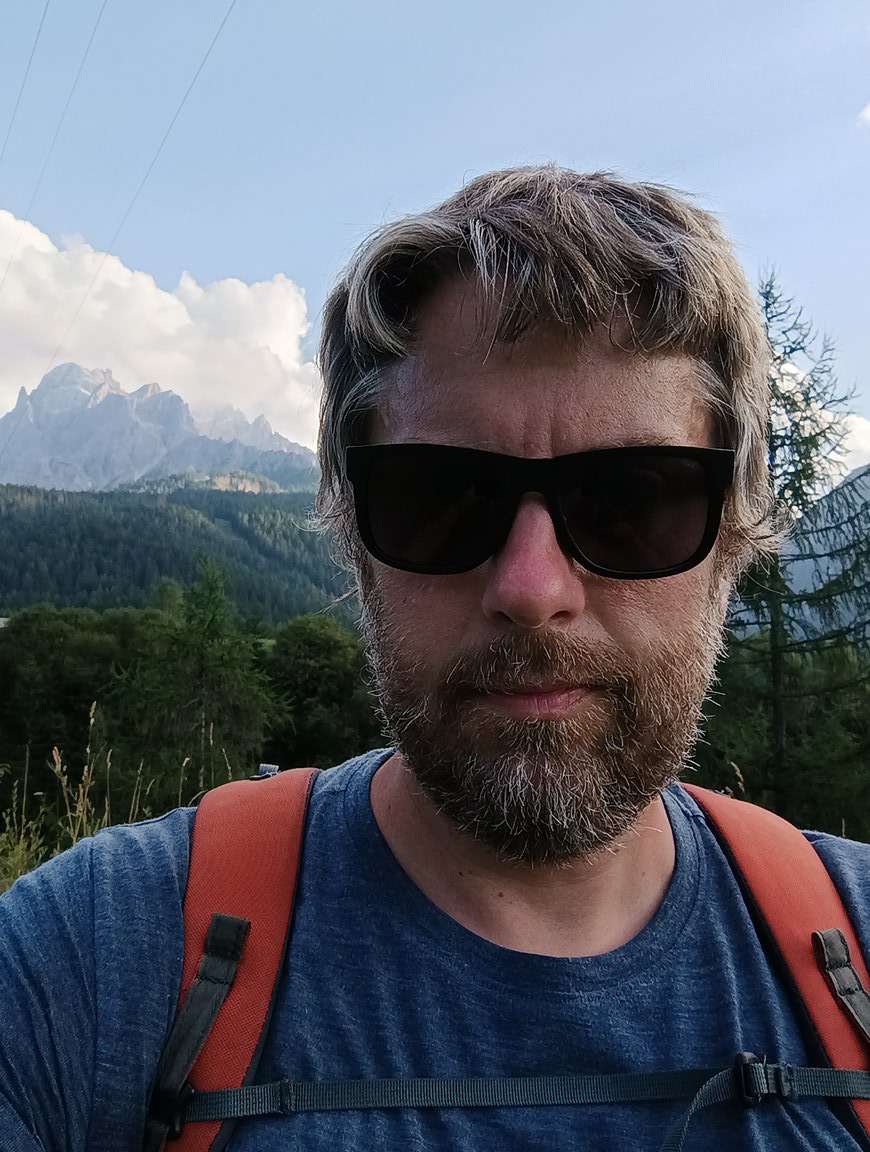Il me faudra encore traverser une forêt et 1h15 de marche pour enfin rallier les faubourgs de Moso. Je prends le selfie qui immortalise mon arrivée, et me met à la recherche d’un logement. Cela se révèle plus ardu que prévu, bien davantage que dans les montagnes. Je me trouve dans un endroit aisé. Ca n’est pas Courchevel, mais c’est dans le genre, juste au pied des Dolomites et dans le très riche sud Tyrol. Résidences privées, pensions de luxe au check-in automatisé…l’hôtel principal du centre est fermé et il n’y a rien pour le visiteur de passage sans réservation. Je tourne pendant 30mn en ville et frappe à plusieurs portes sans succès. Sale comme je suis en débarquant en ces lieux raffinés, je me sens comme Jacquouille la Fripouille dans le château des Montmirail. Plus loin je remarque enfin une sorte de bar/fast food qui proposerait des chambres low cost, mais malheureusement tout est complet.