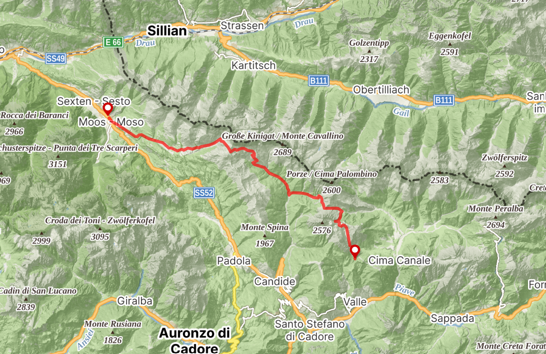 Le plein d’énergie et le moral regonflé après la journée d’hier, je repars avec la ferme intention de profiter des montagnes jusqu’au bout. Pour ma dernière étape je dessine un parcours qui me fait repasser sous la crête principale et franchir 3 cols au-dessus de 2000 mètres, avant de redescendre vers Sesto où je compte achever ma Via Alpina 2024.
