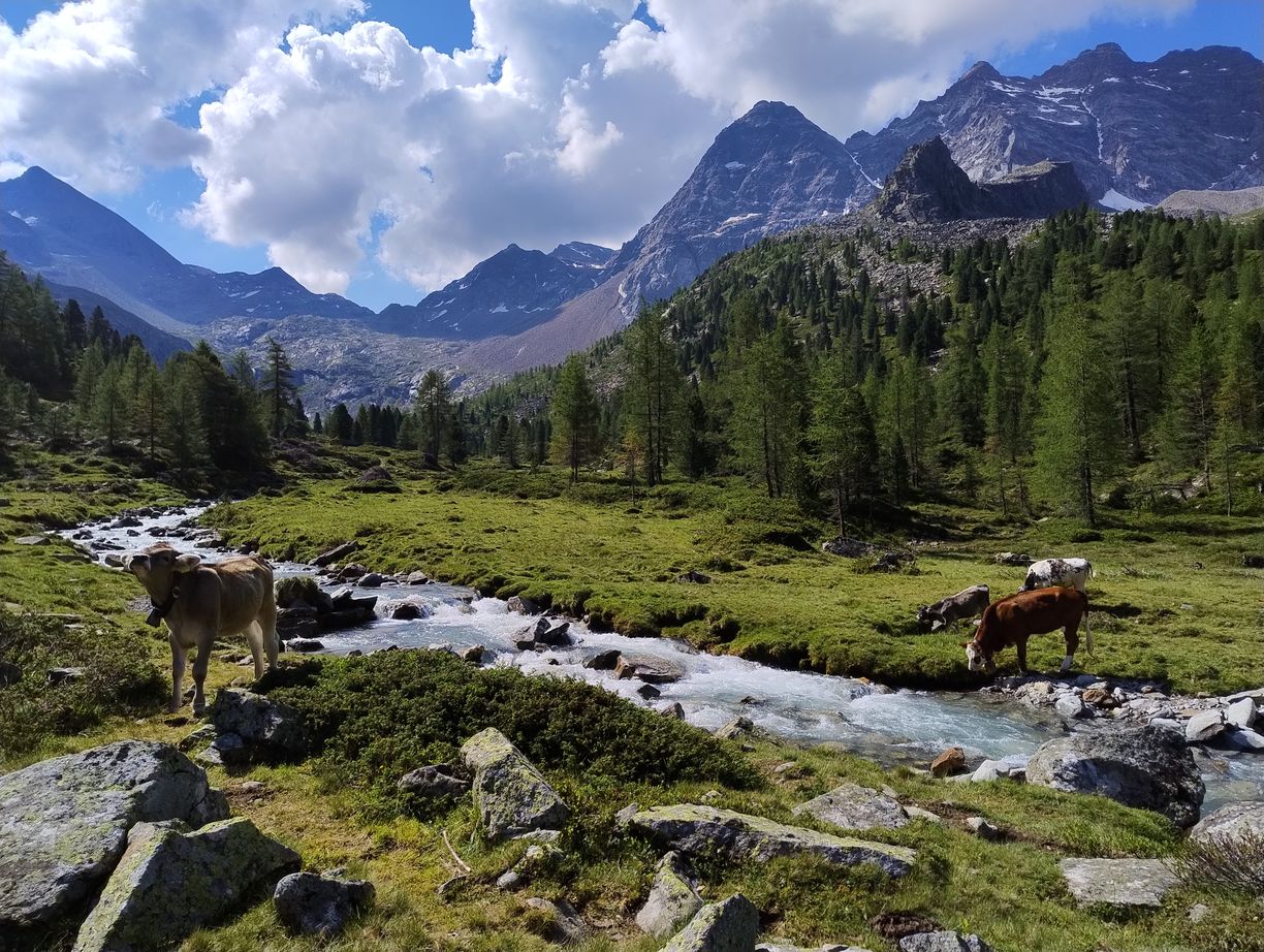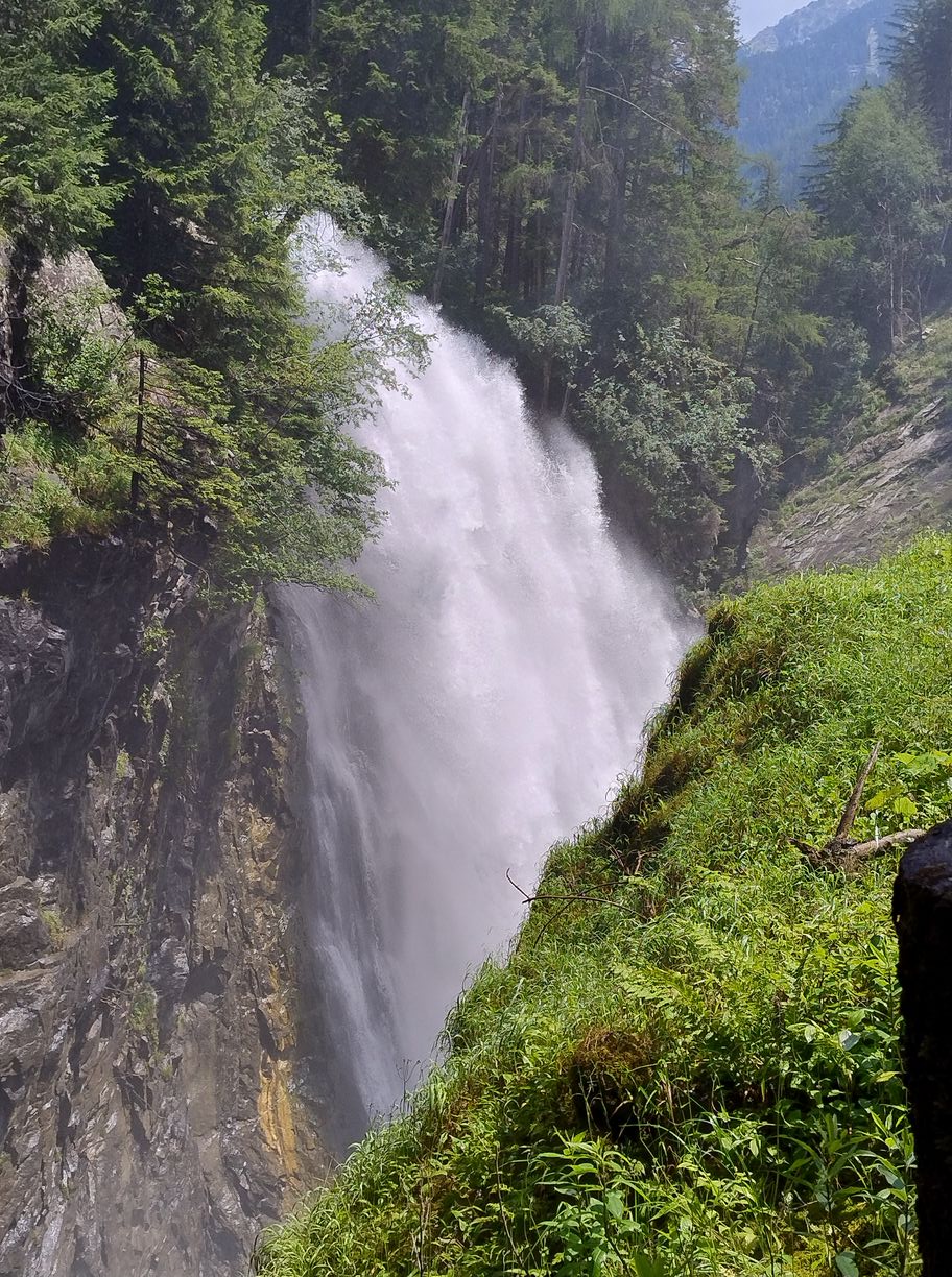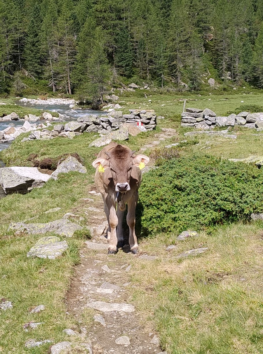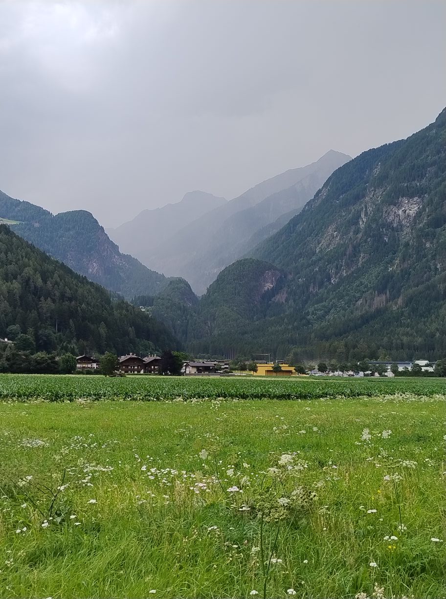 A 11h15 après un dernier évitement de bovins nous touchons enfin terre, c’est à dire que nous nous trouvons maintenant dans le (la?) Valle di Riva. Face à nous le bitume qui ne nous avait pas trop manqués. La voie officielle nous invite à remonter sur 3km vers le village de Rein in Taufers, pour emprunter un sentier qui repassera sur le flanc de la montagne qui nous fait actuellement face. C’est un sacré détour, dont l’intérêt peut être débattu, et motivé par la seule raison qu’il n’y a pas de chemin direct pour descendre vers Sand in Taufers (mais seulement une route). Lors de mes préparatifs je me suis longuement interrogé sur l’opportunité de passer par cette route, en empruntant également ça et là des chemins forestiers non balisés lorsque c’était possible. Le principal obstacle à ce plan étant un parapet couvert, sur près de 200 mètres, qui pourrait se révéler assez dangereux si des véhicules arrivaient d’en face. En scrutant Google Maps, j’avais tout de même eu l’impression qu’il y avait moyen de passer par en dessous (quitte a faire de la varape dans la rivière), ou par au-dessus, via un chemin de service destiné à l’entretien de l’ouvrage. Et puis, en lisant des récits d’autres « viaalpinistes », il apparaissait que certains avaient déjà tenté ce raccourci, en visiblement n’en étaient pas morts…