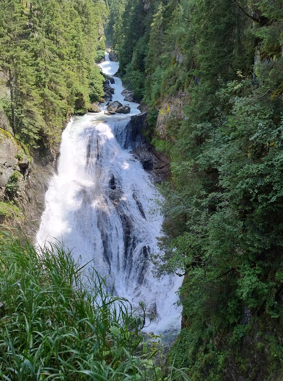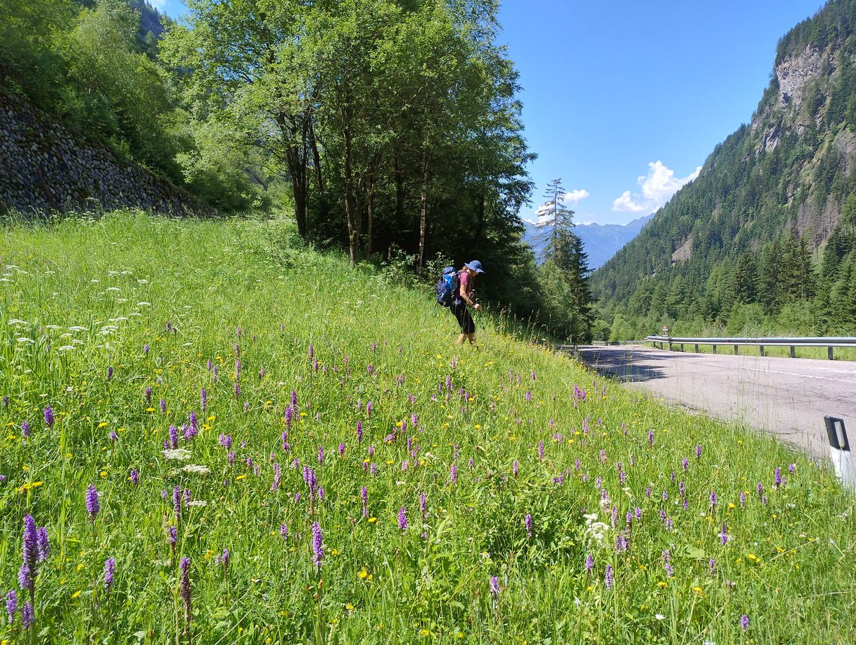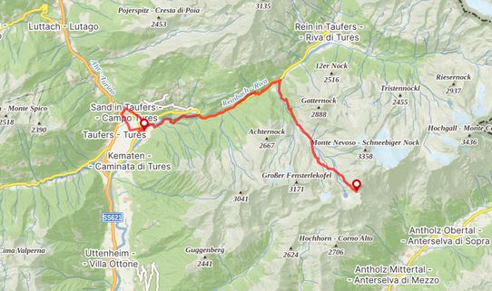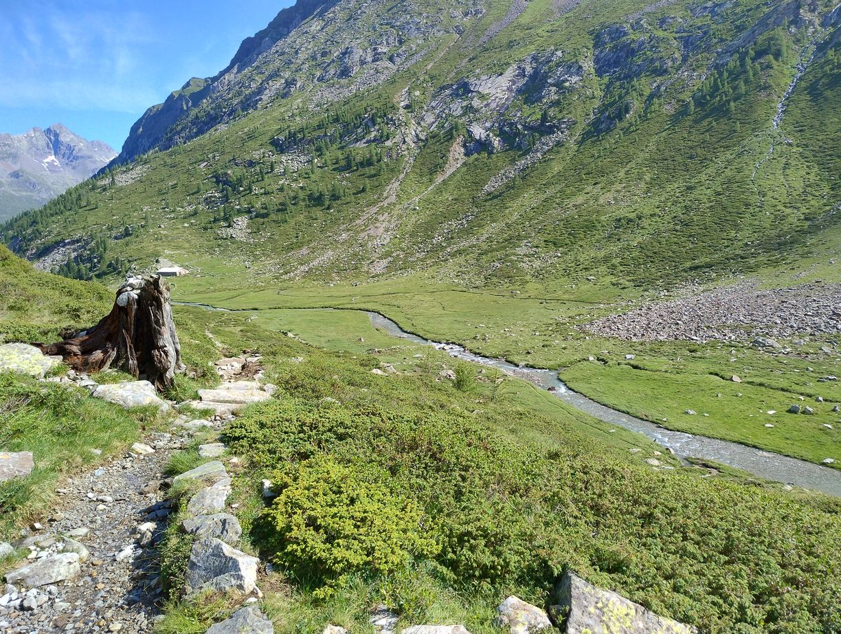 A 11h15 après un dernier évitement de bovins nous touchons enfin terre, c’est à dire que nous nous trouvons maintenant dans le (la?) Valle di Riva. Face à nous le bitume qui ne nous avait pas trop manqués. La voie officielle nous invite à remonter sur 3km vers le village de Rein in Taufers, pour emprunter un sentier qui repassera sur le flanc de la montagne qui nous fait actuellement face. C’est un sacré détour, dont l’intérêt peut être débattu, et motivé par la seule raison qu’il n’y a pas de chemin direct pour descendre vers Sand in Taufers (mais seulement une route). Lors de mes préparatifs je me suis longuement interrogé sur l’opportunité de passer par cette route, en empruntant également ça et là des chemins forestiers non balisés lorsque c’était possible. Le principal obstacle à ce plan étant un parapet couvert, sur près de 200 mètres, qui pourrait se révéler assez dangereux si des véhicules arrivaient d’en face. En scrutant Google Maps, j’avais tout de même eu l’impression qu’il y avait moyen de passer par en dessous (quitte a faire de la varape dans la rivière), ou par au-dessus, via un chemin de service destiné à l’entretien de l’ouvrage. Et puis, en lisant des récits d’autres « viaalpinistes », il apparaissait que certains avaient déjà tenté ce raccourci, en visiblement n’en étaient pas morts…