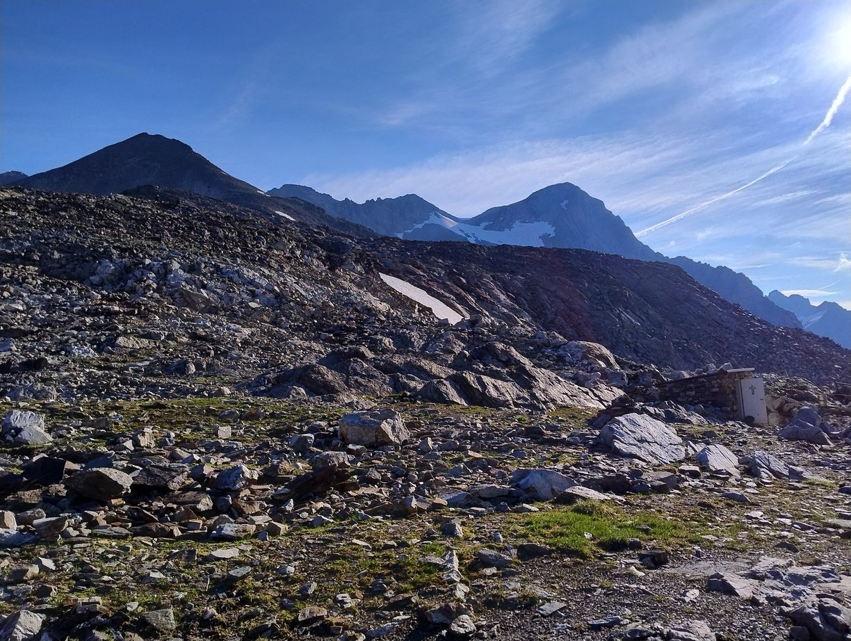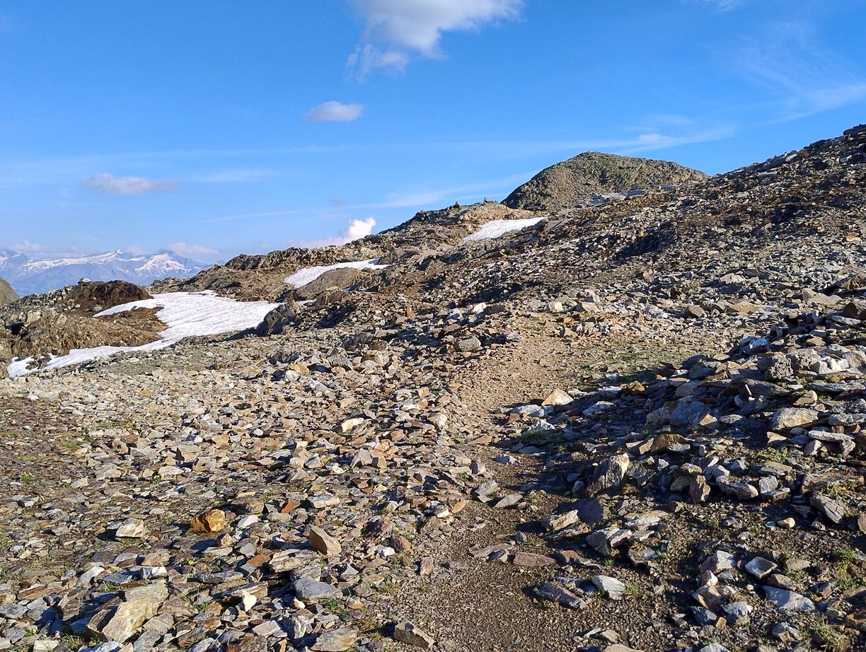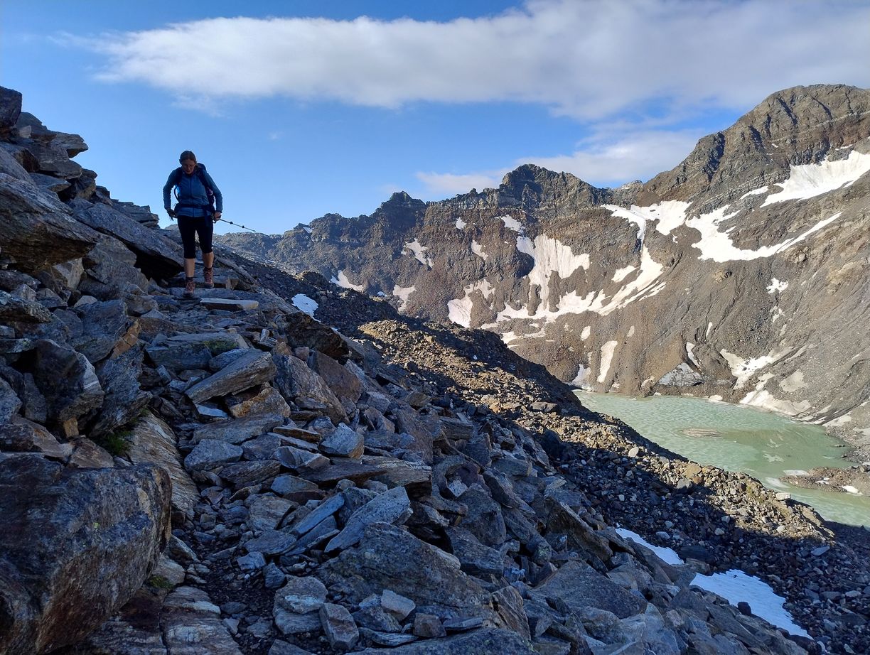 Cette demi-étape s’annonce évidemment plus facile que celle d’hier car seulement en descente, et avec moins de 20km pour rejoindre Taufers. Mais elle n’est peut-être pas si inoffensive qu’elle n’en a l’air : il y a tout de même 2000 mètres à descendre. Attention les genoux…L’autre particularité du jour, c’est que nous l’entamons avec une couche de vêtements supplémentaire : à cette altitude et au petit matin nous recontrons une fraicheur que nous n’avions pas connue depuis bien longtemps…Cela a le mérite de nous immerger encore davantage dans l’atmosphère glaciaire qui nous entoure. Les premiers hectomètres se font sur un vaste plateau tout de roches et de neige, que mon imagination a vite fait de placer quelque part dans l’Himalaya ou dans les Andes.