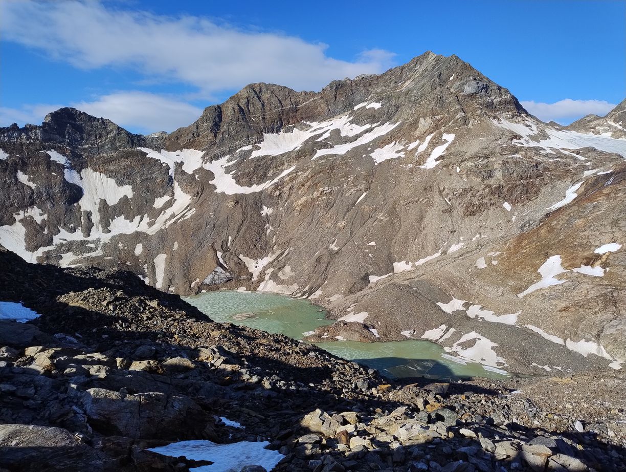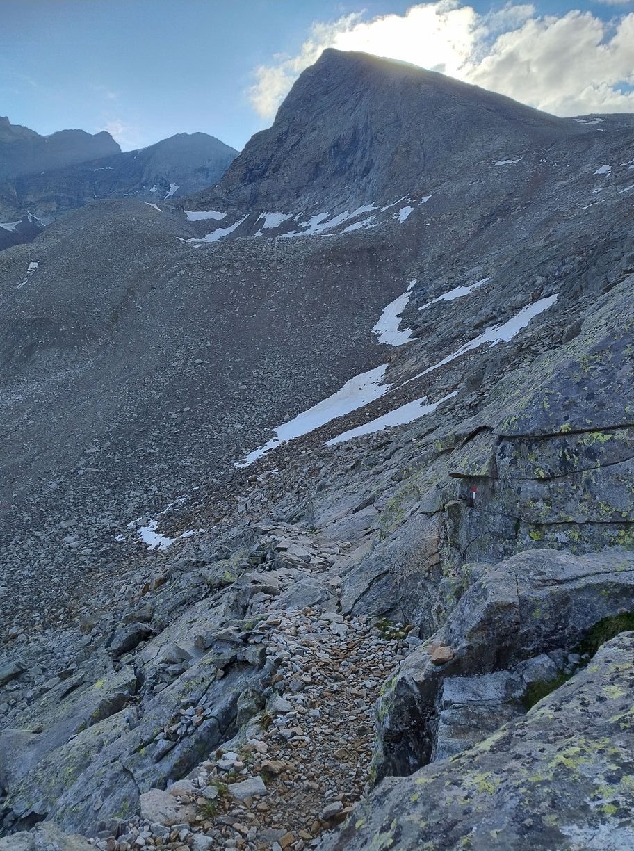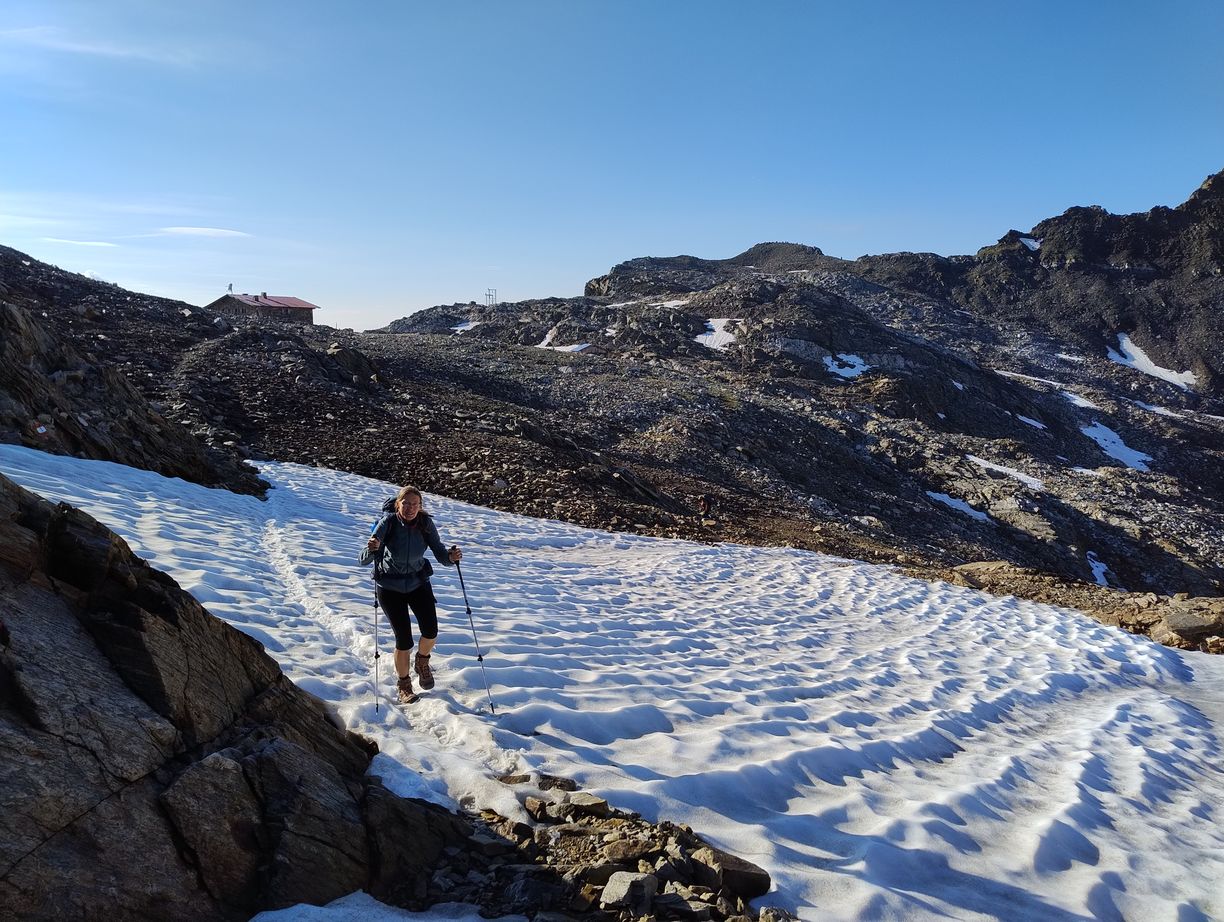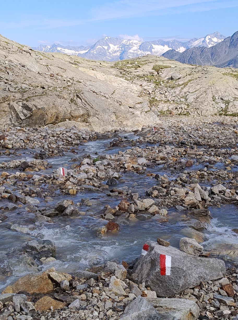 Cette demi-étape s’annonce évidemment plus facile que celle d’hier car seulement en descente, et avec moins de 20km pour rejoindre Taufers. Mais elle n’est peut-être pas si inoffensive qu’elle n’en a l’air : il y a tout de même 2000 mètres à descendre. Attention les genoux…L’autre particularité du jour, c’est que nous l’entamons avec une couche de vêtements supplémentaire : à cette altitude et au petit matin nous recontrons une fraicheur que nous n’avions pas connue depuis bien longtemps…Cela a le mérite de nous immerger encore davantage dans l’atmosphère glaciaire qui nous entoure. Les premiers hectomètres se font sur un vaste plateau tout de roches et de neige, que mon imagination a vite fait de placer quelque part dans l’Himalaya ou dans les Andes.