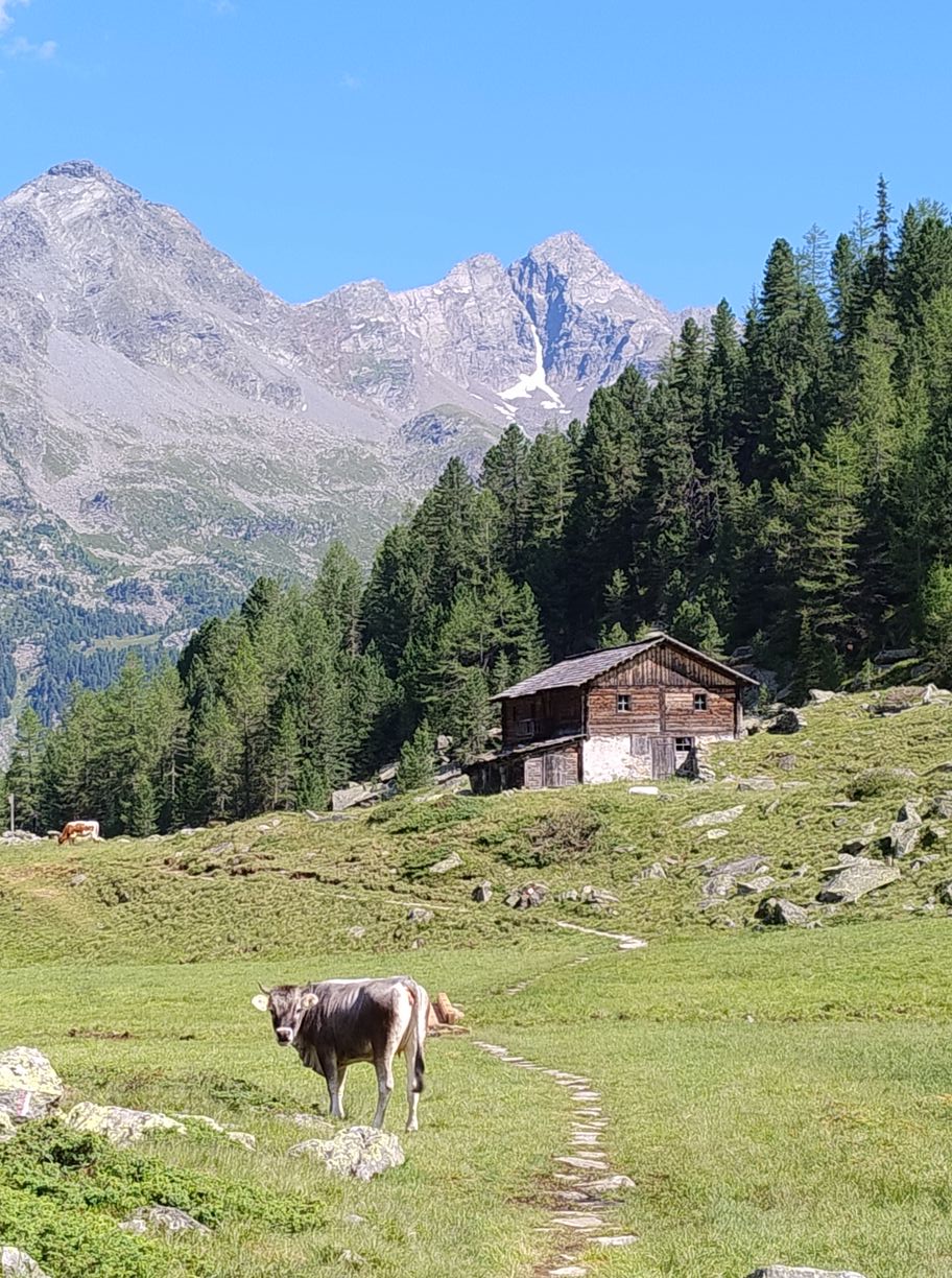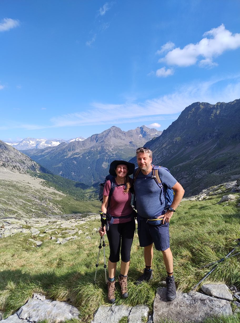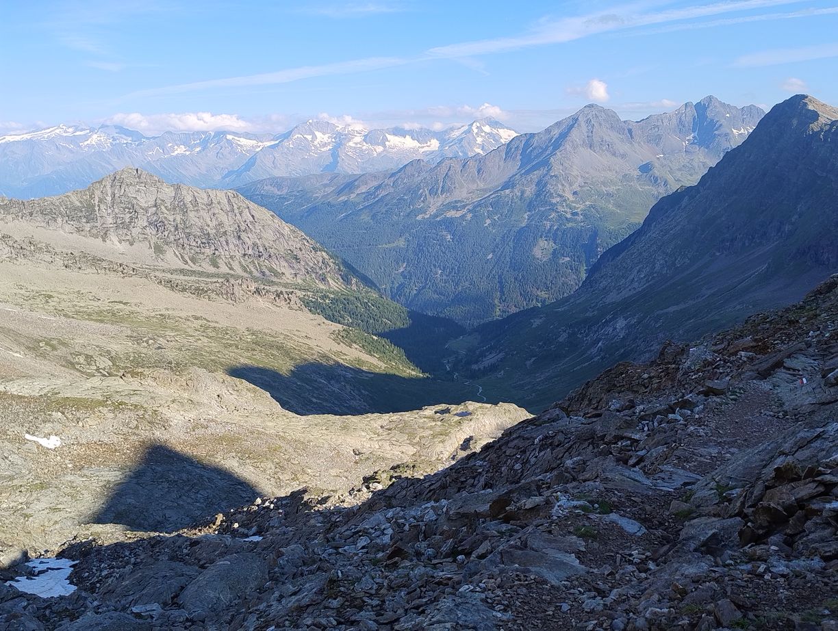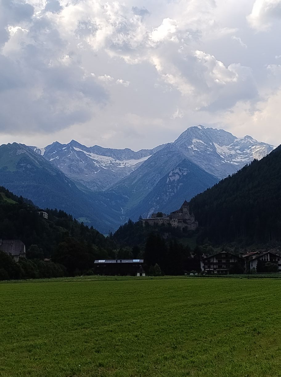 Au matin comme souvent après l’orage c’est un grand ciel bleu, et les conditions sont parfaites pour une journée “plaisir” . En effet suivant la même pratique que les années précédentes, j’ai tracé deux demi-étapes en guise de journée de repos : mon temps étant assez limité , je n’ai pas le luxe de faire des journées « 0 ». Il l’est d’ailleurs encore davantage cette année, puisque je n’ai que 7 jours devant moi, ou au maximum 8, car je dois retrouver ma petite famille au plus tard dimanche pour la suite des vacances. C’est également pour cette raison que Zuzana doit terminer ce soir, afin de rejoindre les enfants qui sont avec les grands-parents, tandis que je continuerai seul encore un bout. Cela nous impose de finir l’étape dans la vallée, à Taufers, ou elle pourra demain attraper un bus vers la gare la plus proche.