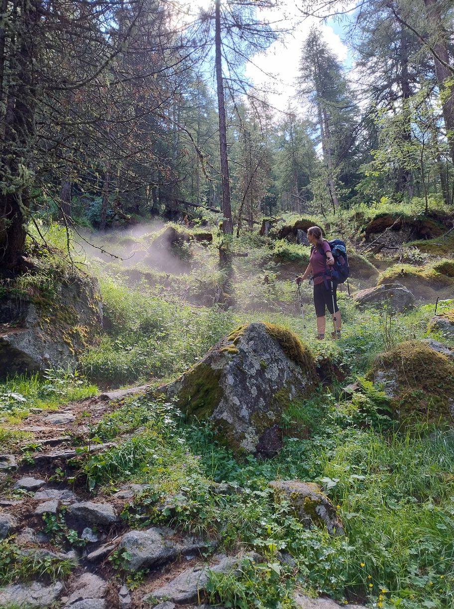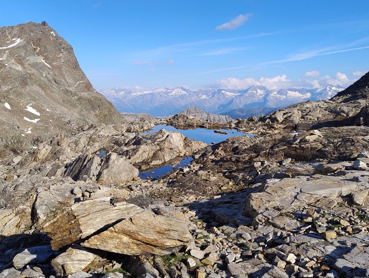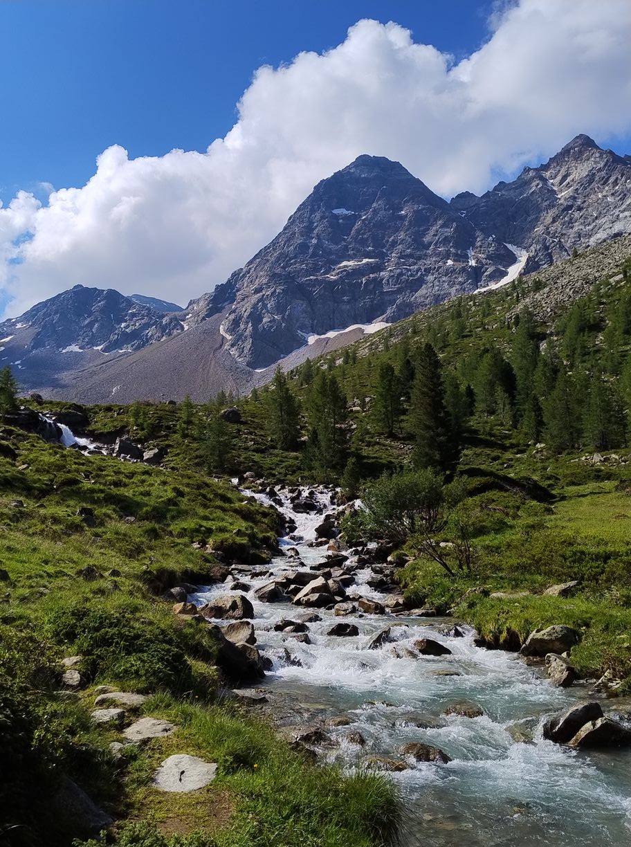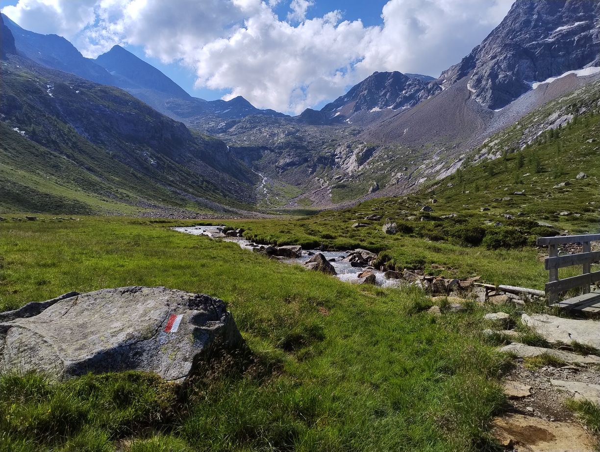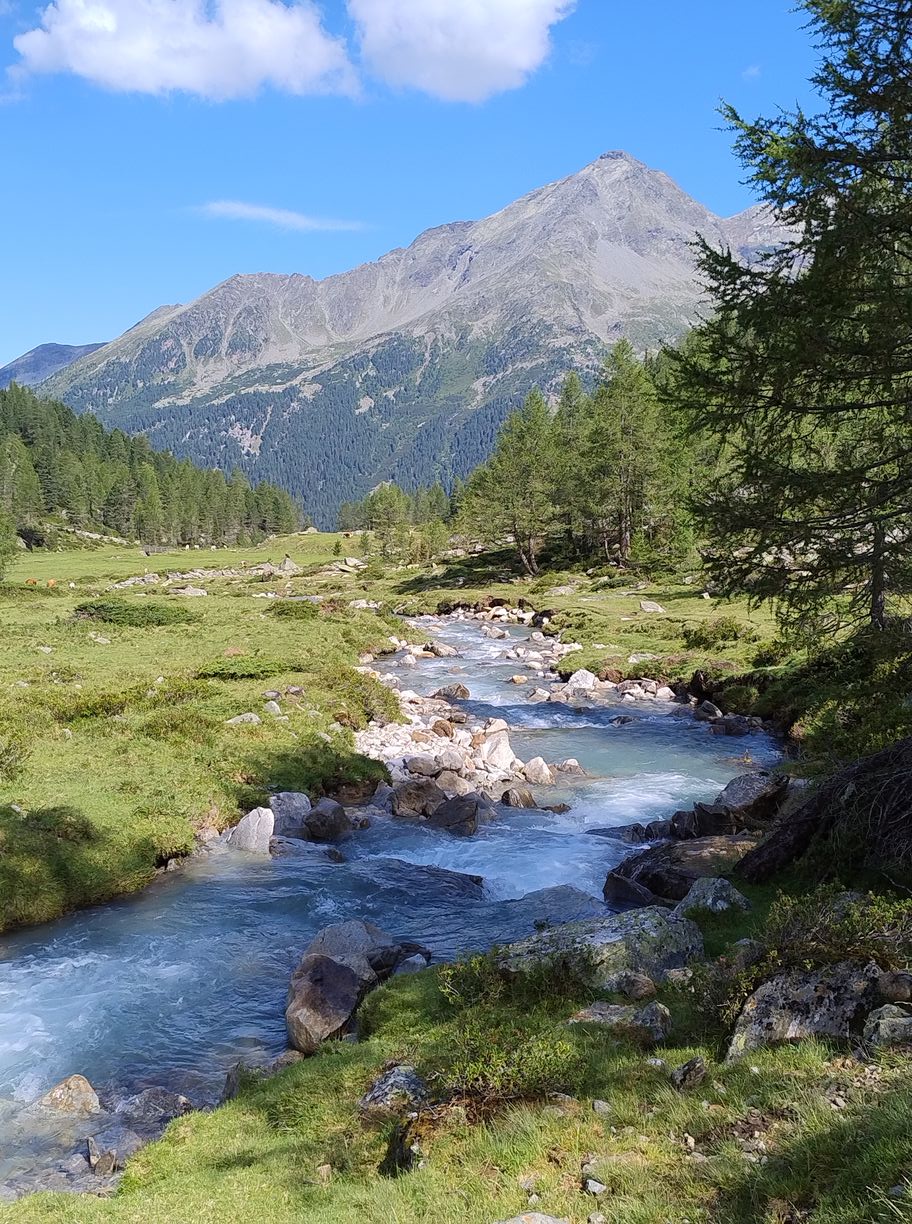 Au matin comme souvent après l’orage c’est un grand ciel bleu, et les conditions sont parfaites pour une journée “plaisir” . En effet suivant la même pratique que les années précédentes, j’ai tracé deux demi-étapes en guise de journée de repos : mon temps étant assez limité , je n’ai pas le luxe de faire des journées « 0 ». Il l’est d’ailleurs encore davantage cette année, puisque je n’ai que 7 jours devant moi, ou au maximum 8, car je dois retrouver ma petite famille au plus tard dimanche pour la suite des vacances. C’est également pour cette raison que Zuzana doit terminer ce soir, afin de rejoindre les enfants qui sont avec les grands-parents, tandis que je continuerai seul encore un bout. Cela nous impose de finir l’étape dans la vallée, à Taufers, ou elle pourra demain attraper un bus vers la gare la plus proche.