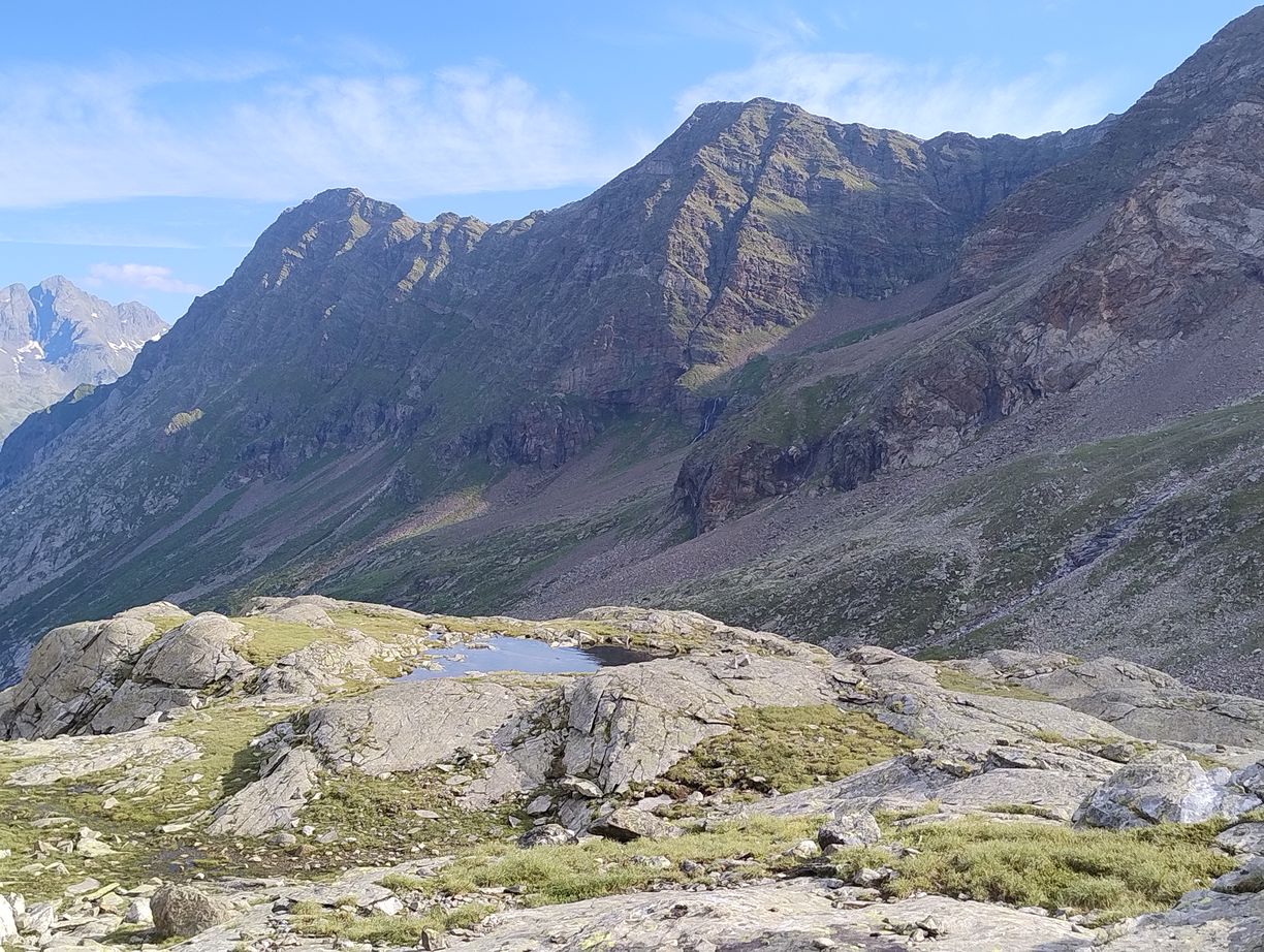 Une heure après notre départ et environ 500 mètres plus bas, nous quittons peu à peu l’étage minéral et surplombons alors une large vallée, qui coche toutes les cases de l’idyllique plateau de montagne : c’est vert, et au milieu coule une rivière. Nous aurons besoin d’encore une petite heure, et passer quelques autres ruisseaux et cascades, pour finalement y poser le pied et s’émerveiller du décor.