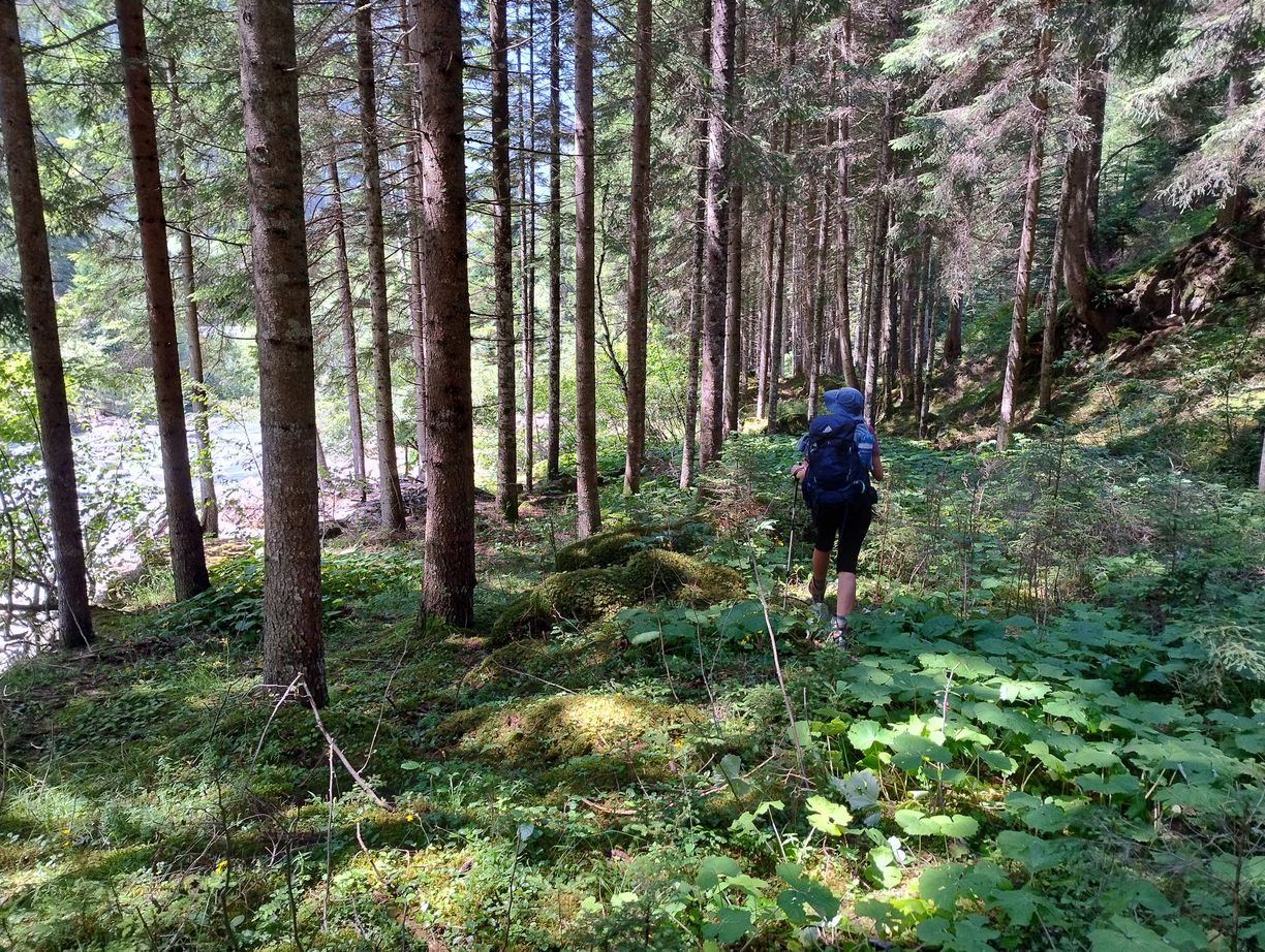 Nous nous lançons donc sur l’asphalte, 800 mètres de marche nous emmènent devant le demi-tunnel et ici il faut se rendre à l’évidence : le contour du haut nous est interdit par une végétation luxuriante, quant à s’aventurer vers le bas, ça semble un peu trop pentu et tout aussi confus. Tant pis, nous nous jetterons dans l’antre de la bête, au moins, la circulation est modérée… Pour ne pas s’éterniser dans ce passage à faible visibilité nous allons au pas de course. En sprintant sur la route avec le sac sur le dos me vient alors cette image des candidats d’émissions de télé-réalité du type Carte au Trésor ou Pekin Express. Personne ne nous prendra en stop pour nous faire gagner les 10 000 euros, et sortant du parapet nous rejoignons rapidement une piste forestière bien plus sereine. Une paix cependant rapidement troublée par des bûcherons, qui un plus loin ont complétement condamné le chemin d’un énorme tas de bois, derrière lequel s’affaire un engin effrayant. Il n’y a même pas un demi-mètre d’espace pour passer à côté, aussi devons-nous bifurquer vers le bord de la rivière en désescaladant un talus pour continuer à travers bois. A peine avons-nous récupéré la piste que celle-ci se termine devant l’entrée d’une carrière. Un panneau d’interdiction aux piétons étrangement dressé en cet endroit, laisse à penser que d’autres avant nous ont tenté le raccourci au milieu des camions-benne, et que ça s’est vu…Pas d’autre choix que de retourner sur la route, mais de toute façons il ne reste plus long à faire de cette section déplaisante, mais nécessaire.