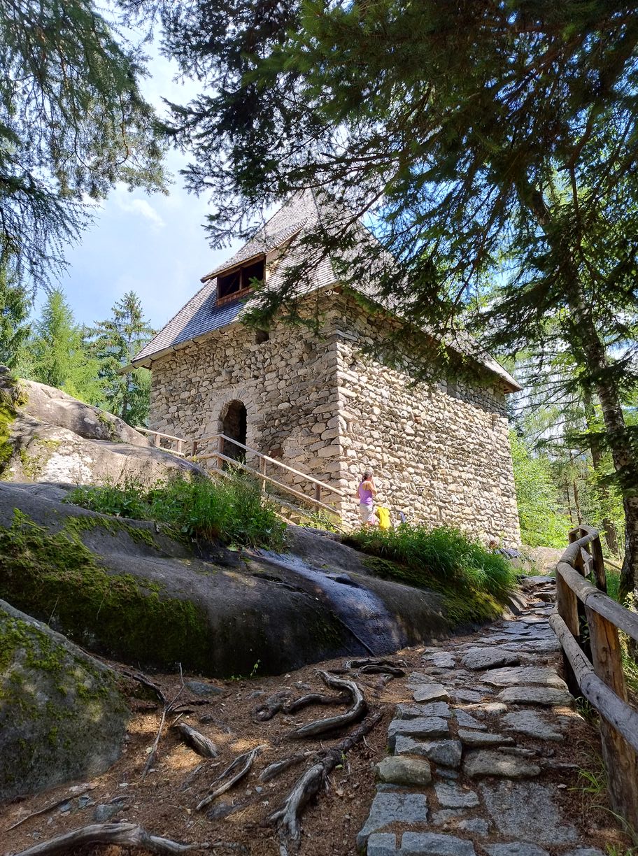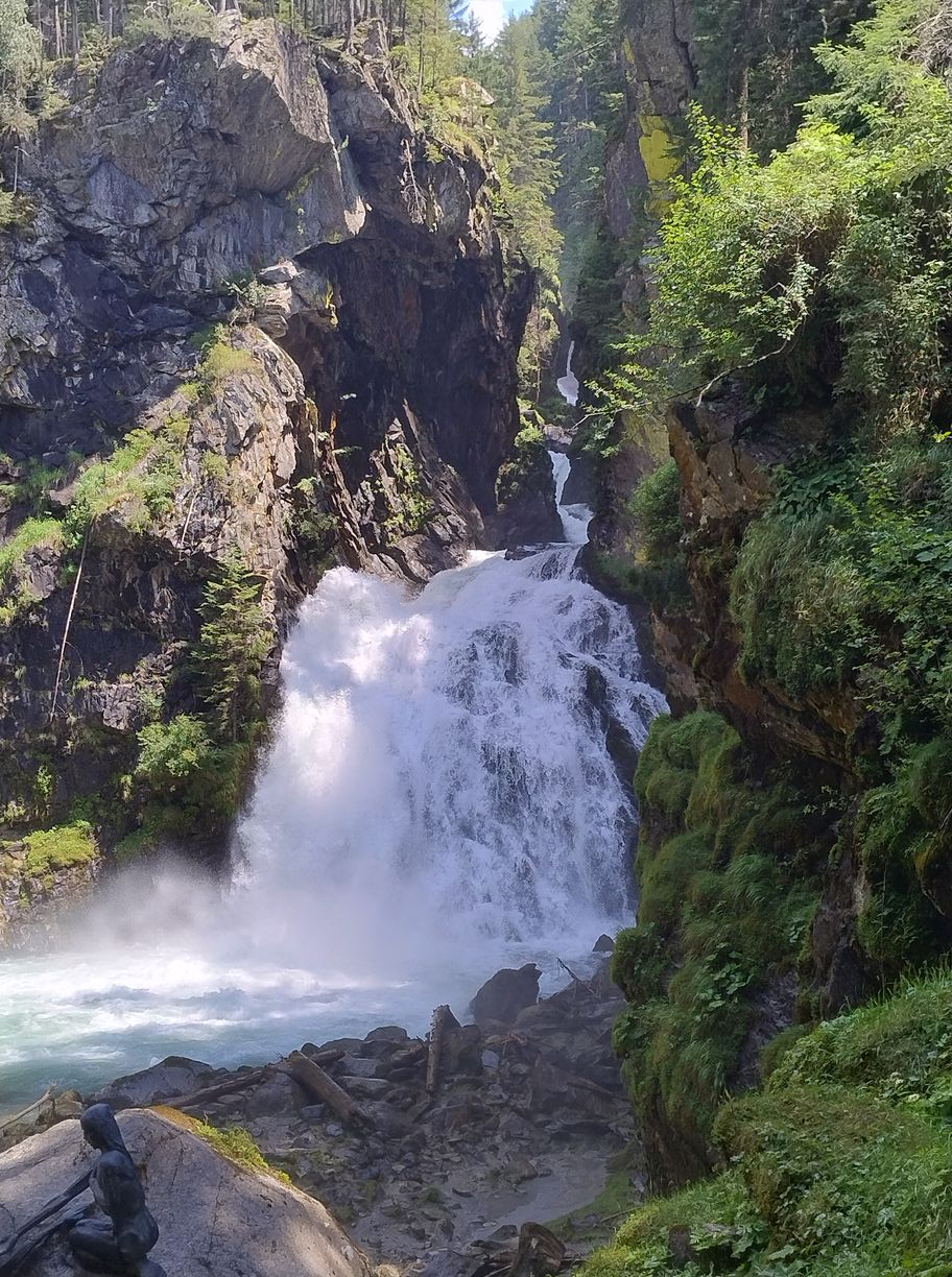 Et en effet à peine 2 petits kilomètres plus loin nous faisons nos adieux à l’asphalte, entrant sur un parking en amont du « sentier des cascades de Riva ». J’avais repéré ces gorges sur la cartographie comme un probable point d’intérêt, mais sans me renseigner davantage sur le sujet. Aussi la surprise est grande de trouver une telle agitation, il y a ici beaucoup de monde de tous âges et horizons. N’ayant croisé que de rares randonneurs depuis le matin, c’est un choc de passer d’un extrême à l’autre, mais c’est souvent ainsi à la montagne où la foule se concentre vers les attractions les plus « accessibles ». Nous grimpons d’abord une éminence, site d’un ancien château dont aujourd’hui il ne reste que la chapelle joliment restaurée. Puis nous plongeons vers le défilé pour atteindre la première des cascades. On s’y bouscule devant pour obtenir le meilleur point de vue, mais on n’y reste pas longtemps : le débit est tel qu’à 30 mètres de distance on se fait arroser ! Comme un petit air d’Islande…Les plus organisés ont amené les k-way, les plus théâtraux en sont presque à enfiler le ciré jaune. Cela me fait un peu sourire sur l’instant, car j’ai le sentiment que l’objectif derrière ces accoutrements est davantage de dramatiser la photo à partager sur les réseaux sociaux qu’autre chose. Pour ma part, je trouve les gouttelettes plutôt rafraichissantes et salutaires, car nous ne sommes plus qu’à 1000m d’altitude et les 30 °C ne sont pas loin. Toujours aussi allergique à la surfréquentation, je ne traîne pas sur les lieux et nous continuons sur un sentier ombragé qui nous mène à une seconde, puis une troisième cascade. Cette dernière est tout aussi jolie que la première , pour les amateurs de sensations fortes il est aussi possible de l’atteindre par un parcours « aventure » en tyrolienne qui passe au-dessus des gorges: je m’en passe bien volontiers…