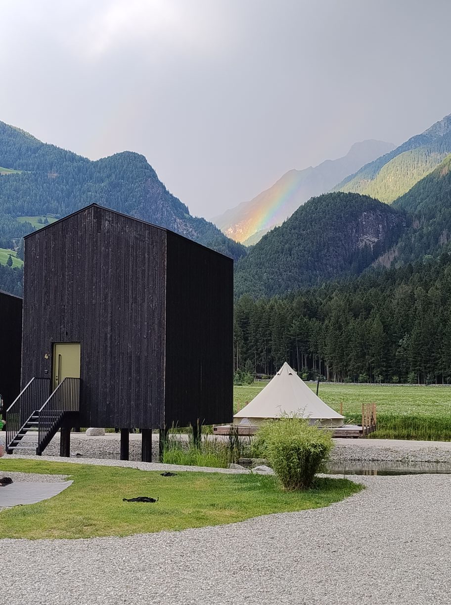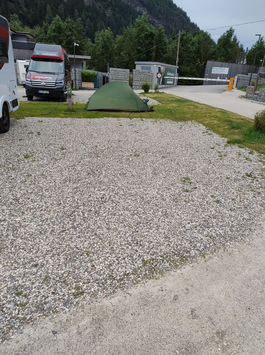 L’esprit est plutôt à la pause, car mine de rien ça fait un petit moment que nous en sommes en route, et après avoir descendu 2000 mètres on ne serait pas contre se poser 5 minutes à une buvette. Malheureusement rien de cela ici, et si plus loin nous découvrons bien un snack, celui-ci est bondé et nous préférons filer jusqu’au camping de Taufers qui n’est plus qu’à un jet, histoire de poser les affaires d’abord. Nous l’atteignons à 13h30, et l’endroit ne me fait pas forte impression : en sortie de village au bord de la route, pas un arbre, déco modernes du type bassin artificiel (alors qu’on est à la montagne et que le torrent coule juste à côté…), logements « insolites » qui font plutôt penser à des containers, et lorsque qu’il nous faut traverser le restaurant/bar pour se présenter à la réception, j’ai un tantinet l’impression de me trouver dans le lounge d’un aéroport. Ils appellent ça pompeusement « glamping », certainement pour donner un cachet nordique suivant la mode du moment, mais l’ensemble ressemble davantage à un parking pour camping-cars qu’à un spot nature sous les Fjords. Aussi sommes-nous un peu inquiets au moment de quémander un emplacement tente, inquiétude confirmée quand nous nous rendons à l’endroit désigné : la zone est entièrement gravillonnée, et seule une maigre bande de pelouse la sépare de l’emplacement qui lui fait face. S’en suit reconfirmation à la réception que c’est le bon endroit, puis appel du manager, qui dit qu’il ne voit pas le problème et que nous n’avons qu’à nous mettre sur la bande de pelouse, ah bon très bien…Alors que l’idée d’aller voir ailleurs nous traverse sérieusement l’esprit, nous nous ravisons car le camping est proche de l’arrêt de bus que Zuzana doit rejoindre très tôt demain matin, et ça n’est que pour une nuit après tout. Nous les prenons donc au mot et nous installons hors emplacement sur la pelouse, 55 euros pour poser sa tente sur un parking c’est aussi ça le Tyrol du sud ! Au moins, il y aura la douche, et par cette chaleur c’est fort appréciable.